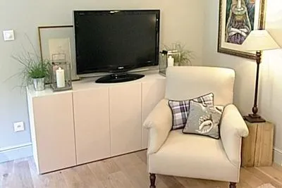 Распашные фасады тумбы изготовлены в декоре «Крем» и снабжены механизмом Push-to-open - достаточно лишь слегка нажать на дверь для ее открывания или закрывания. Такая система позволяет отказаться от дверных ручек, что придает мебели более элегантный вид.