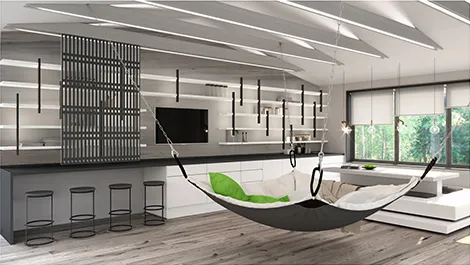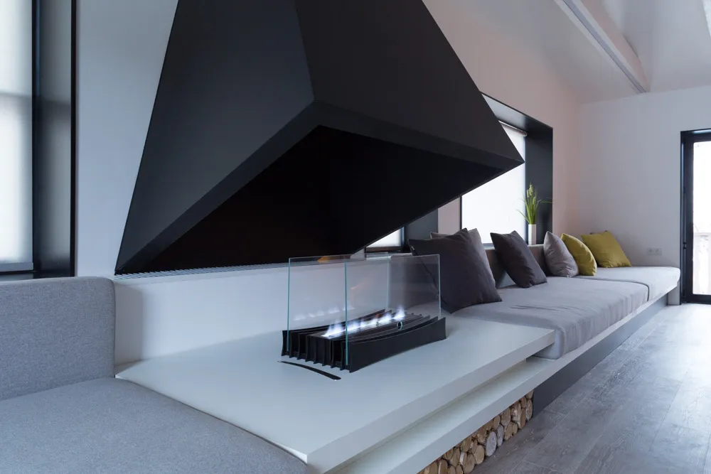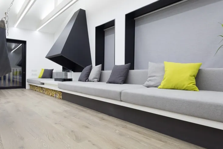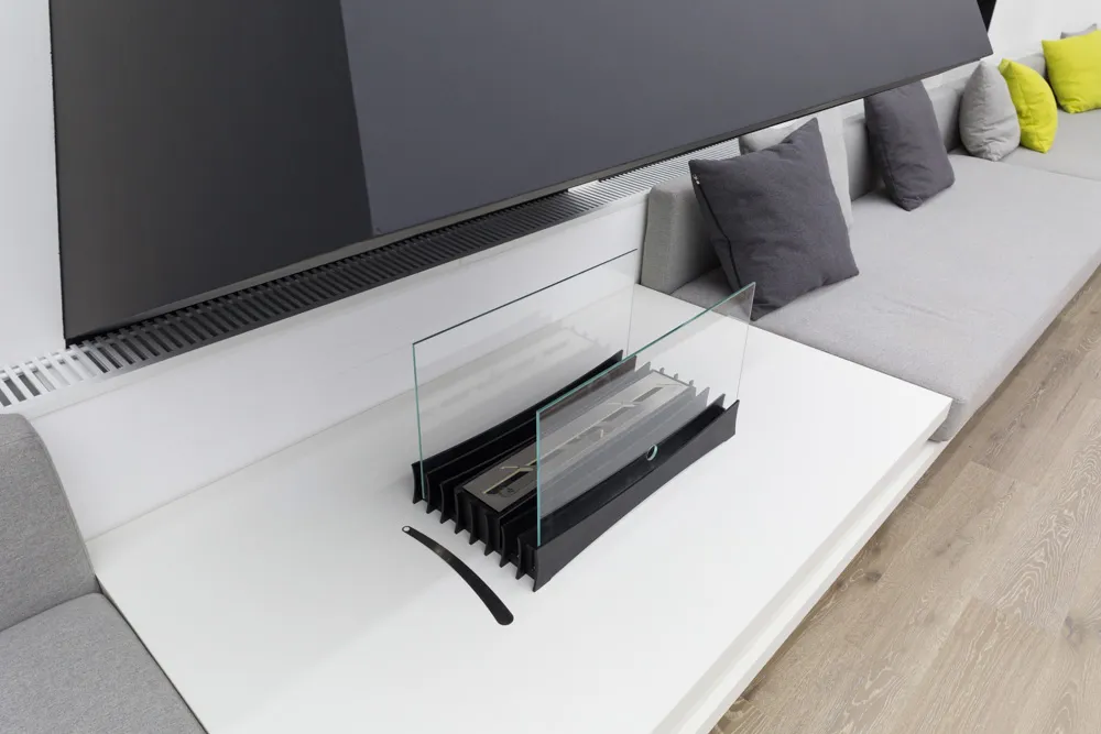 Выполнена из ДСП двух цветов - Алебастр и Графит. Основание подиума и камина выполнено из плиты Тамбурато. Это композит из ДСП 8 мм с сотовым наполнением внутри – при толщине 60 мм обладает лёгкостью и прочностью. В нижней части подиума организованы ниши для хранения дров, выполняющих декоративную функцию, т.к. камин работает на биотопливе.
