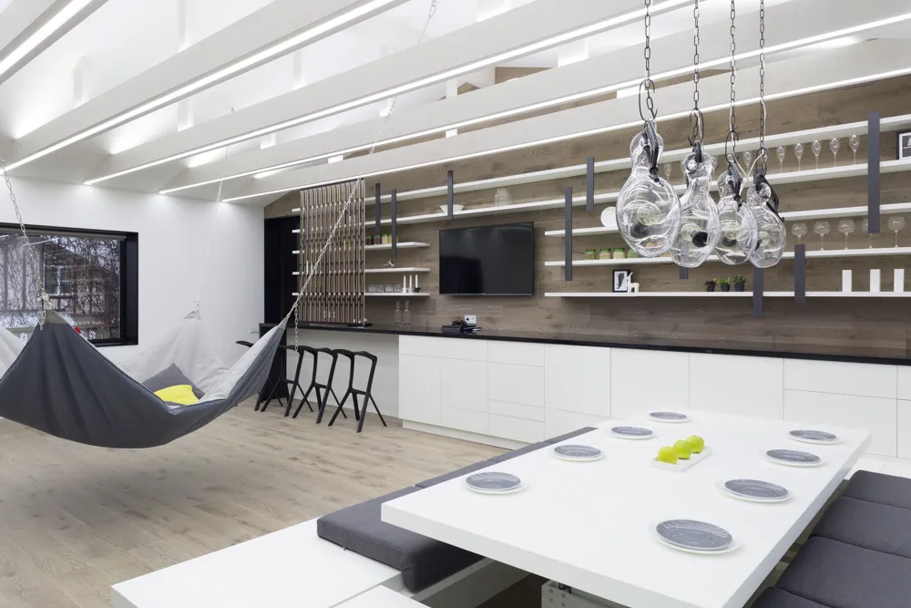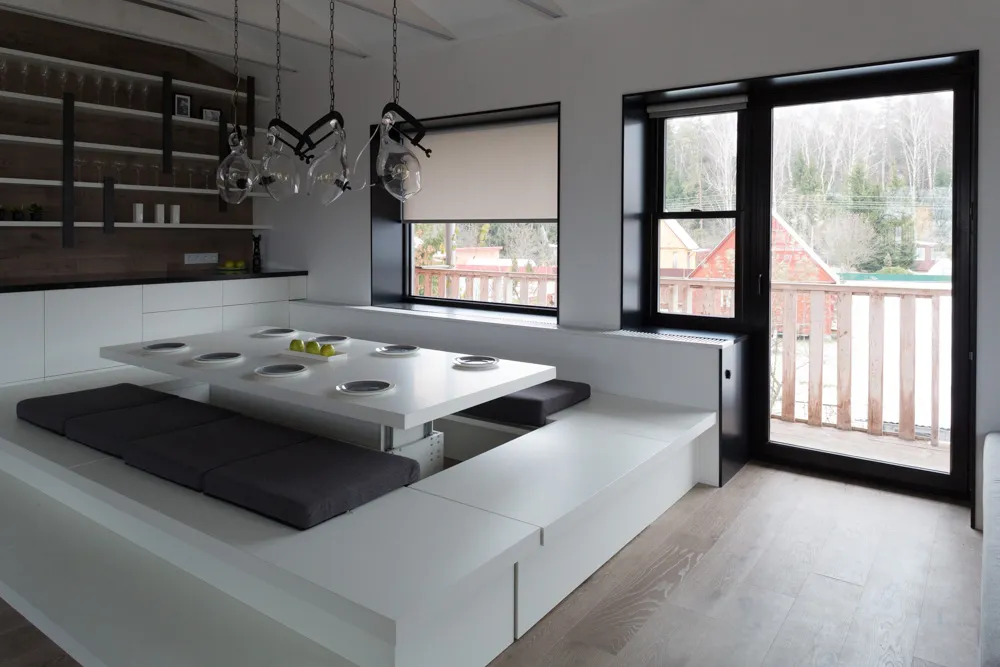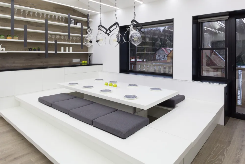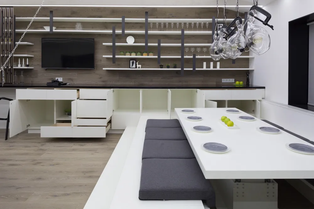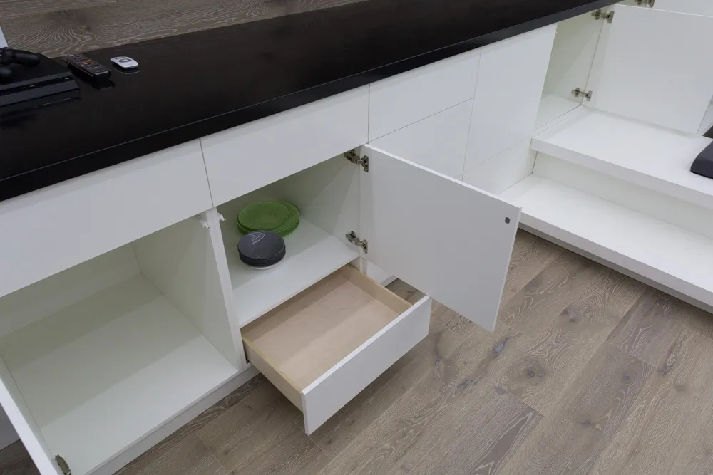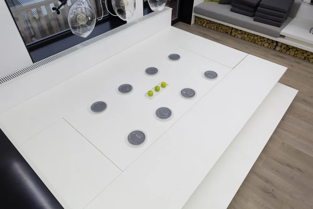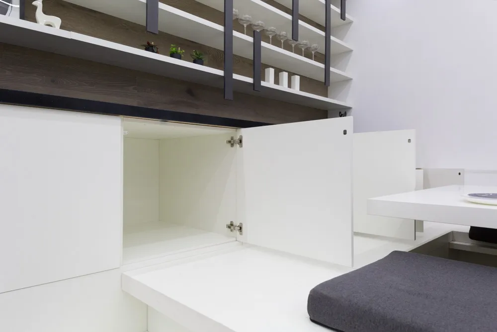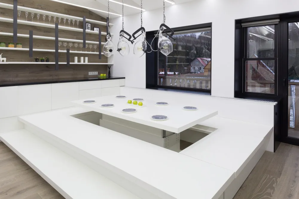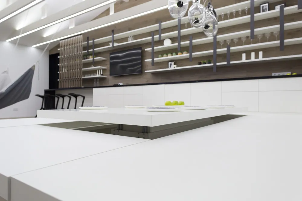 Подиум обеденного стола так же изготовлен в цвете Алебастр. Основание - 60 мм. Это Тамбурато, из двух плит ДСП 8 мм с сотовым наполнением внутри (между ними). Стол выдвигается вверх из подиума. Подъёмный механизм с электроприводом изготовлен сторонними поставщиками.