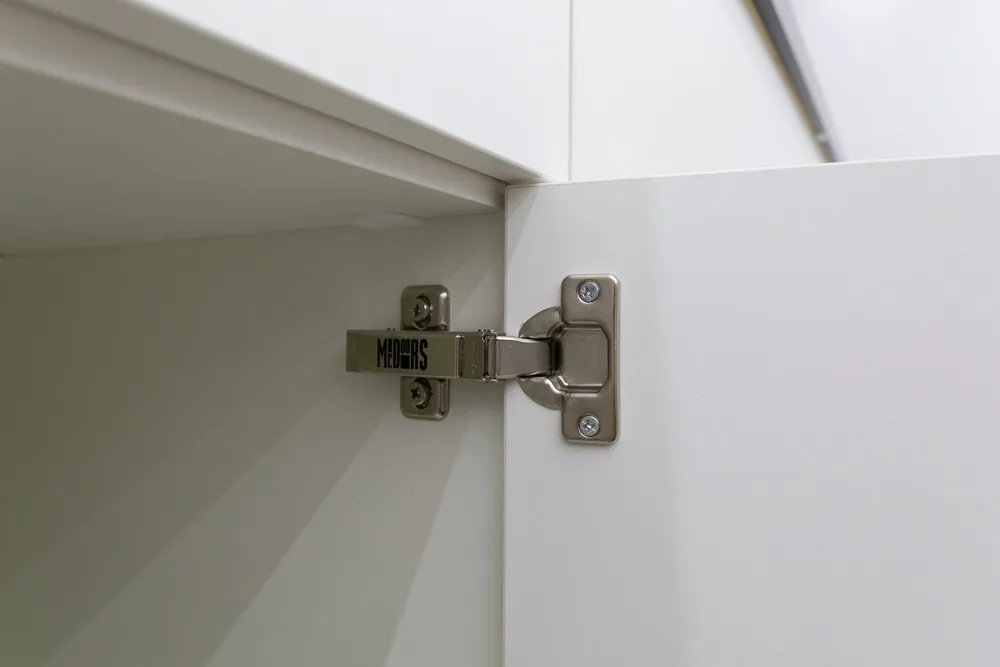 Выполнена из ДСП в цвете Алебастр. Фасады и передние панели ящиков - ДСП 16 мм Алебастр. Фасады и ящики без ручек. Открывание и закрывание происходит путем нажатия, благодаря системе Push to Оpen. Вся фурнитура, петли и направляющие ящиков - австрийского производства.