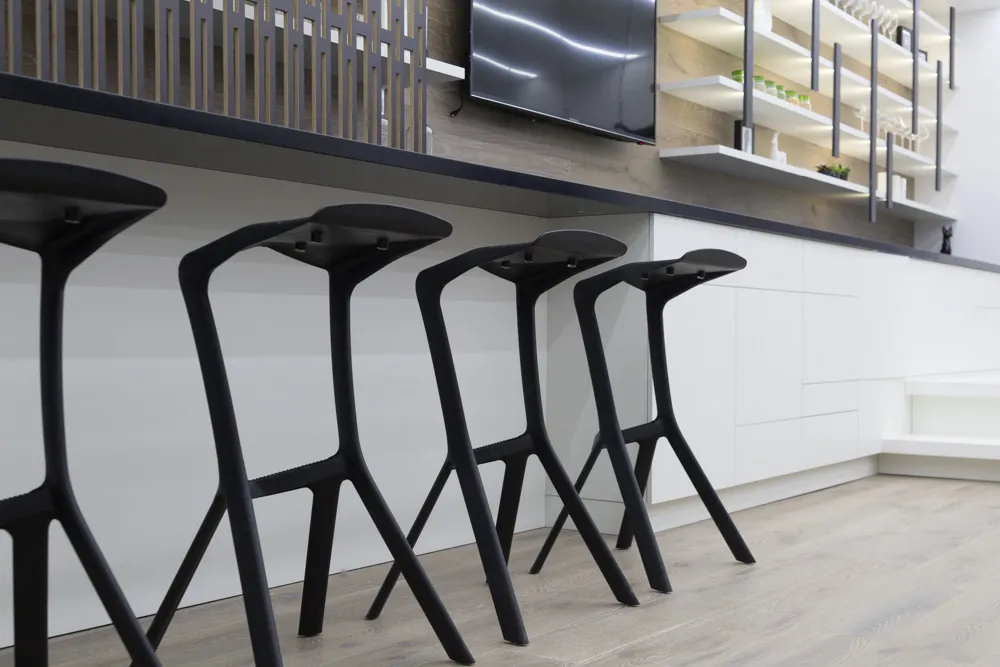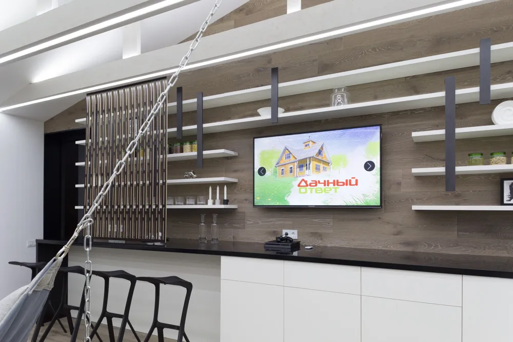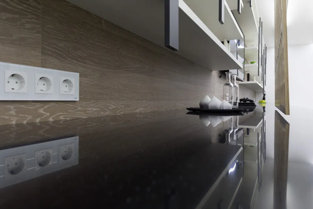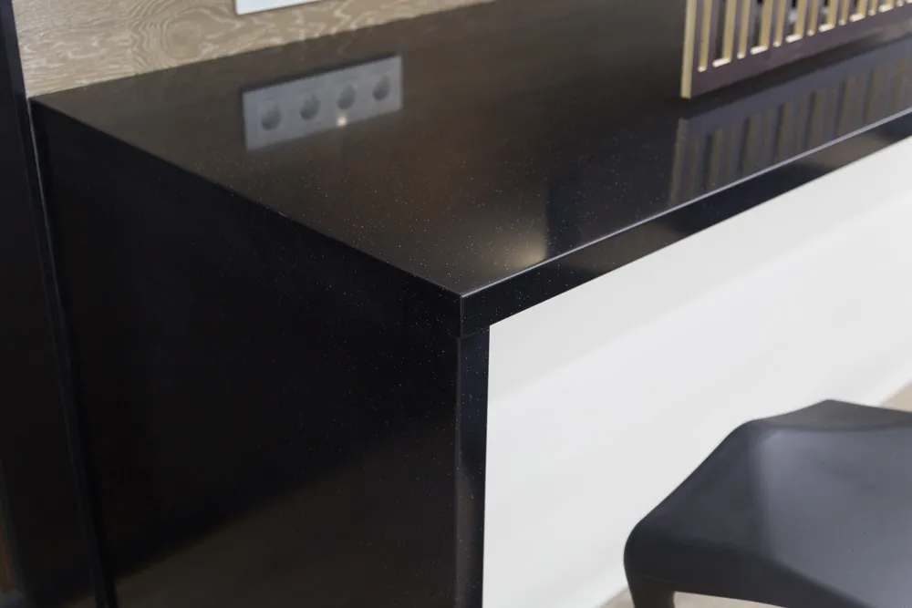 Столешница выполнена из искусственного камня «Hanex» в цвете Black Hill. С левой стороны композиции она выполняет функцию барной стойки. Передвижная (на скрытых верхних подвесах) декоративная решётка выполнена из фанеры (сторонним производителем), перемещается над столешницей по всей её длине.