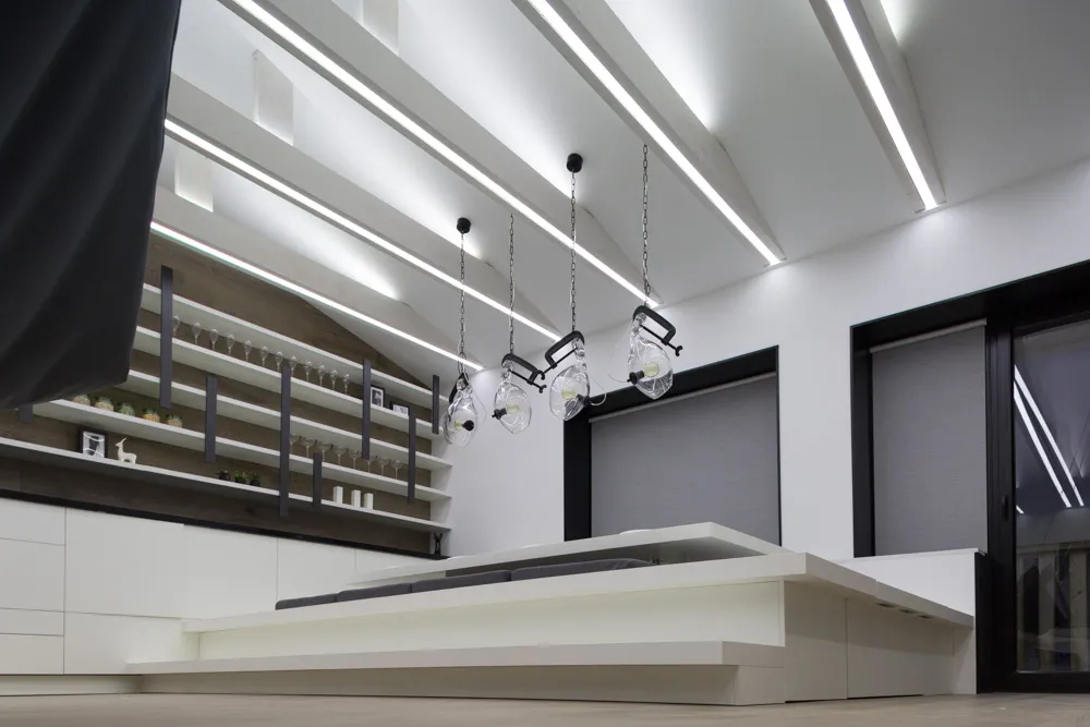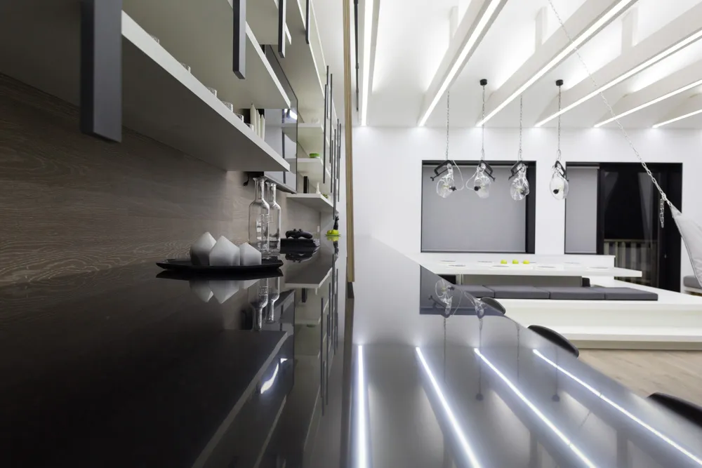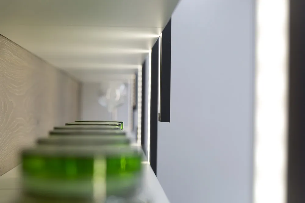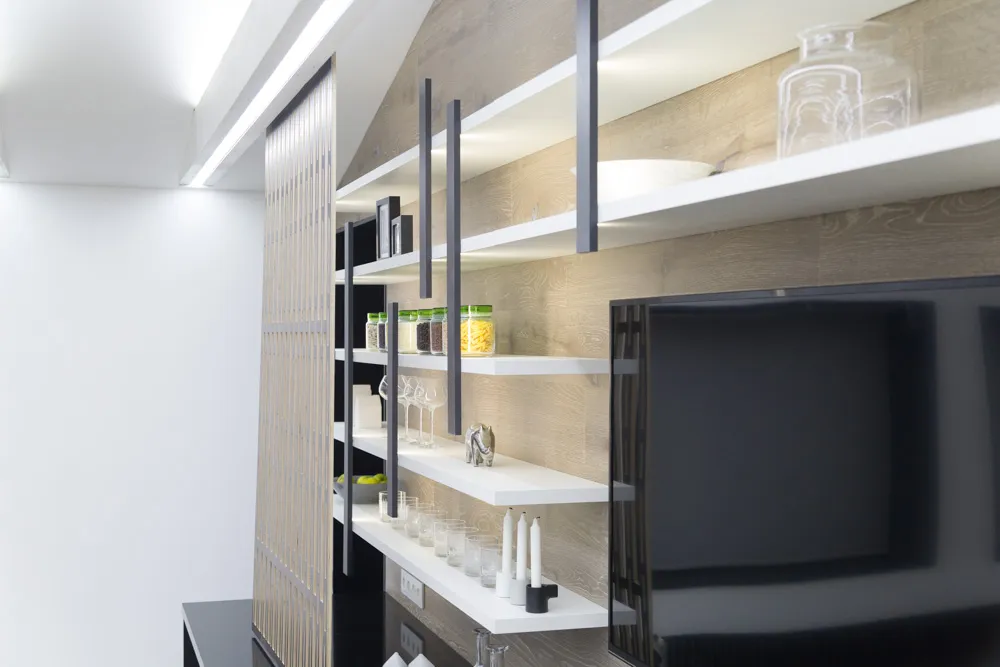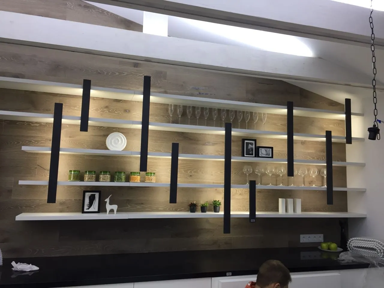 С наружной стороны к полкам прикреплены чёрные поперечины (ДСП Графит 16 мм), в которые со стороны стены интегрированы декоративные светильники со светодиодной подсветкой.