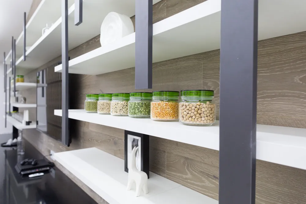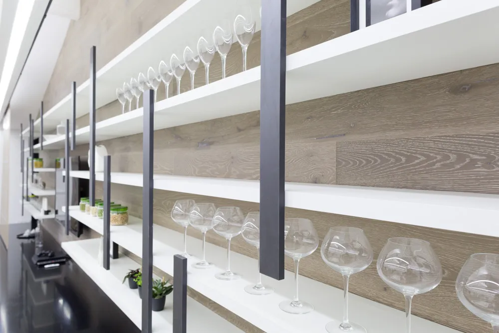 На стене над кухонной столешницей смонтированы полки в цвете Алебастр толщиной 32 мм, на скрытых креплениях.