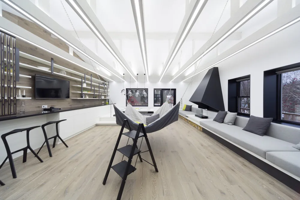 Изготовленная компанией Mr.Doors мебель размещена по двум зонам – каминной и гостиной.