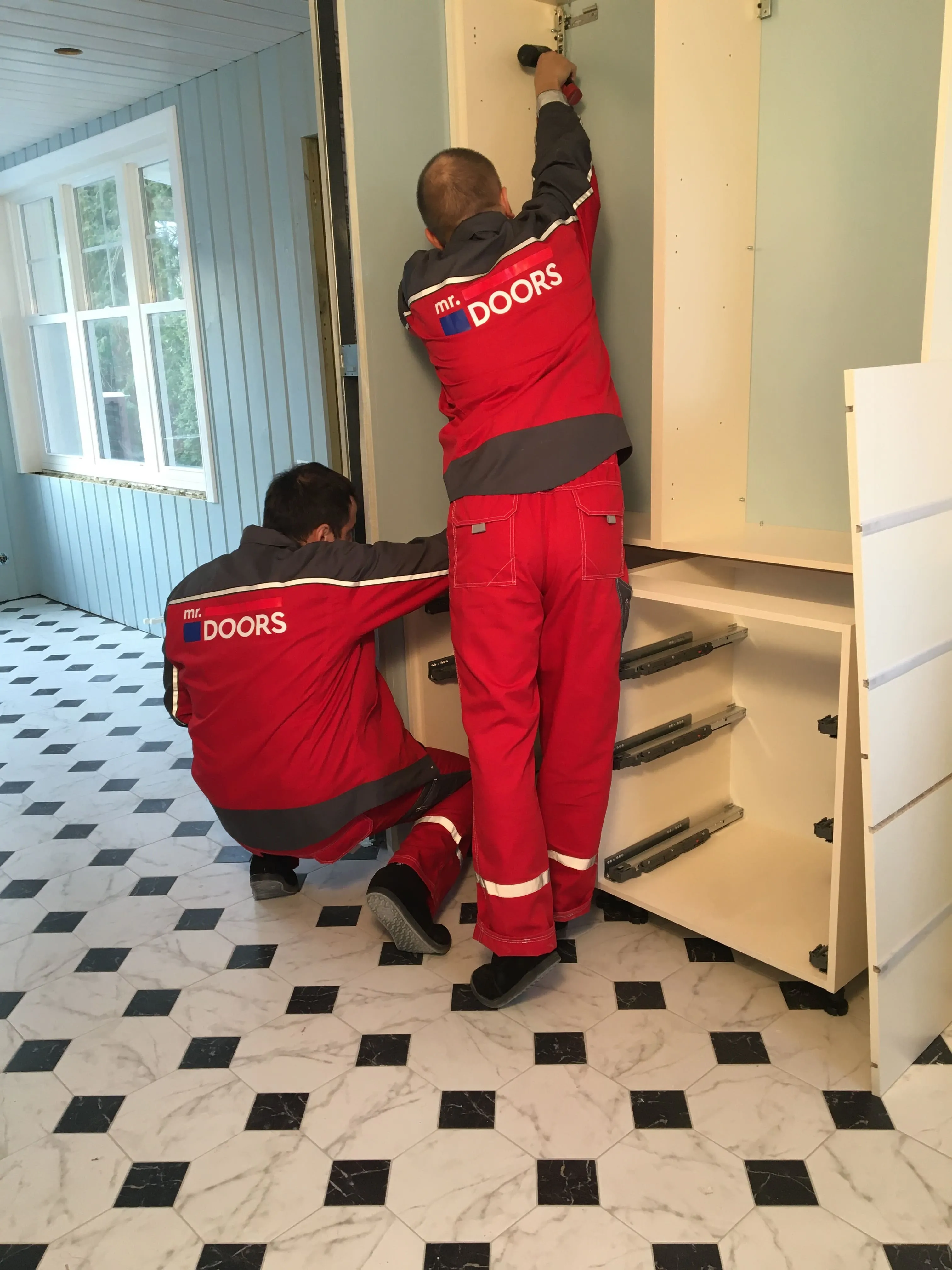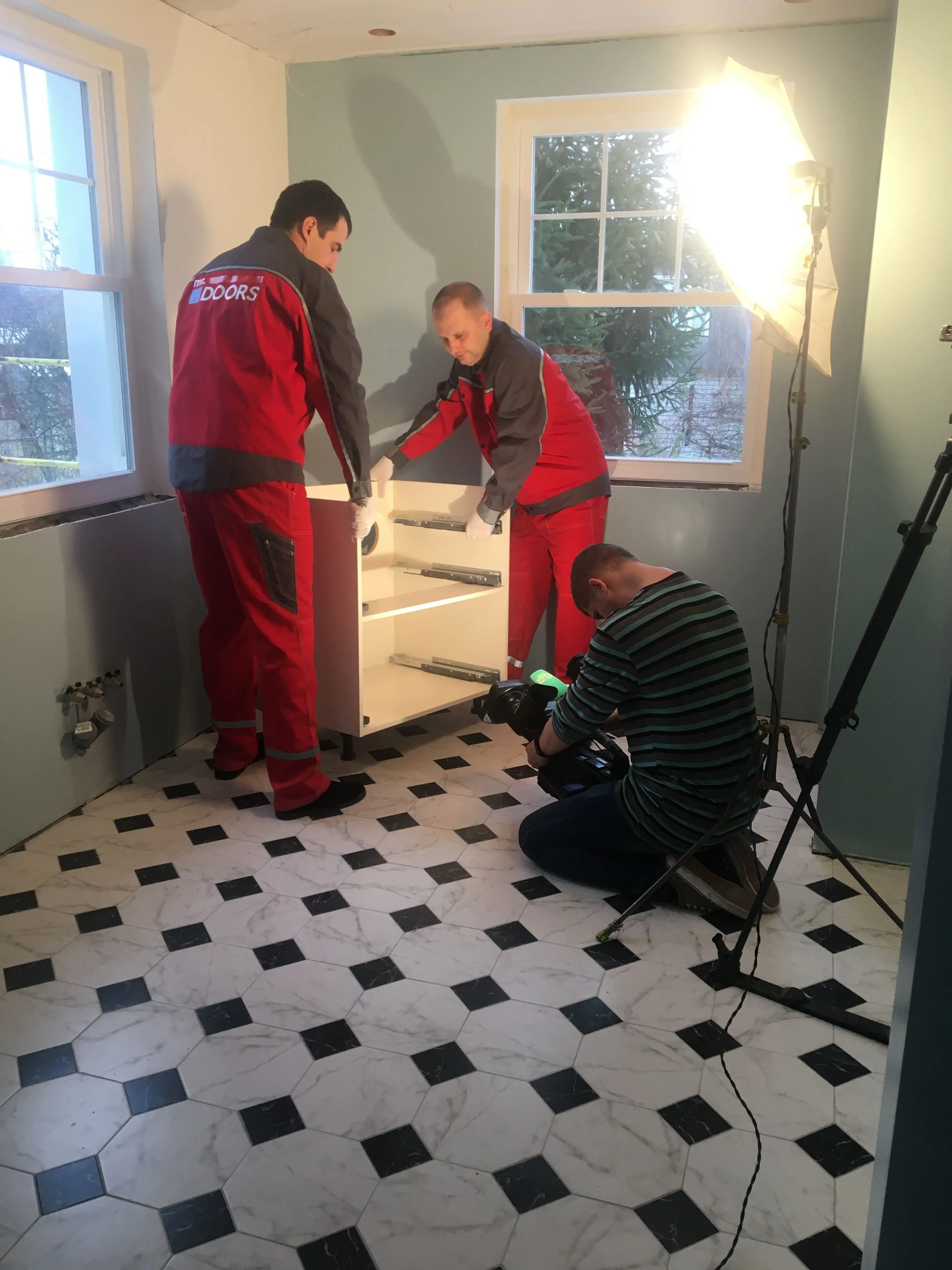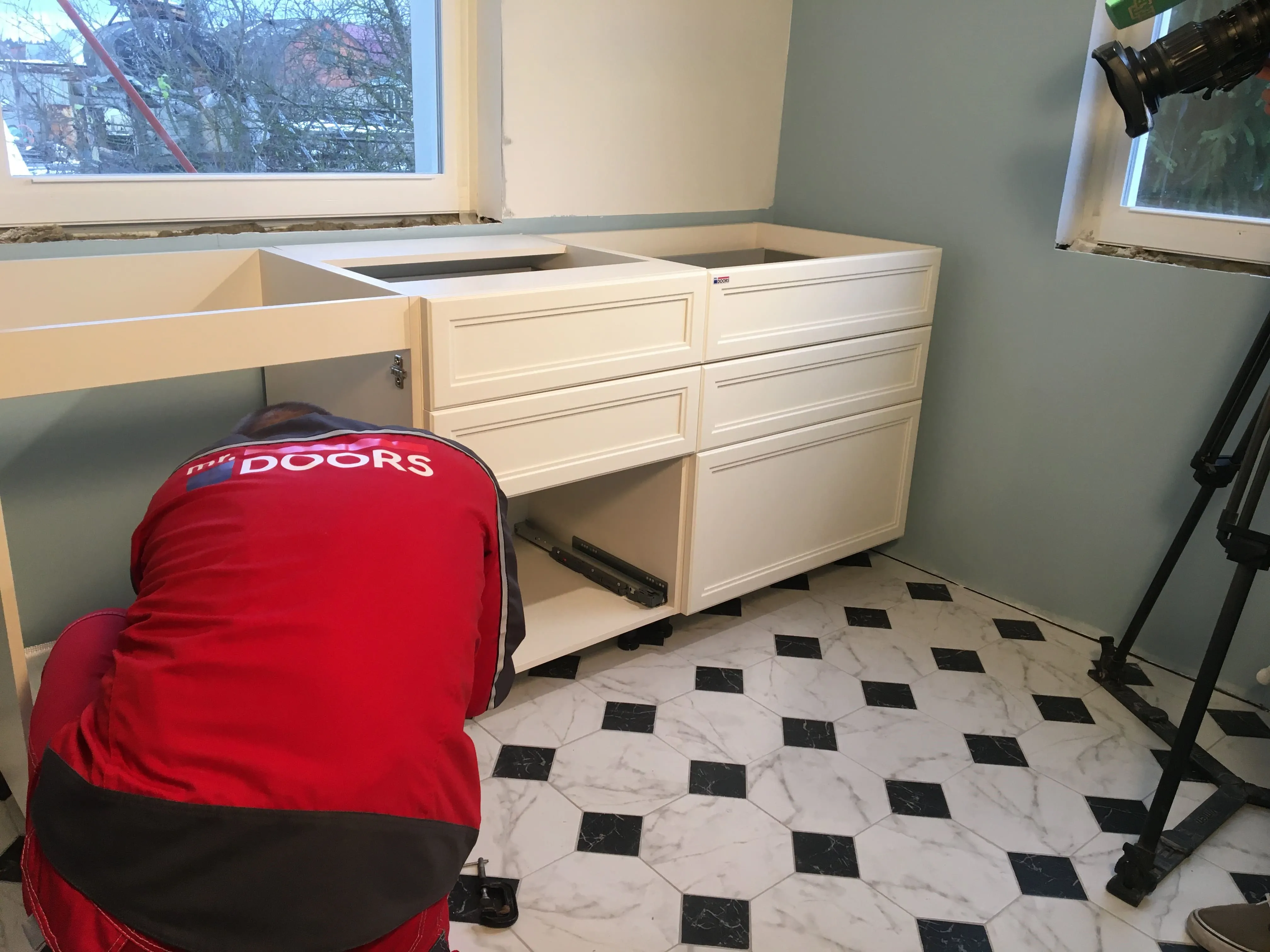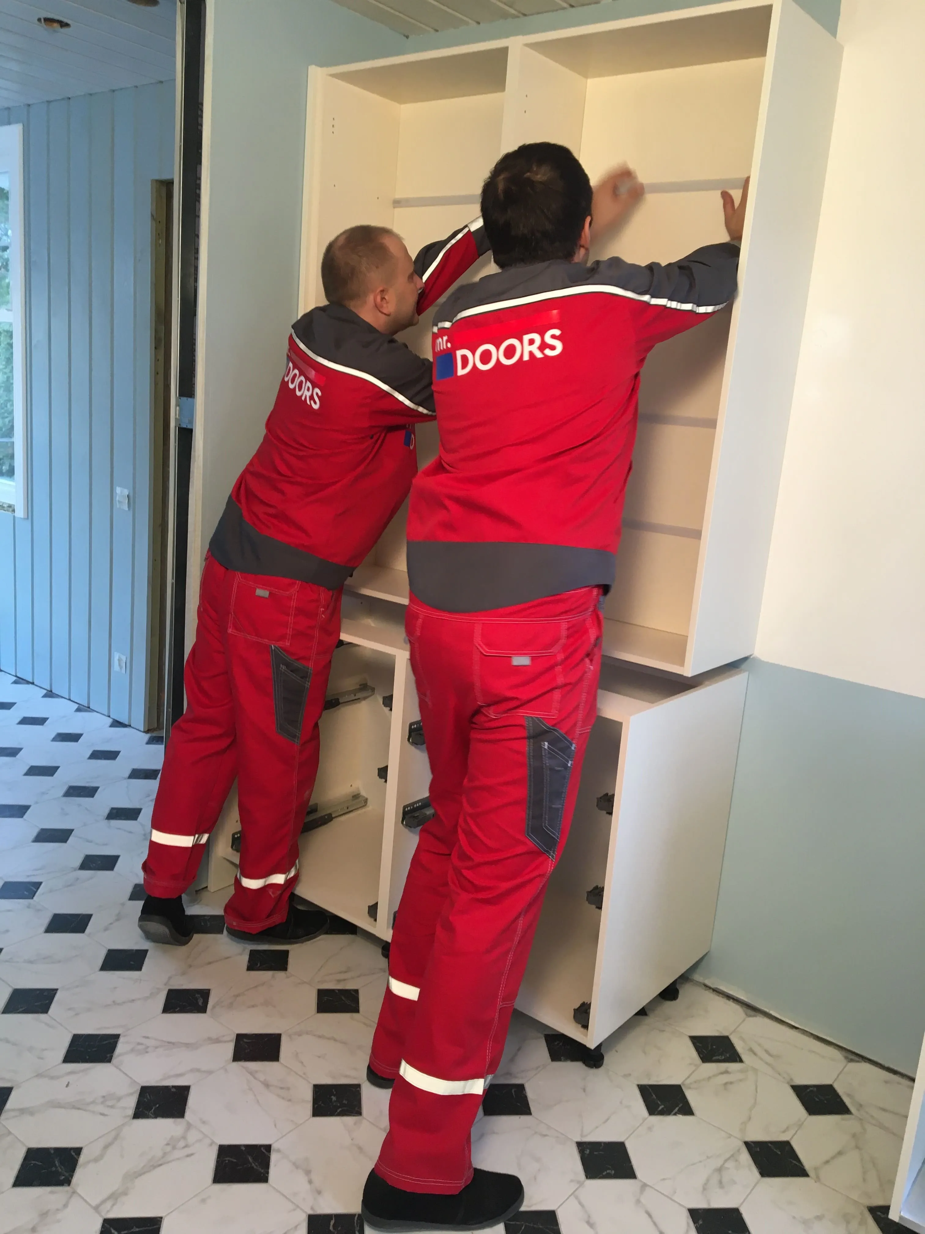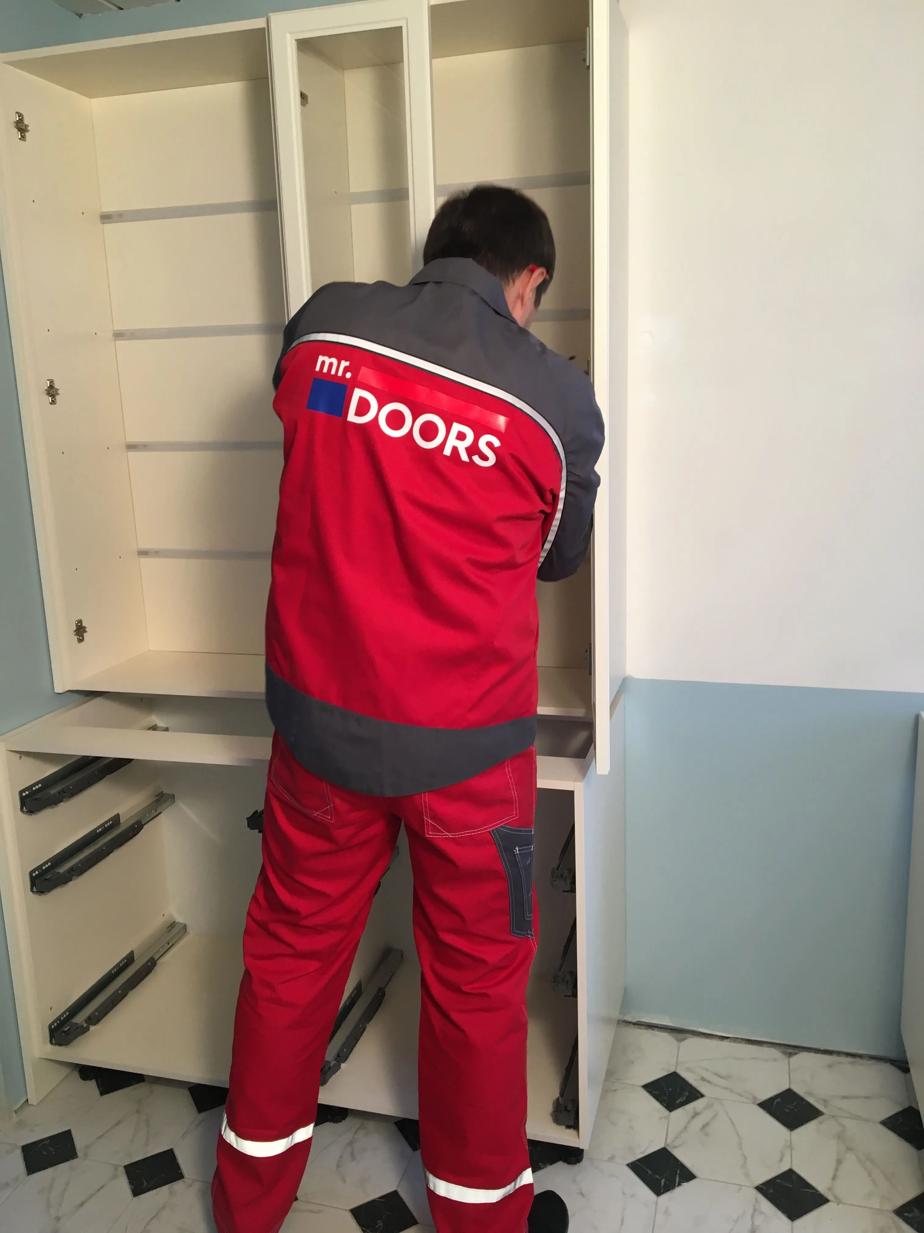Но, «глаза боятся, а руки делают», и за месяц с небольшим были переделаны полы, потолки, передвинуты стены и заново проведены коммуникации. То есть, подготовка к нашему этапу работ завершена. Сложность была в нестандартном размере, но это как раз команде Mr.Doors по плечу, ведь мы спецы именно по индивидуальным проектам и смогли прекрасно вписать кухню в имеющийся размер.