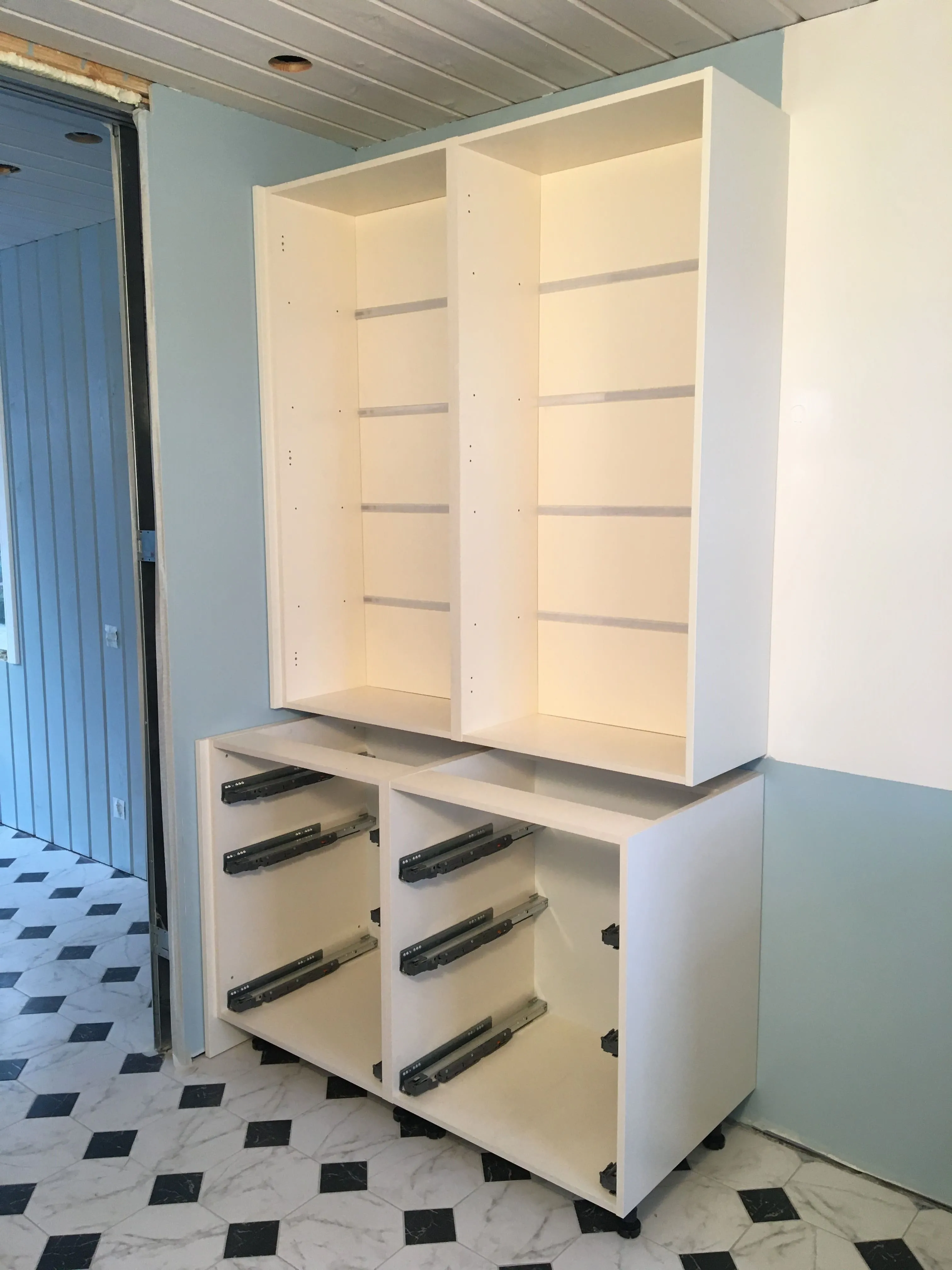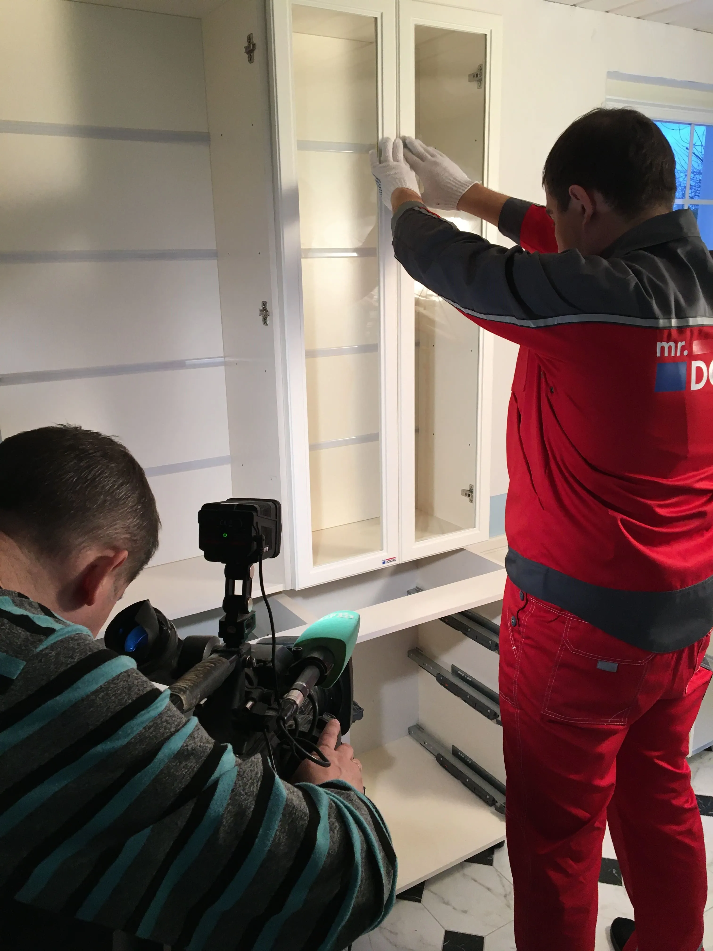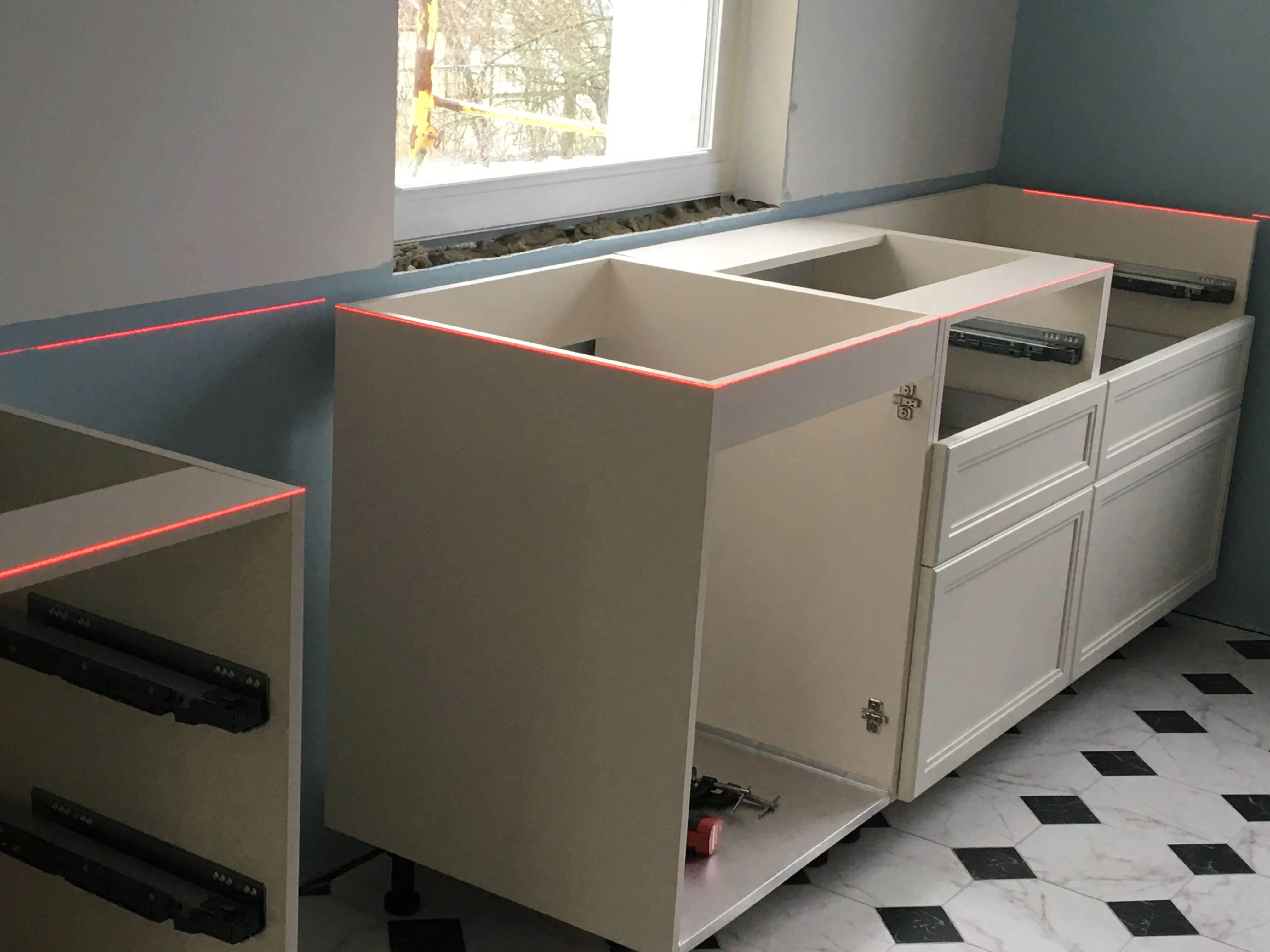 Навеска верхних модулей, установка задних стенок с LED-подсветкой.