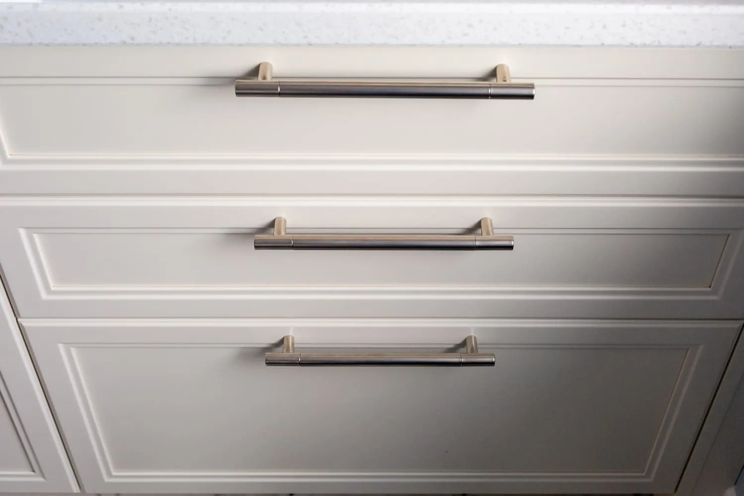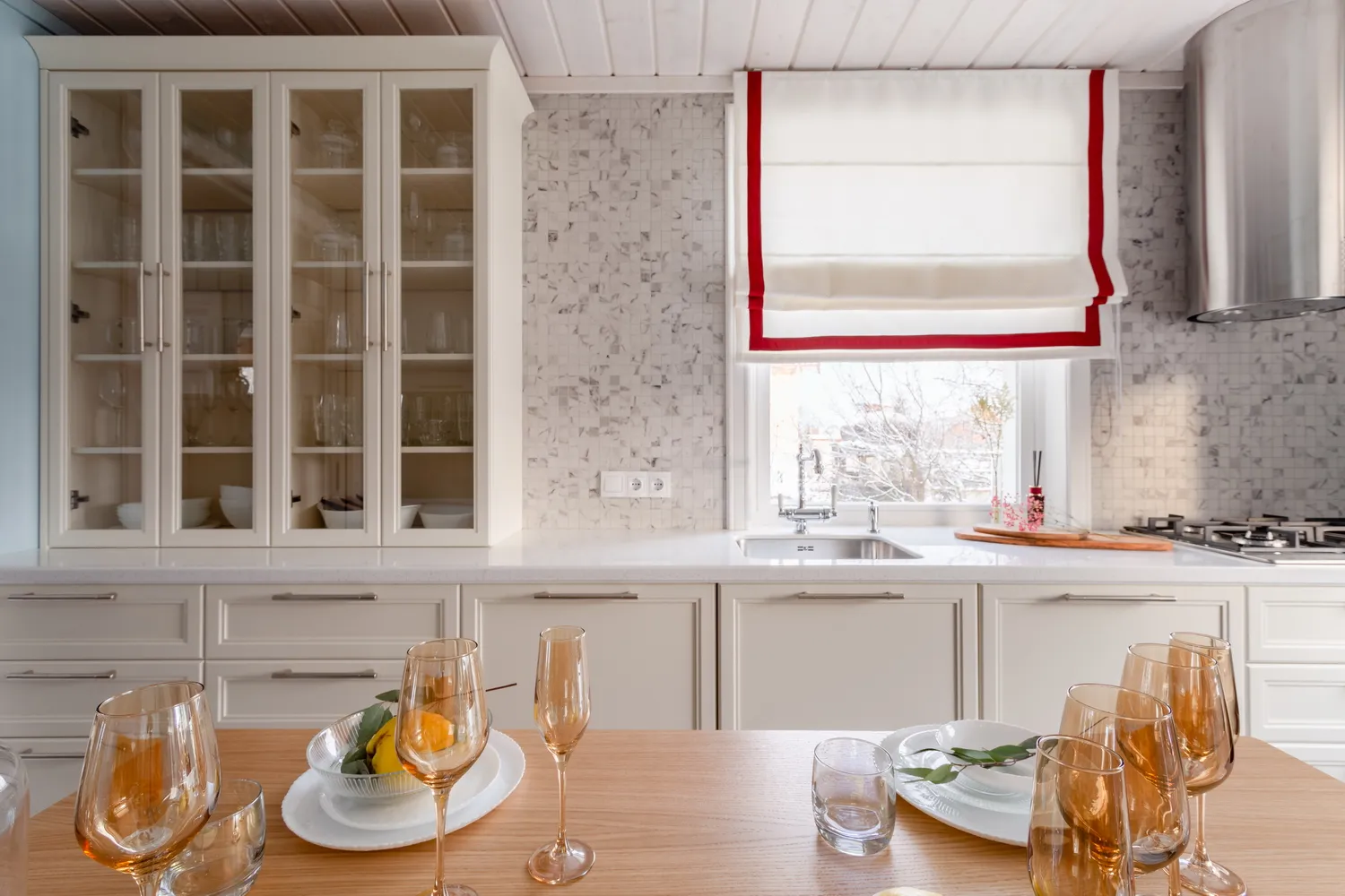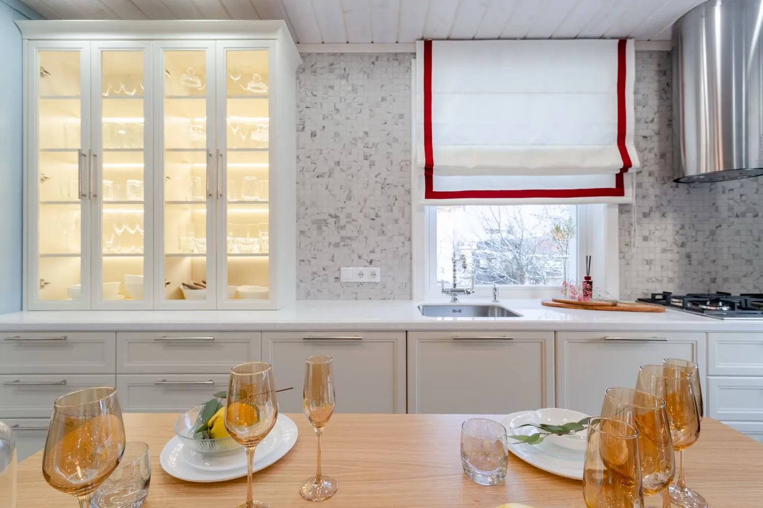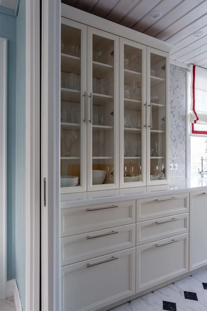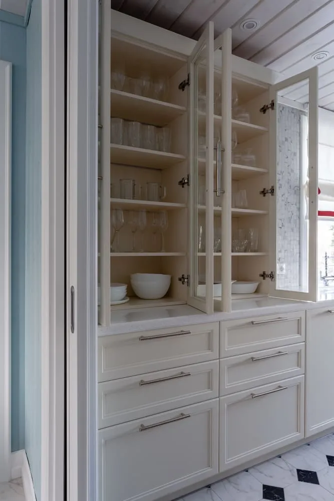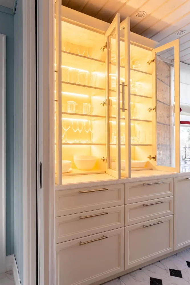 Фасады «Урбан» в матовой эмали «Антик белый» смотрятся одинаково премиально и в естественном, и в искусственном свете.