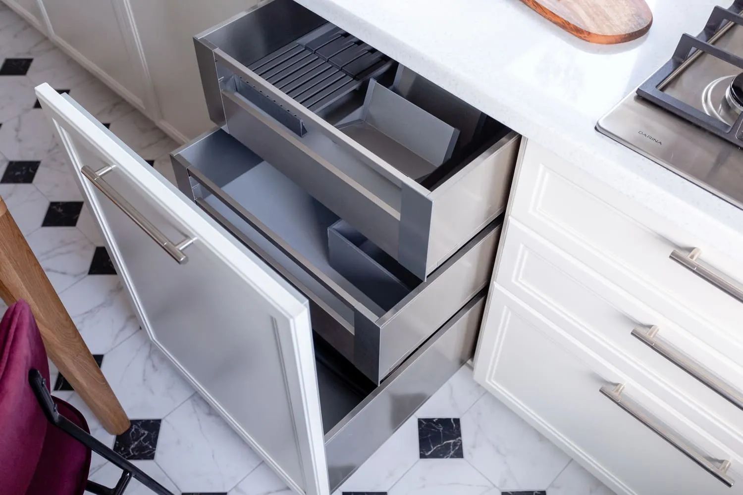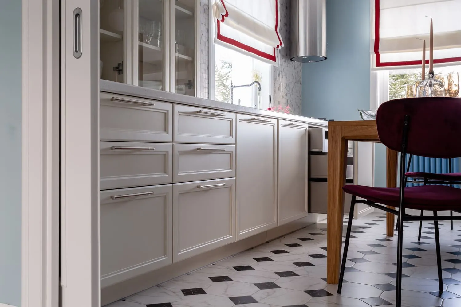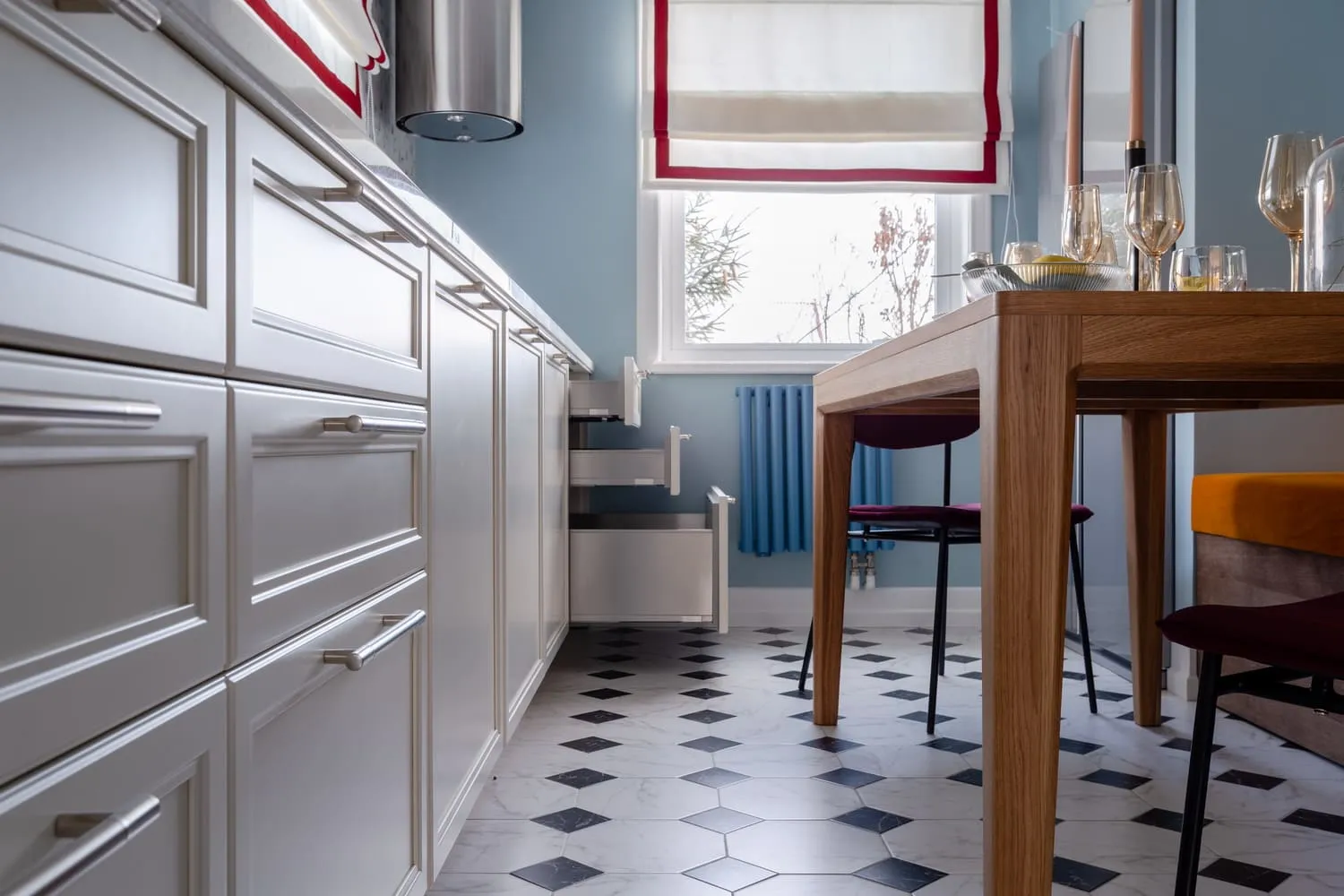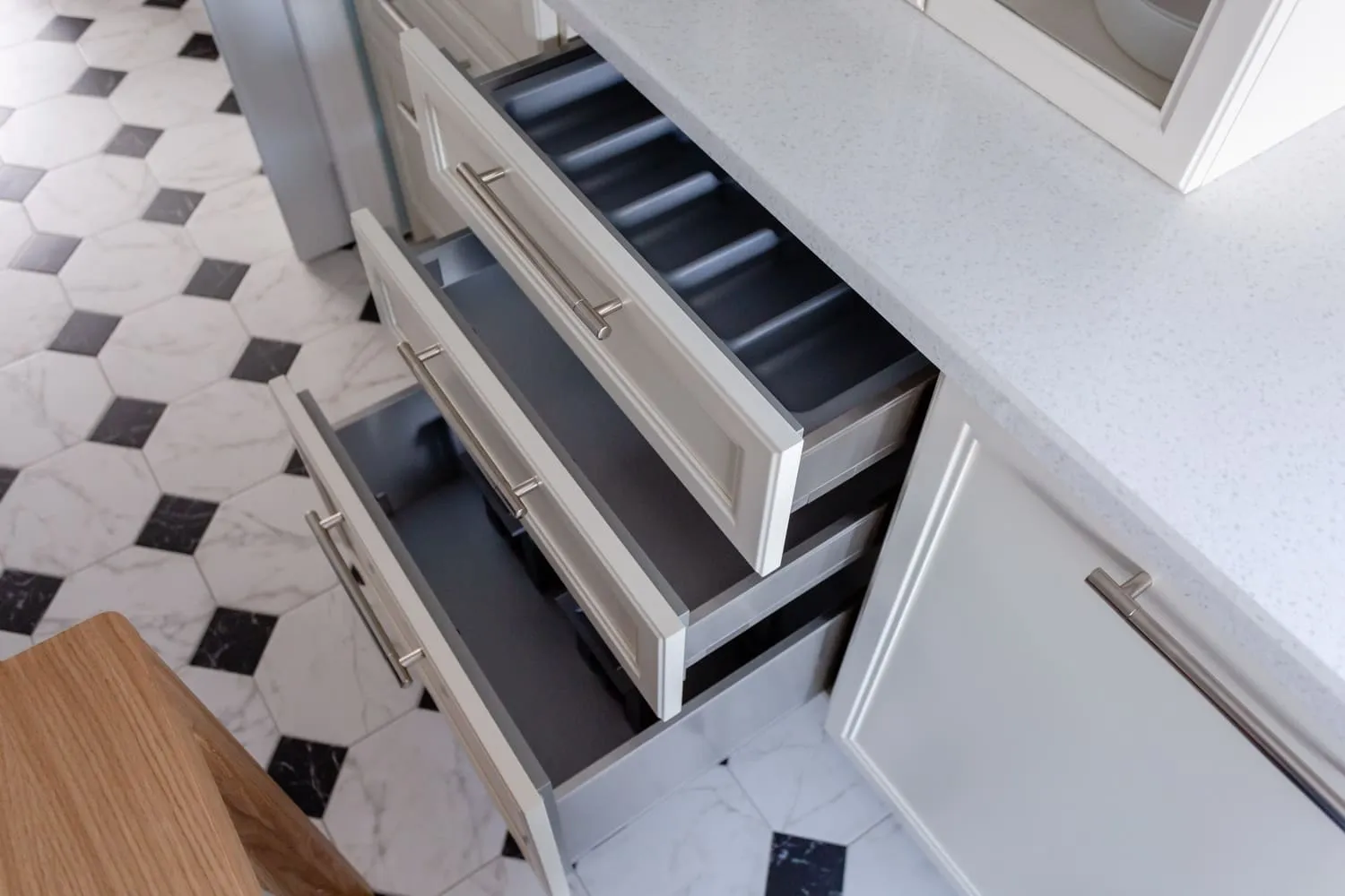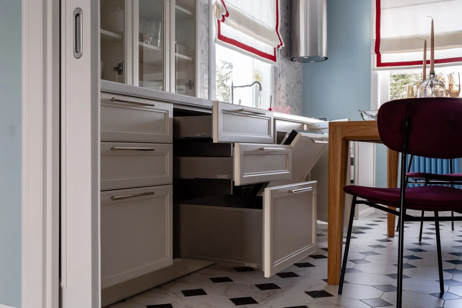 Строгая линия фасадов скрывает в себе множество сюрпризов. В ящиках Legrabox размещены разделители, держатели для тарелок, специй и ножей, лотки для столовых приборов. Это очень удобные аксессуары, становящиеся всё более востребованными умными хозяйками.