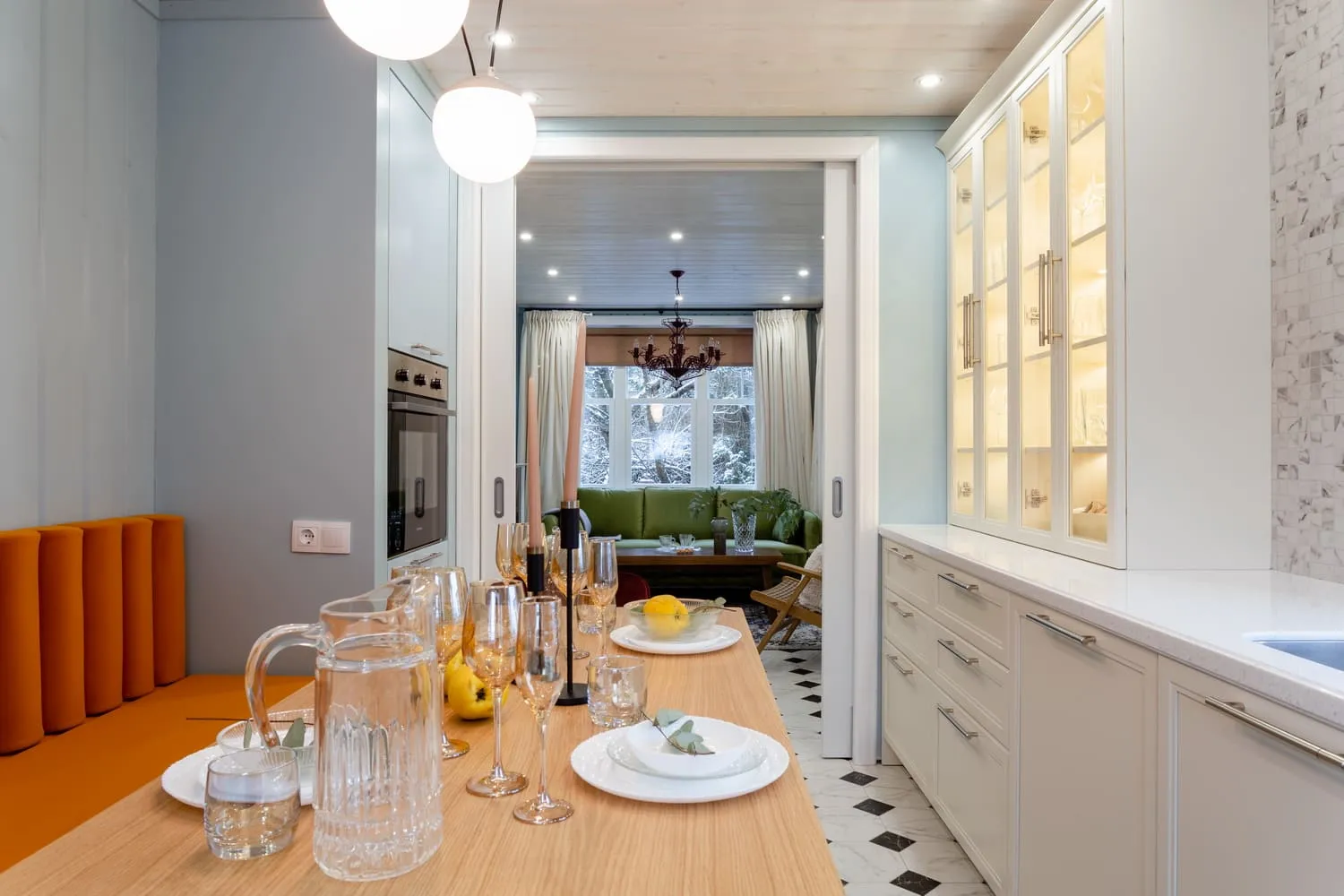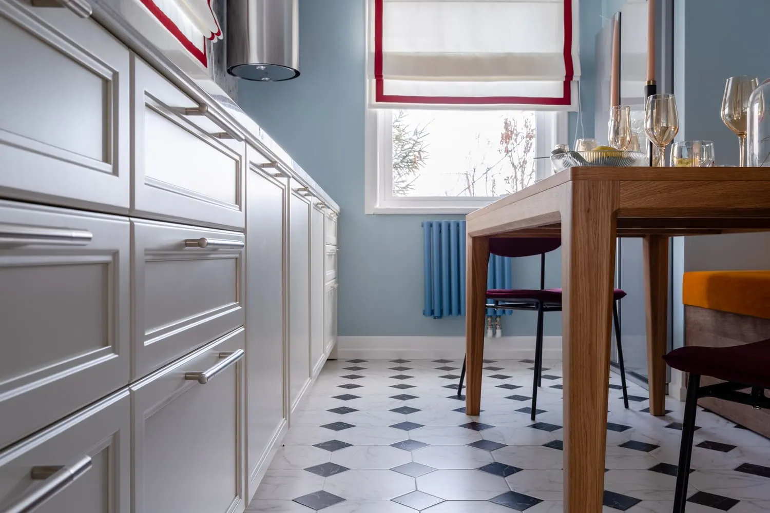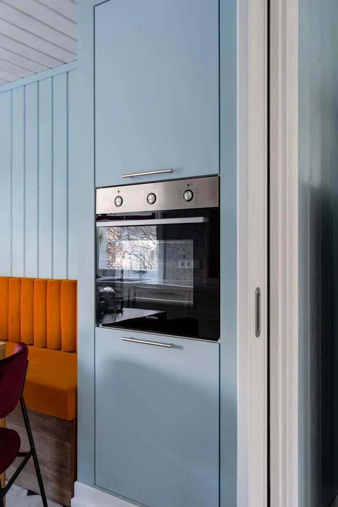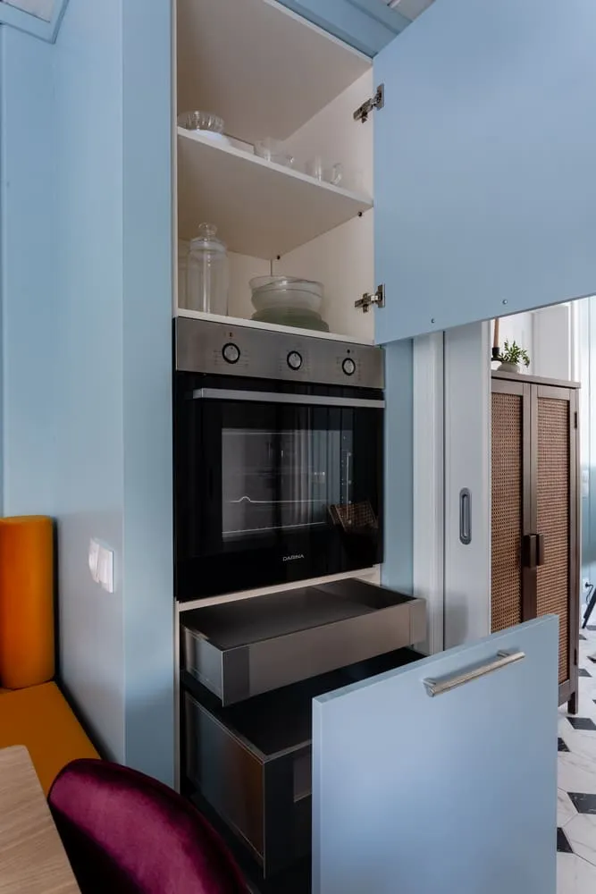 На противоположной стене в нише под духовым шкафом тоже установили ящики Legrabox. А сверху сделали секцию для хранения.