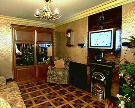 В новогоднем выпуске программы «Квартирный вопрос» переделка происходила в гостиной большой, дружной семьи. Благодаря золотисто-бежево-шоколадной гамме комната получилась не только торжественно-роскошной, но и очень теплой и уютной.