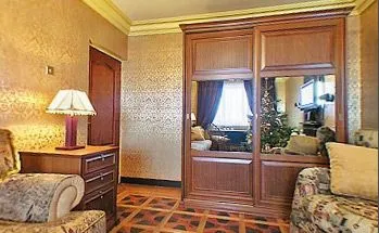 Тумбы, помимо своих непосредственных функций, выполняют еще и роль опор для большой столешницы. Рабочий стол укомплектован ящиками в том же стиле, что и тумбы. У шкафа комбинированные двери-купе: центральный фрагмент – зеркальный, а крайние - из декоративной панели «Буазери». Внутри шкафа, помимо вешалок и полок есть специальная палка-манипулятор, которой удобно доставать вещи с верхнего яруса.