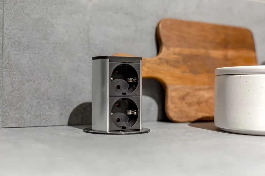 В столешницу встроен блок розеток ELEVATOR для мелкой бытовой техники. Он выдвигается из столешницы при нажатии на панель.