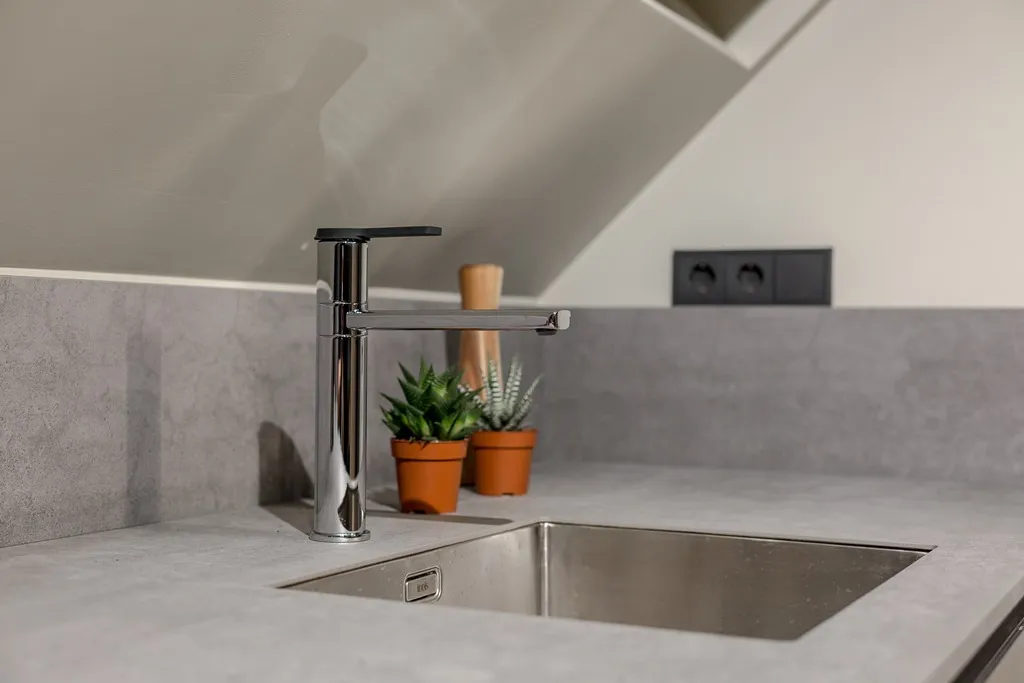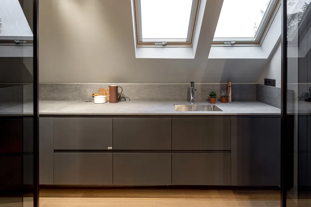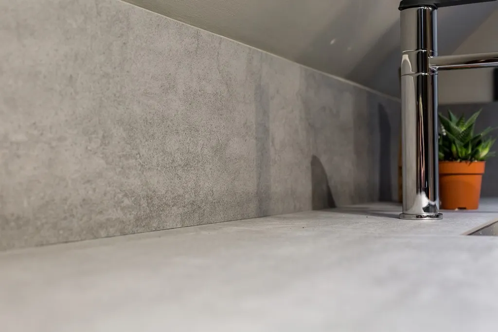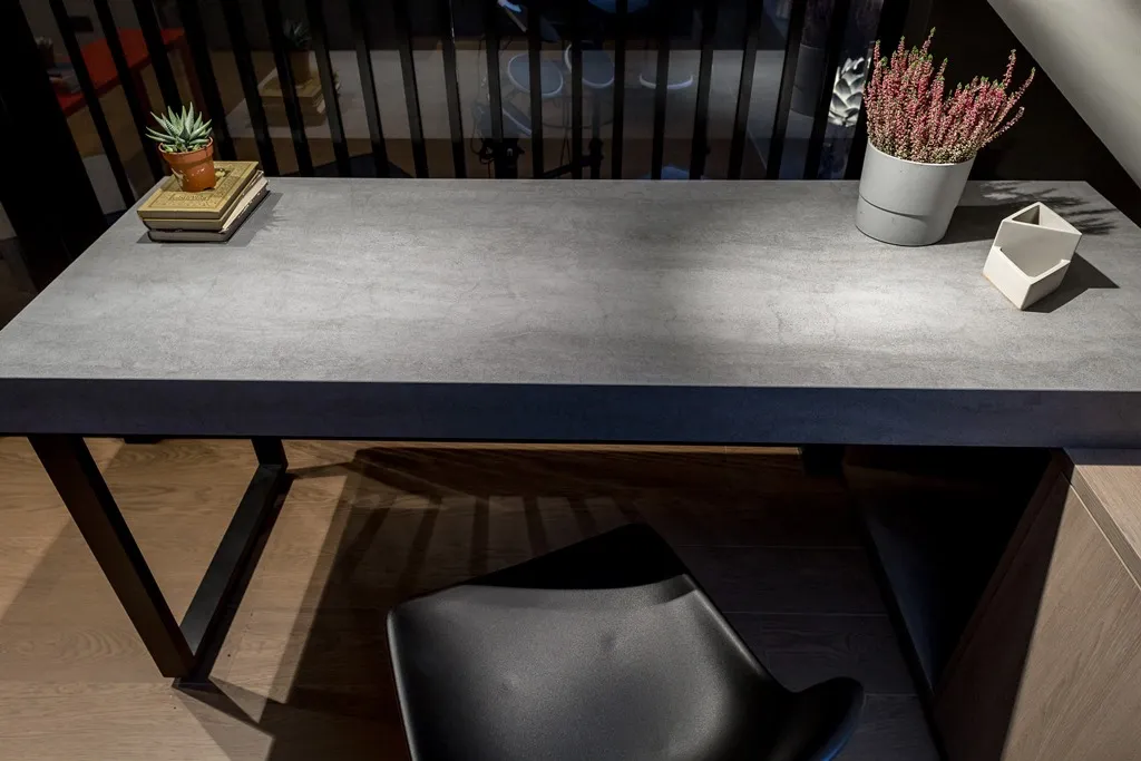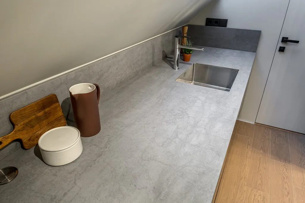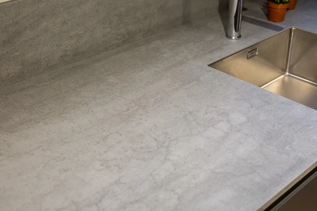 Столешница из широкоформатной керамики серии Ceralan толщиной всего 2 мм. Декор – «Григио диабло». Керамика излучает особое, натуральное ощущение, при этом имеет относительно лёгкий вес. Её отличают: высокая стойкость к химическому воздействию, огнестойкость и жаропрочность, высокая ударопрочность и цветостойкость. Поверхность гигиенична и абсолютно безопасна в контакте с пищевыми продуктами, так как не выделяет никакие растворенные вещества. Предотвращает размножение плесени, грибков и бактерий. Легко очищается и к ней не пристают даже самые стойкие краски.