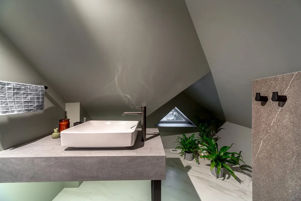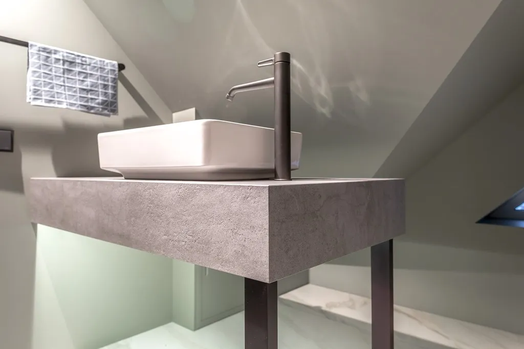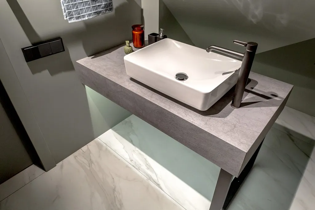 В ванной комнате утроена столешница под мойку из широкоформатной керамики Ceralan толщиной 170 мм, с подсветкой по фронту. Выключатель размещен на стене. Декор столешницы тот же, что и в кухне – «Григио диабло». Опора столешницы – МАДРИД.