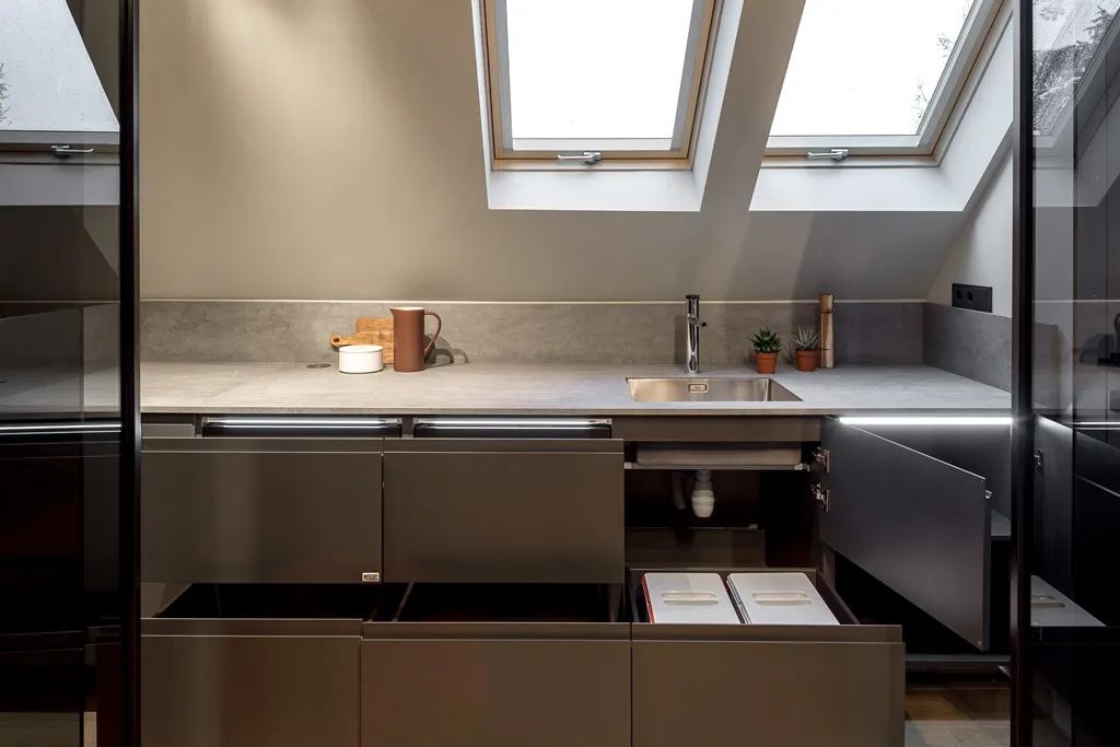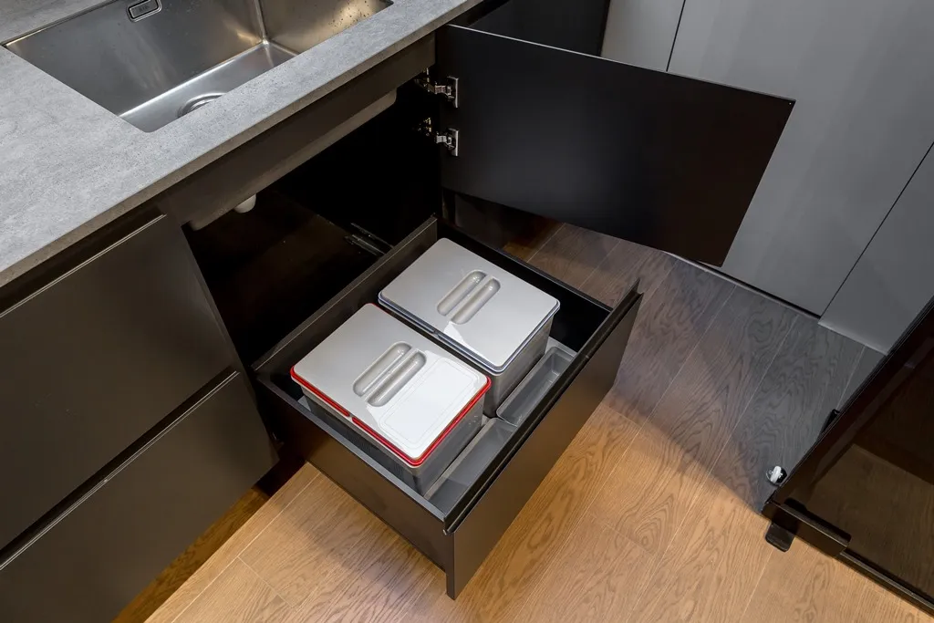 Под мойкой устроили систему для хранения мусора с выкатными вёдрами.