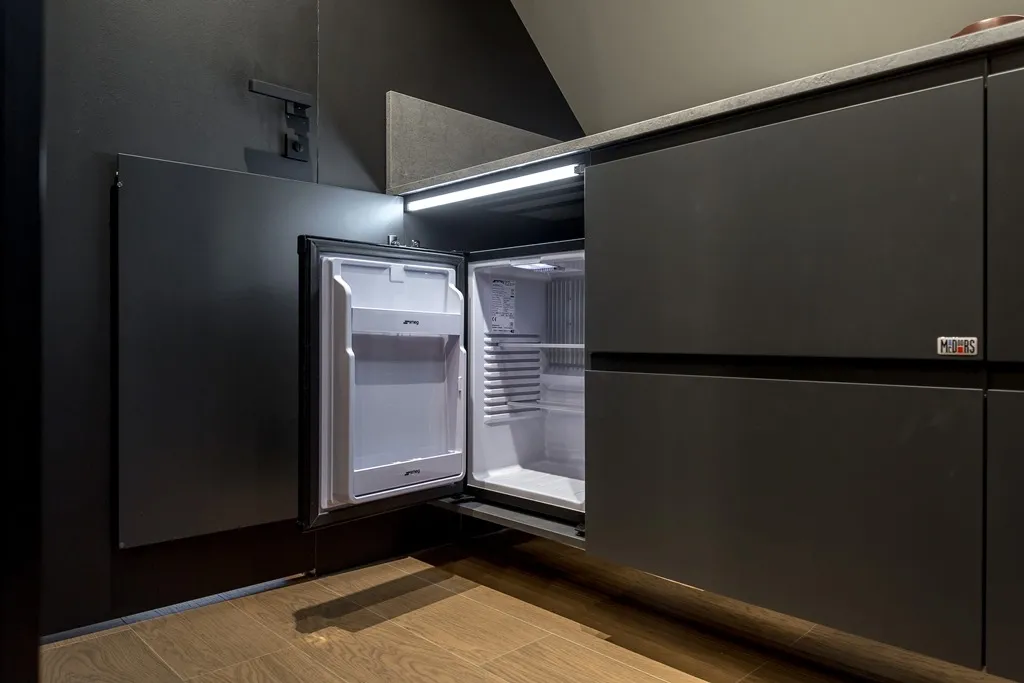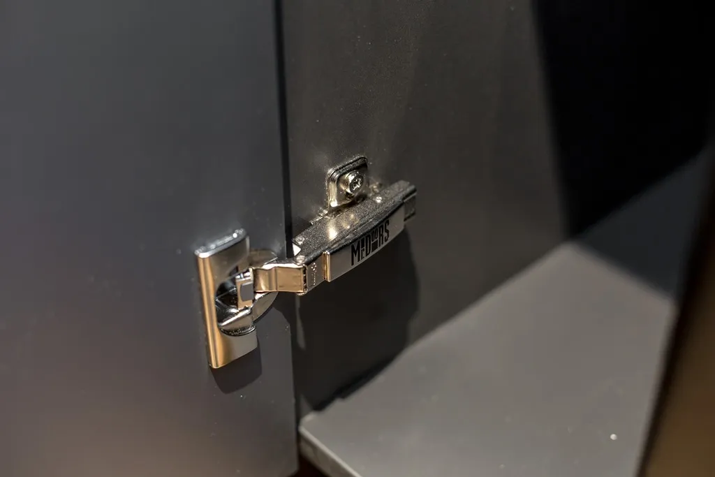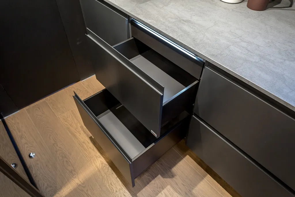 В модулях разместили встроенный мини-бар и ящики Леграбокс. На сегодняшний день, это, пожалуй, самые совершенные ящики с точки зрения отсутствия зазоров, провисания и надежности механизмов скольжения. Нагрузка возможна до 70 кг. Ящики отличает элегантный дизайн и плавное бесшумное закрывание.