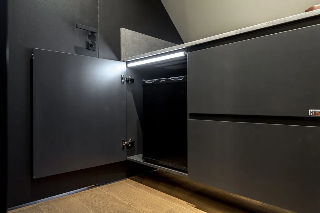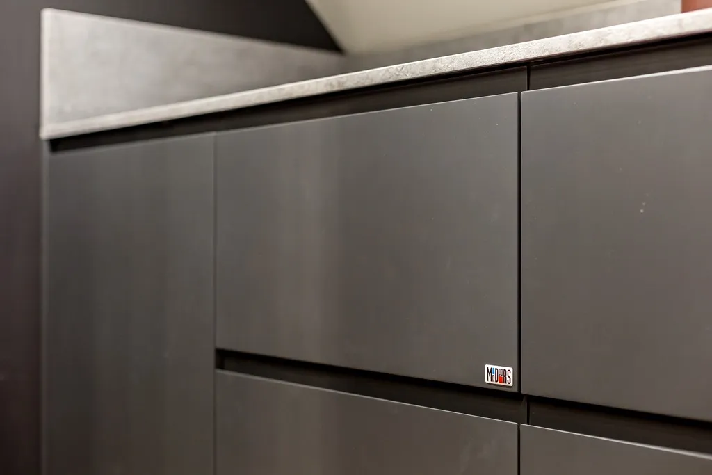 Все использованные в проекте фасады по типологии называются Джей (от англ. J – именно в форме этой буквы сделан фигурный вырез в верхнем торце, за который удобно захватывать и открывать панель). Фасады изготовлены из МДФ и покрыты матовой эмалью в цвет корпуса «Графит».
