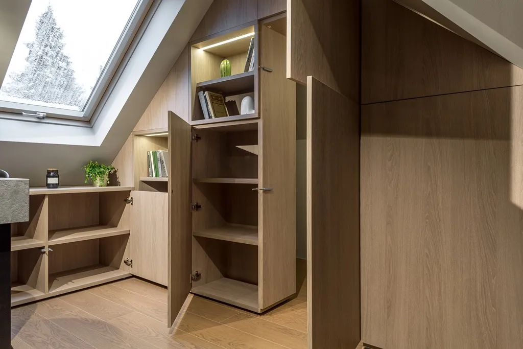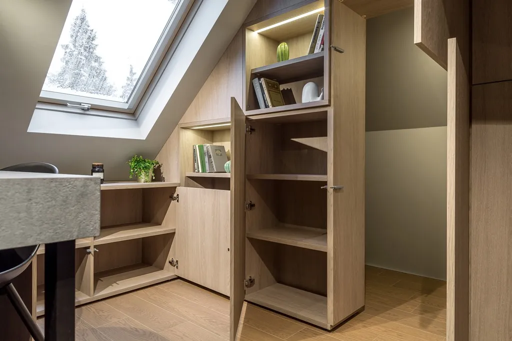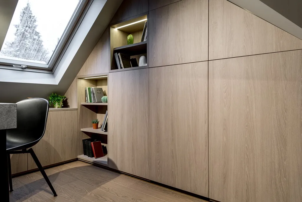 В кабинете под скосом крыши устроили систему хранения, состоящую из закрытых и открытых стеллажей. Декор всей мебели – ламинированная плита «Дуб Орлеанский песочный». Фактура материала идеально имитирует поверхность натурального дерева. За одним из фасадов скрывается дверь в чулан. Система открывания - P2О (нажал-открыл).