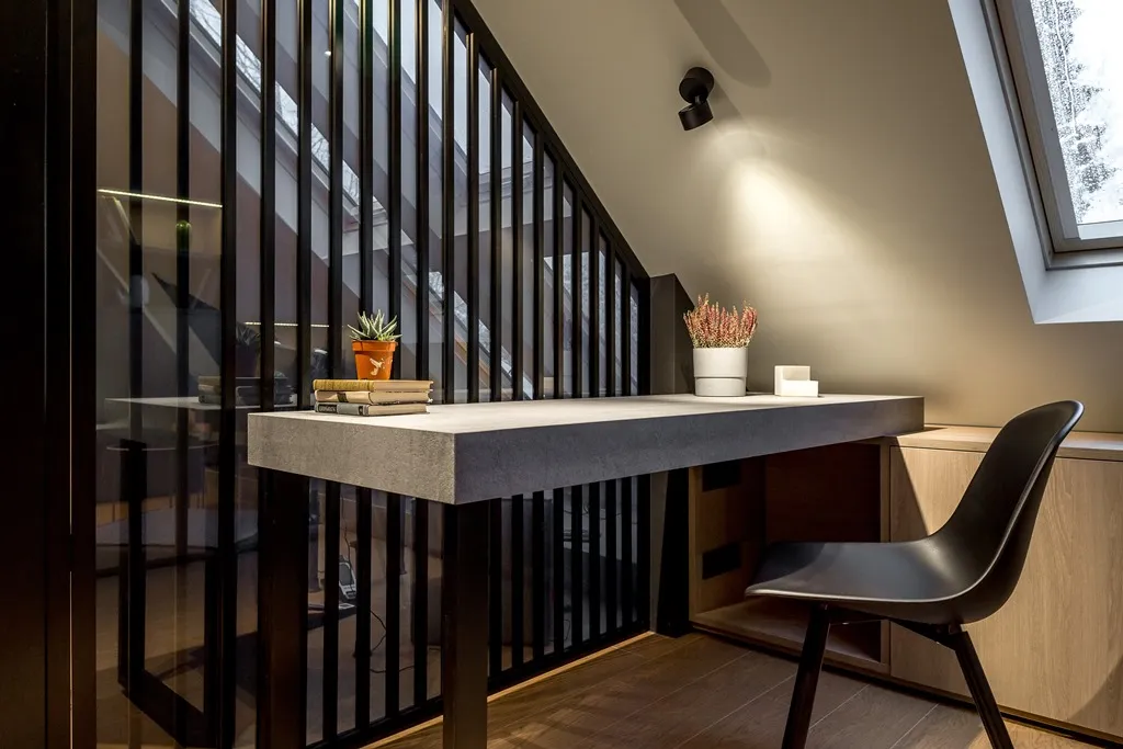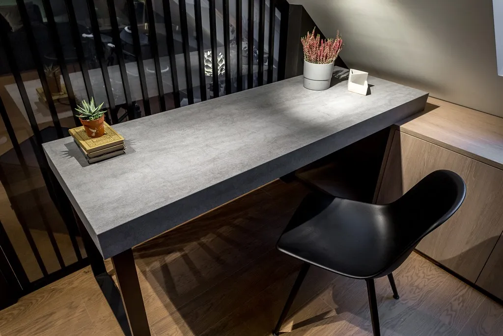 В открытых секциях врезана линейная подсветка LED, сенсорный выключатель расположен на корпусе шкафа. Столешница рабочего места выполнена из широкоформатной керамики Ceralan толщиной 100 мм, за считанные секунды принимающей температуру тела при контакте с кожей. Декор тот же, что и в кухне с ванной комнатой – «Григио диабло». Опора столешницы – МАДРИД.
