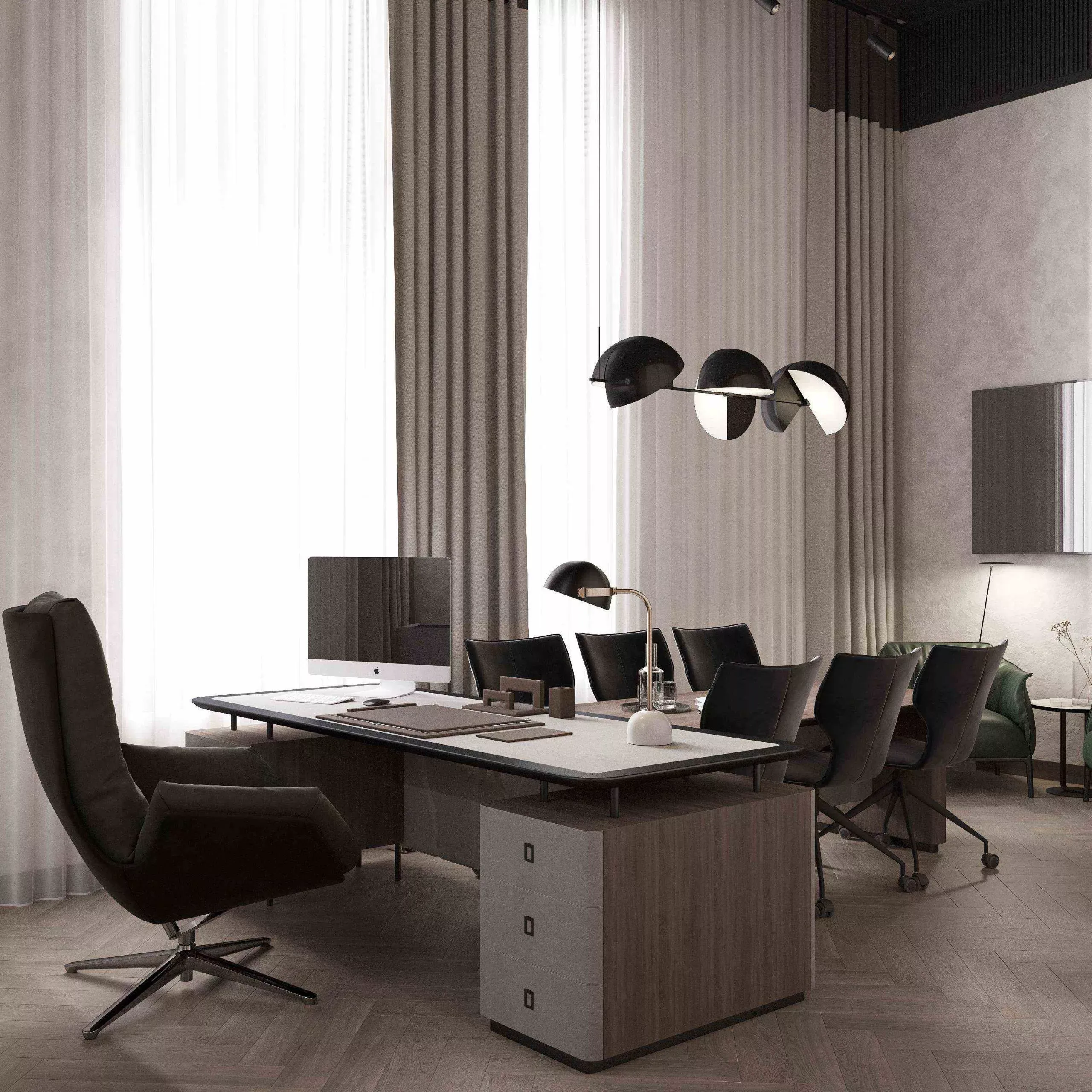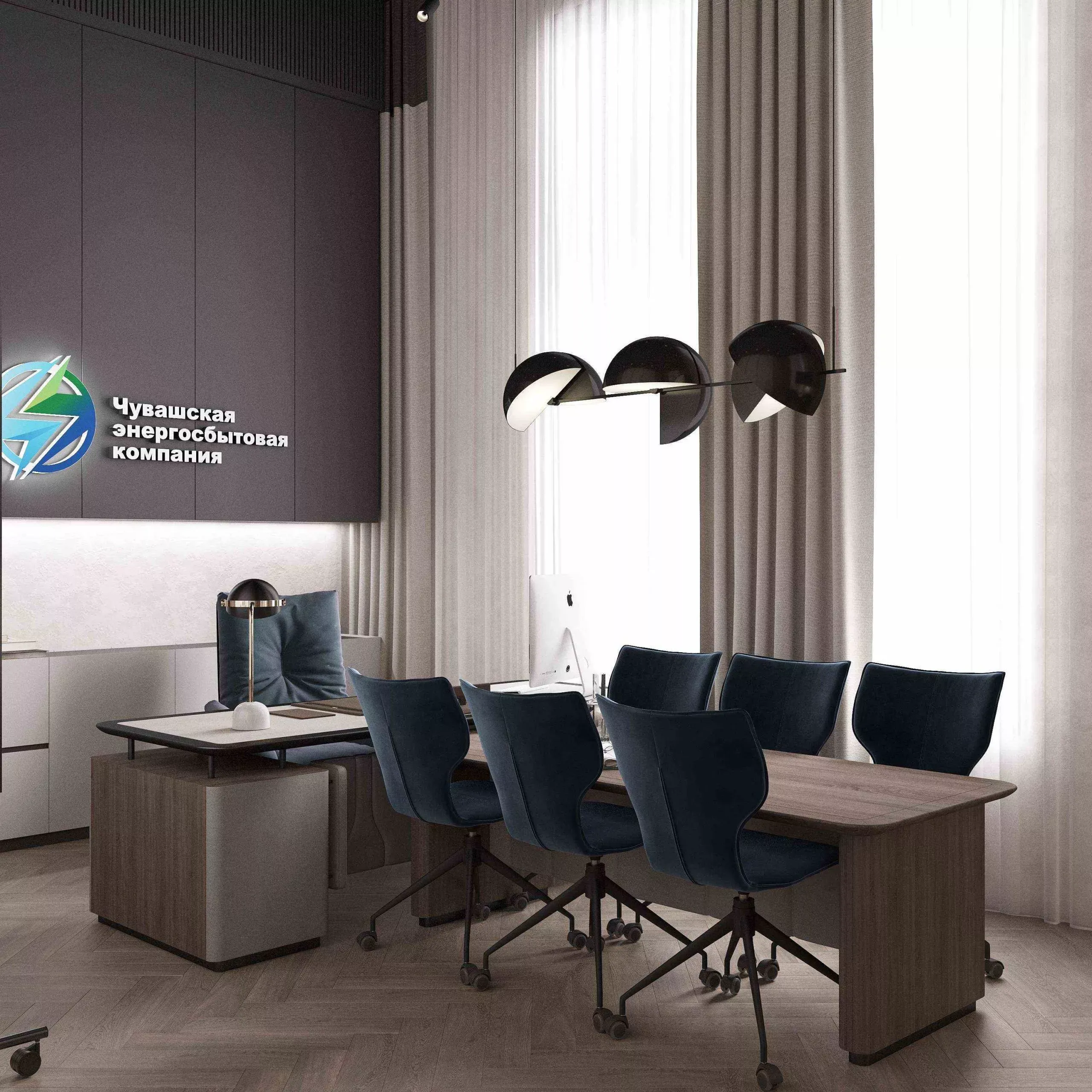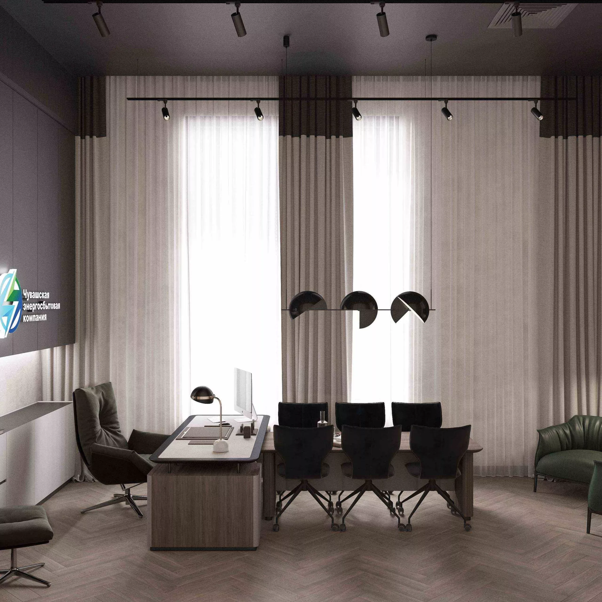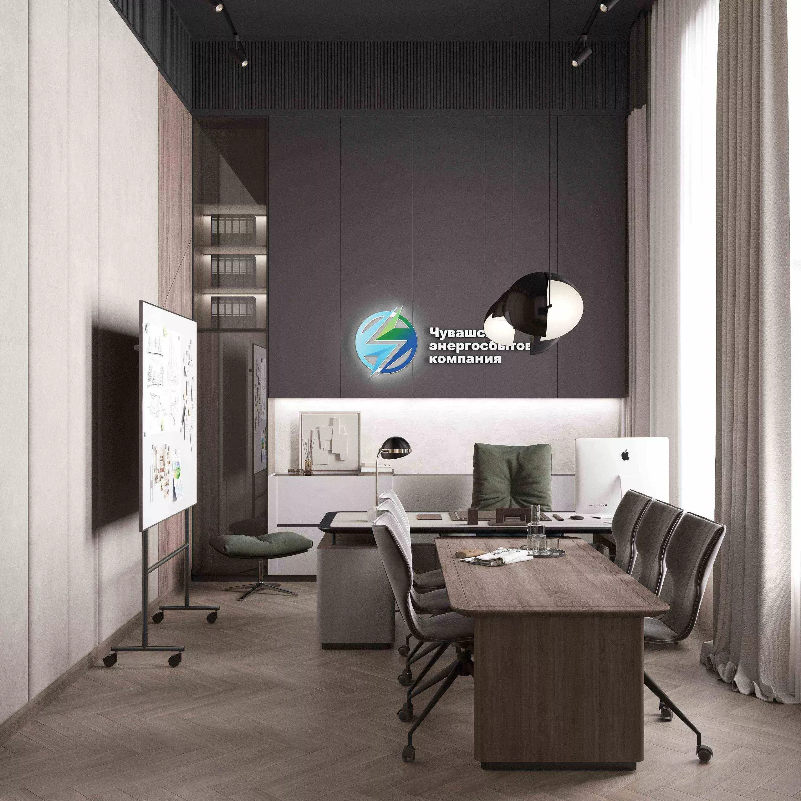 Кабинет руководителя, оформленный с элегантностью и функциональностью, включает в себя рабочий стол на тумбах с выдвижными ящиками, а также стол для переговоров, рассчитанный на 6 человек. Два шкафа дополняют интерьер: один со стеклянными дверьми и внутренней подсветкой, другой — с возможностью установки световой панели, где три центральные части представляют собой глухие панели, а две боковые панели служат дверьми.