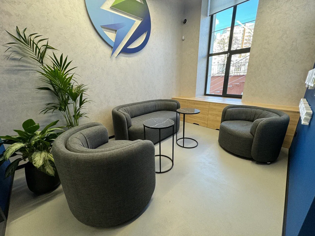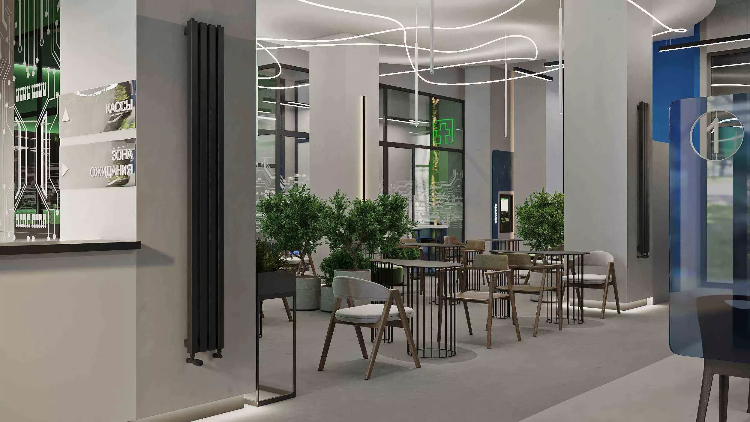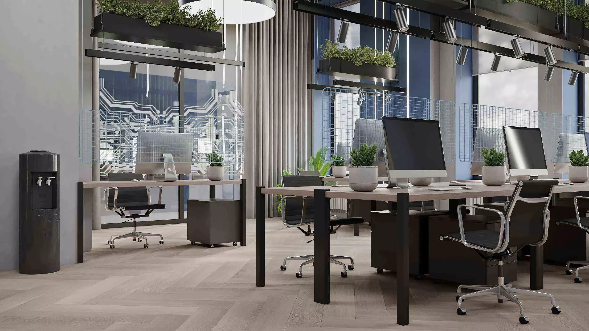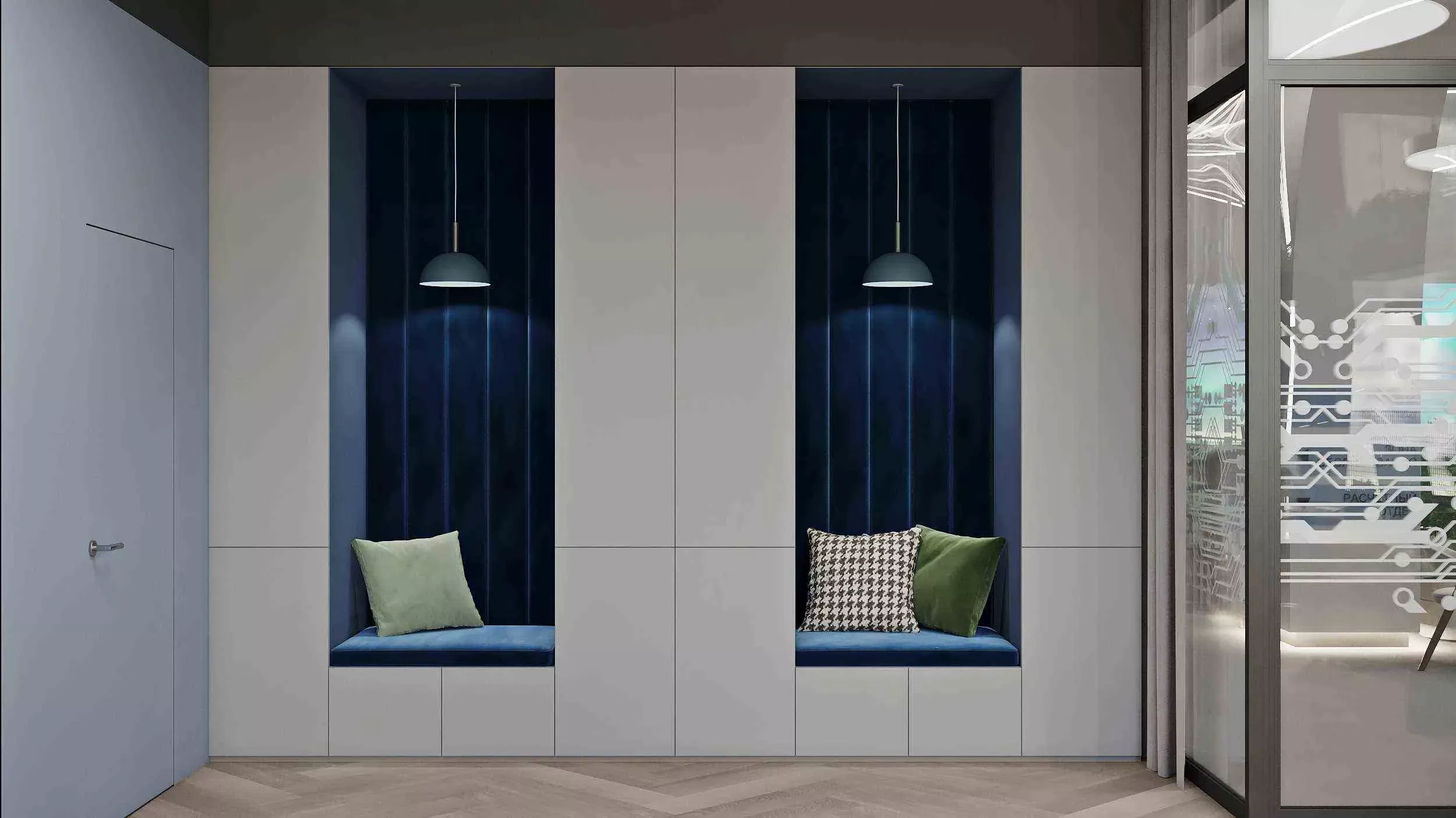 Кабинет руководителя, оформленный с элегантностью и функциональностью, включает в себя рабочий стол на тумбах с выдвижными ящиками, а также стол для переговоров, рассчитанный на 6 человек. Два шкафа дополняют интерьер: один со стеклянными дверьми и внутренней подсветкой, другой — с возможностью установки световой панели, где три центральные части представляют собой глухие панели, а две боковые панели служат дверьми.