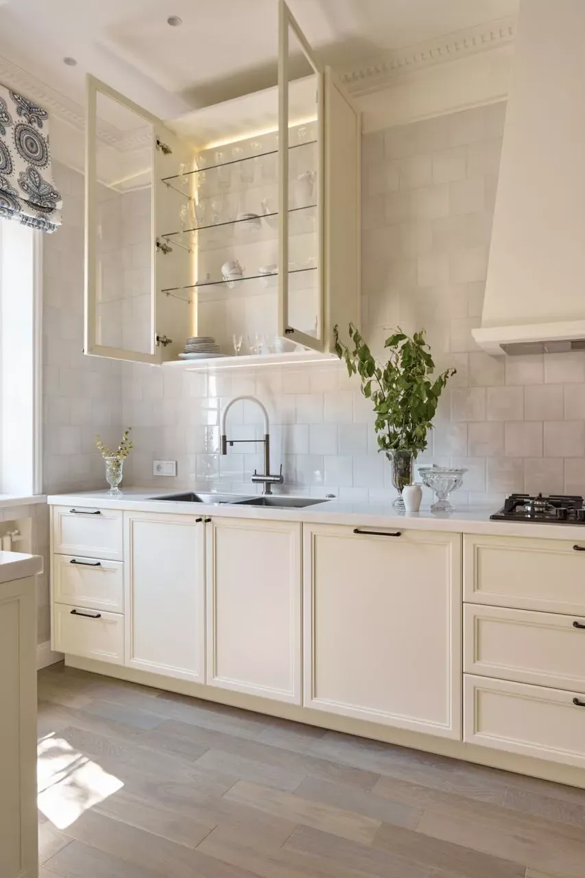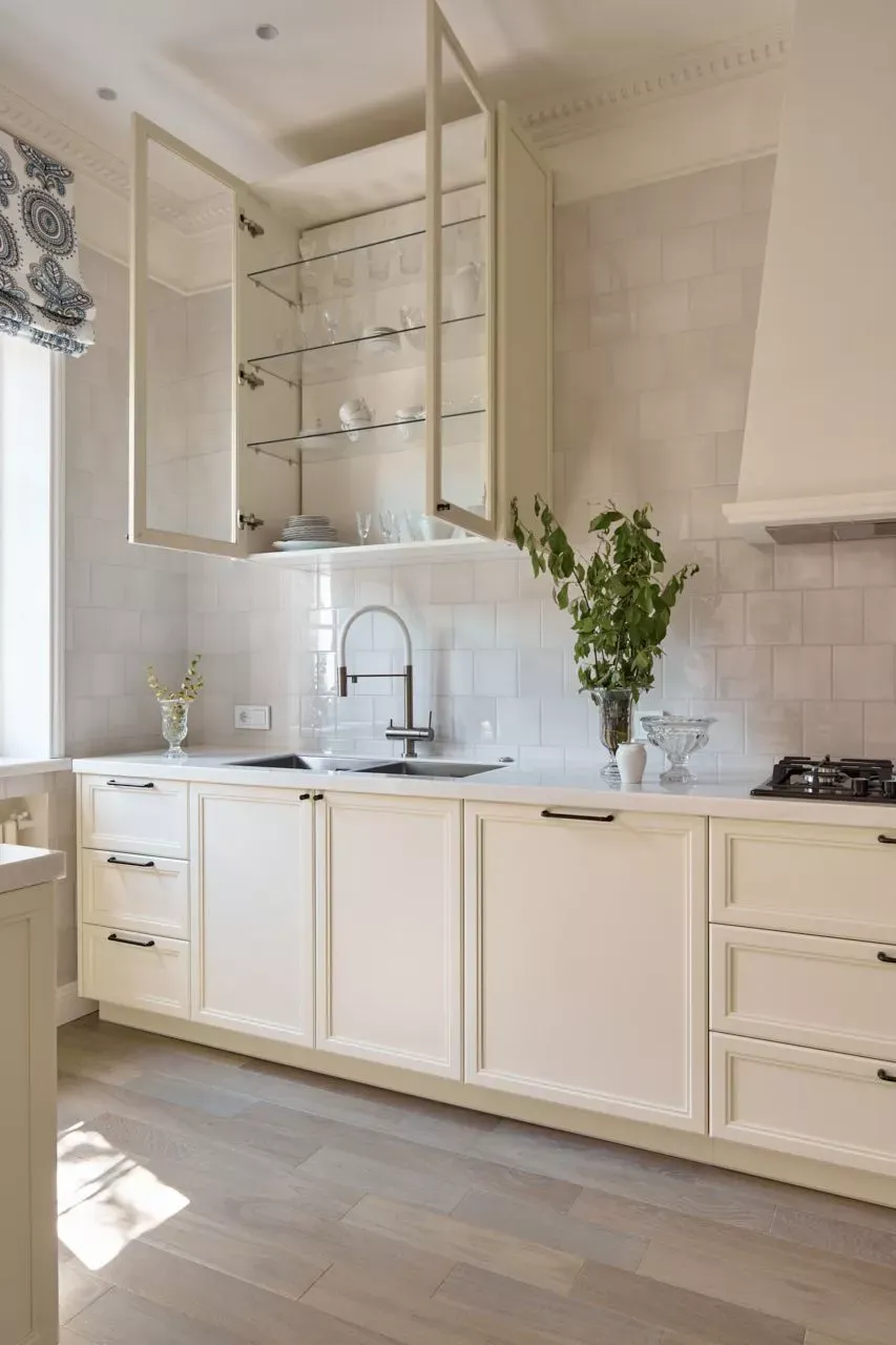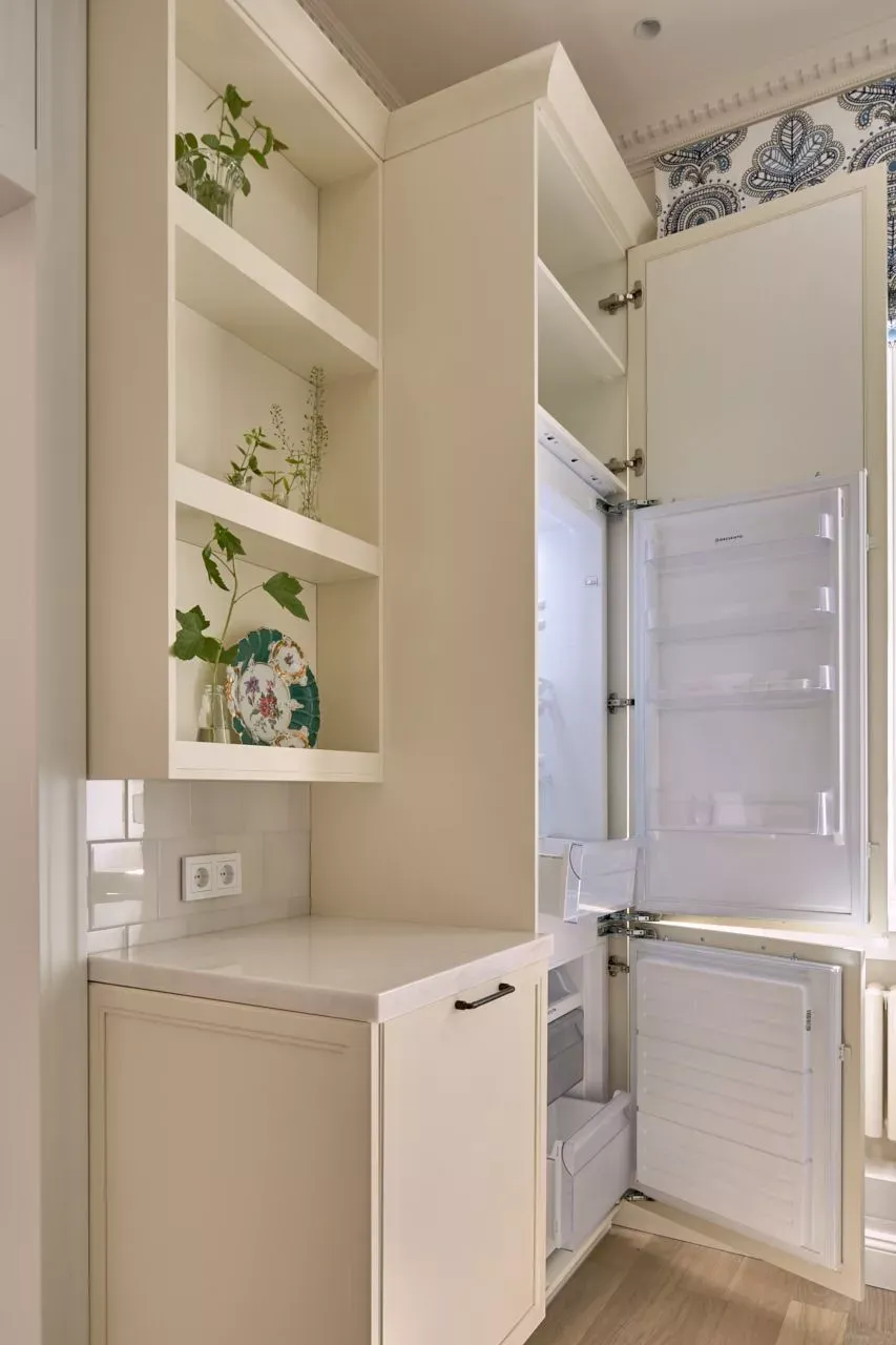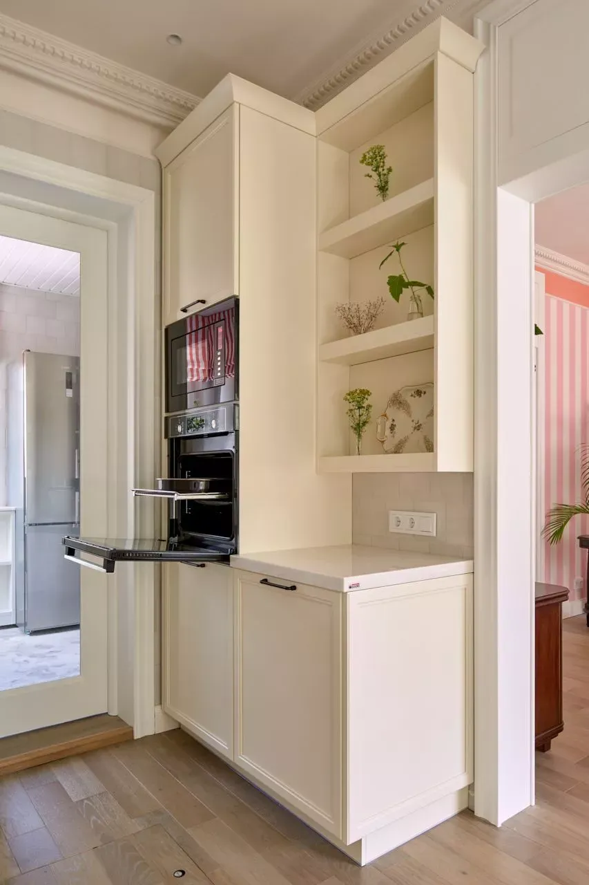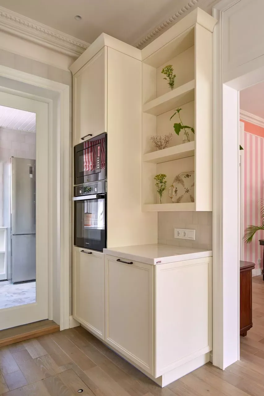 Над низкими модулями на стене смонтированы неглубокие открытые витрины для размещения там красивой посуды/тарелок. Витрины вплотную пристыкованы к высоким колонкам, и всё это увенчано декоративными карнизами (МДФ) в том же стиле Неоклассика.