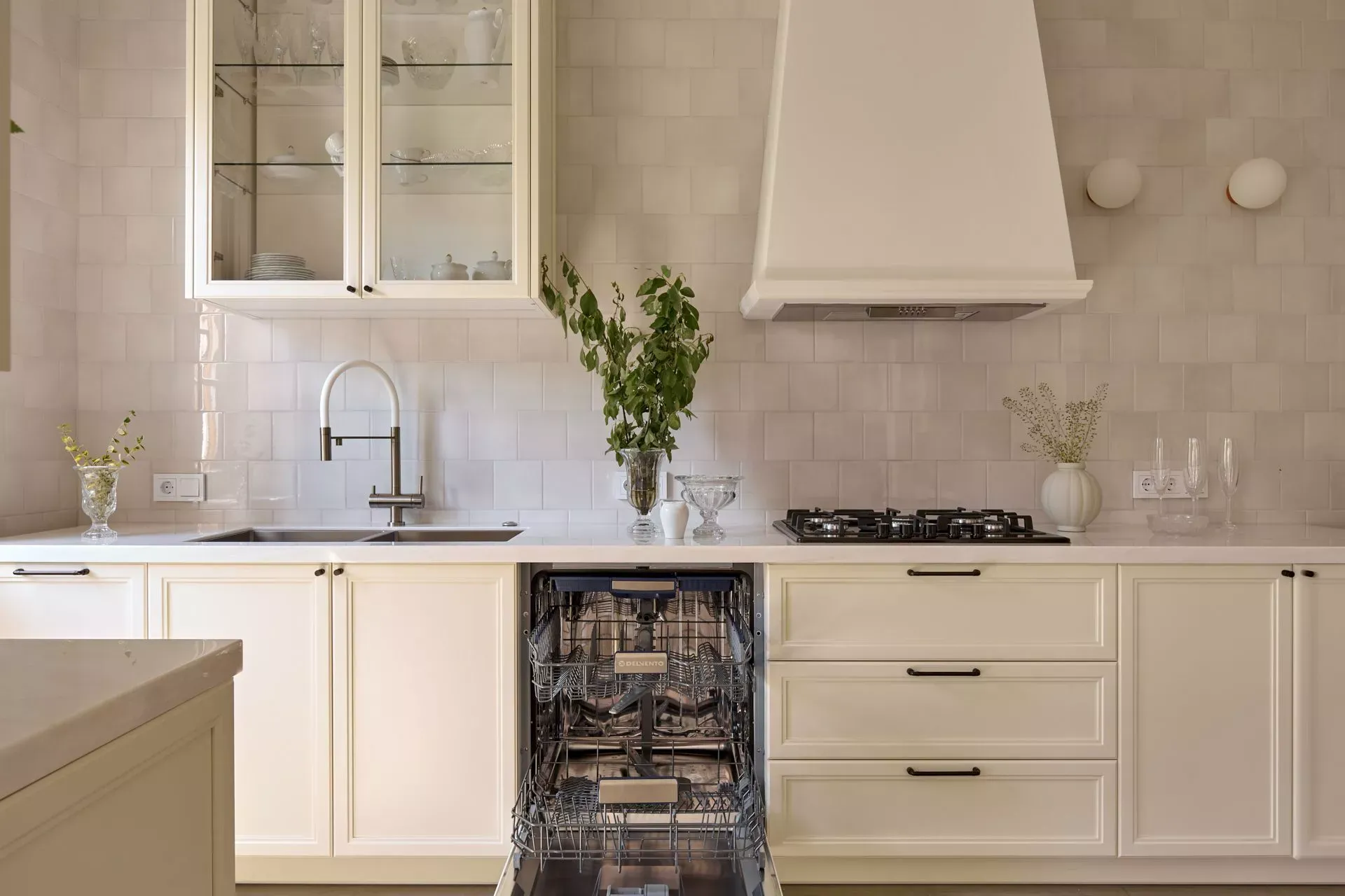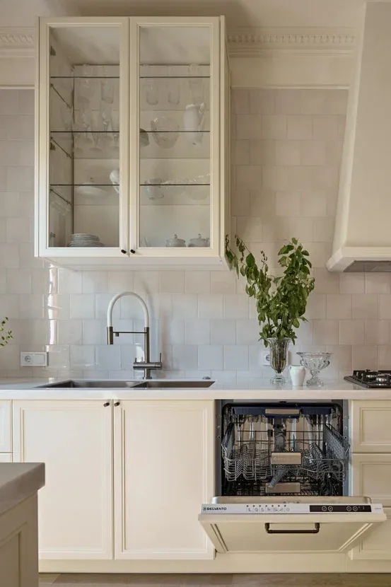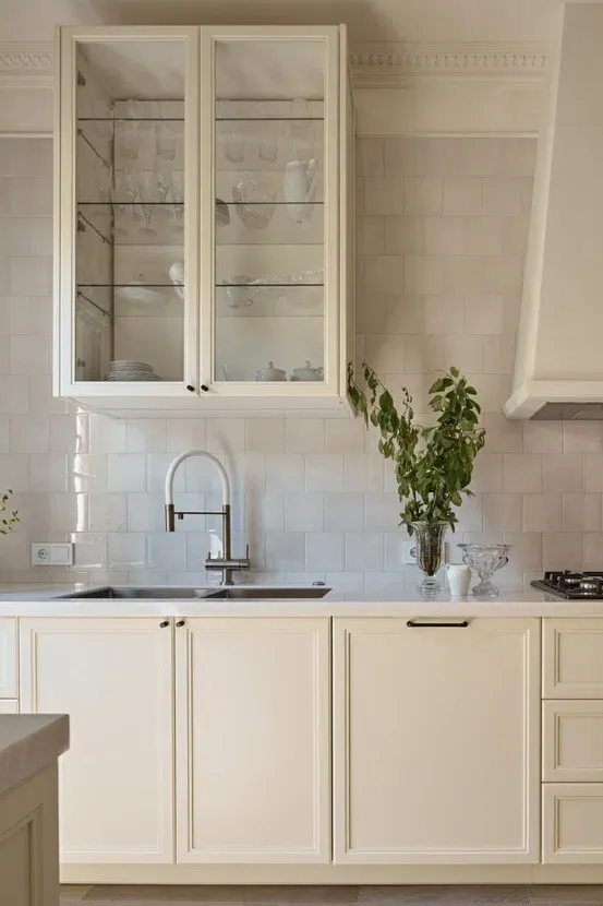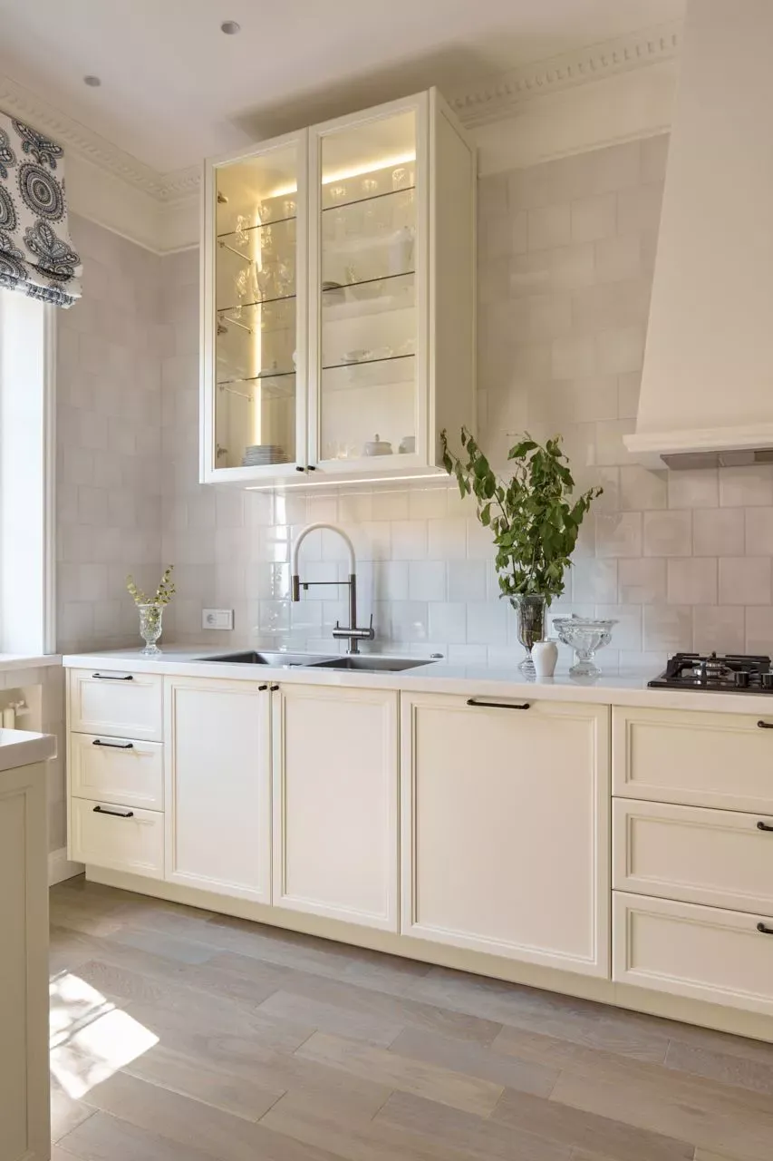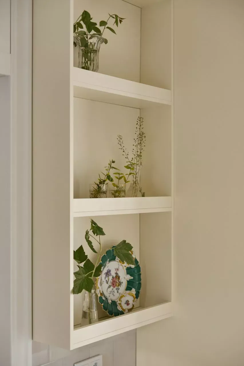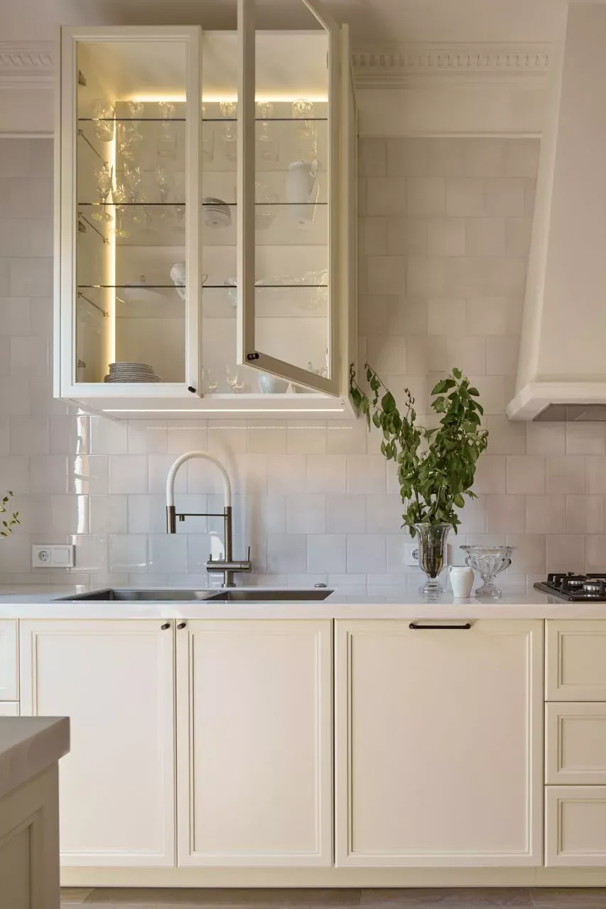 Над низкими модулями на стене смонтированы неглубокие открытые витрины для размещения там красивой посуды/тарелок. Витрины вплотную пристыкованы к высоким колонкам, и всё это увенчано декоративными карнизами (МДФ) в том же стиле Неоклассика.
