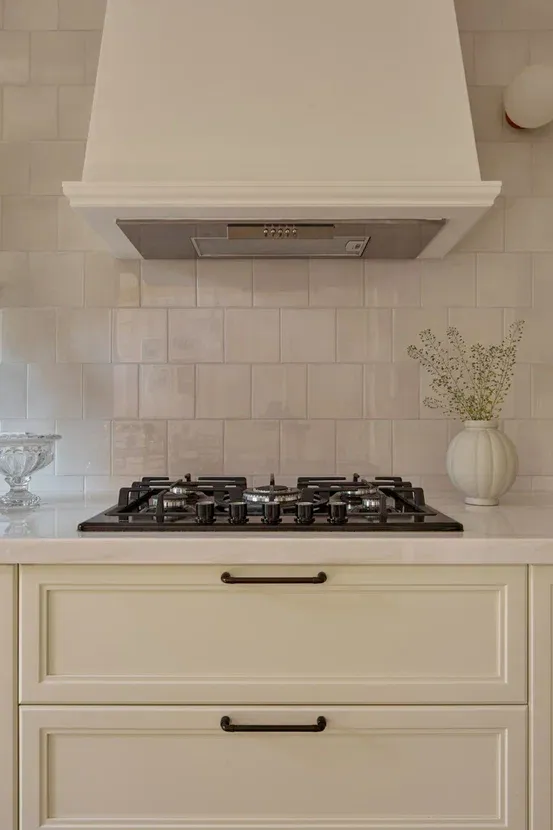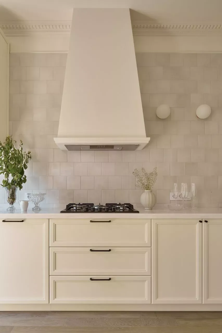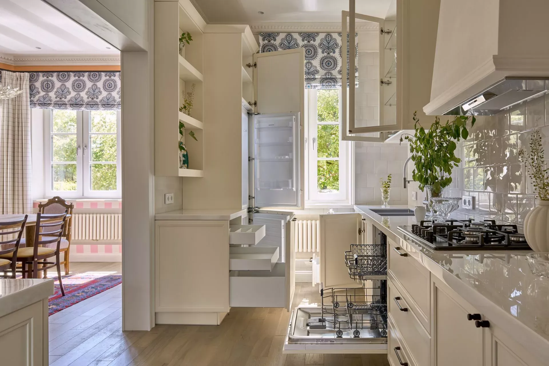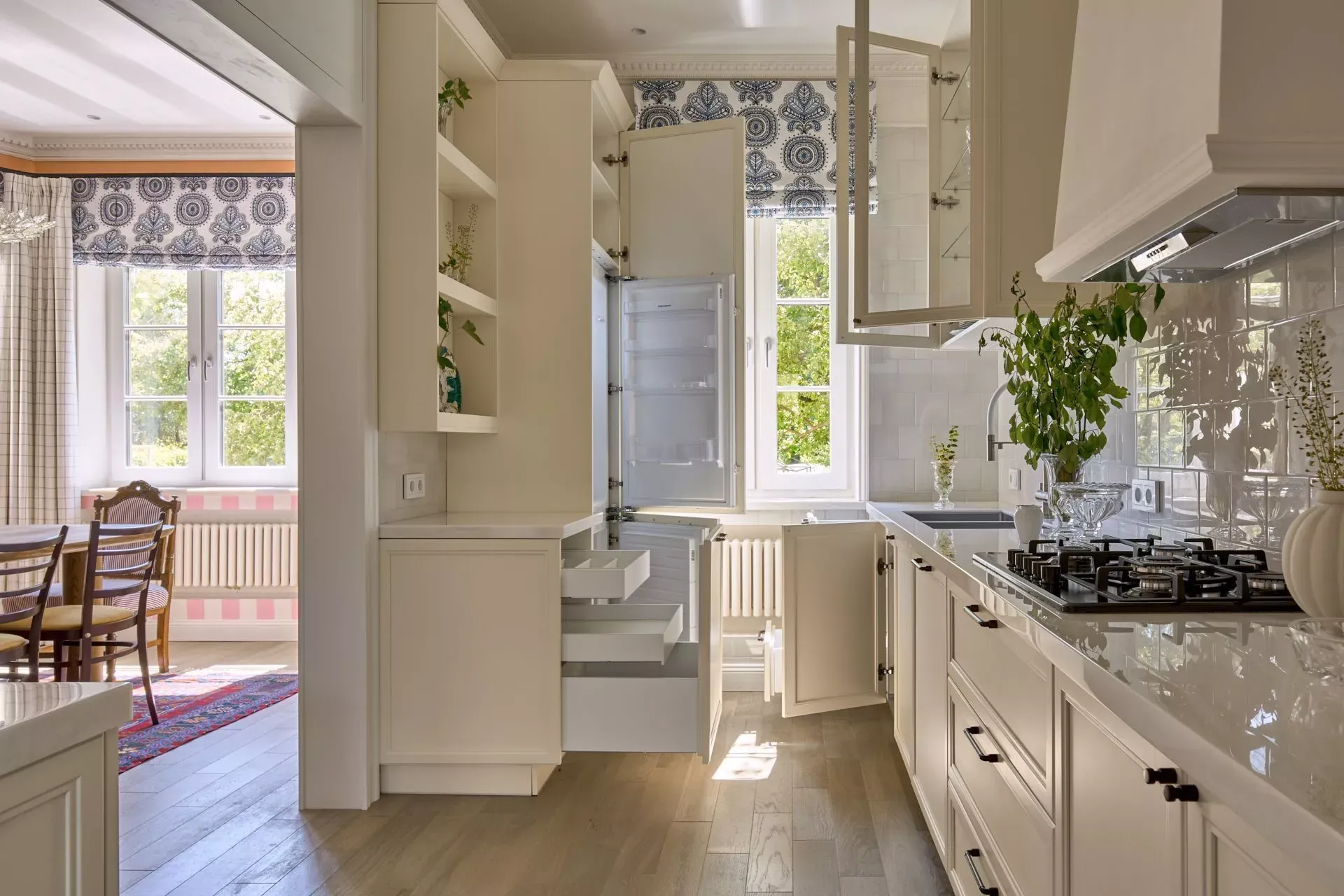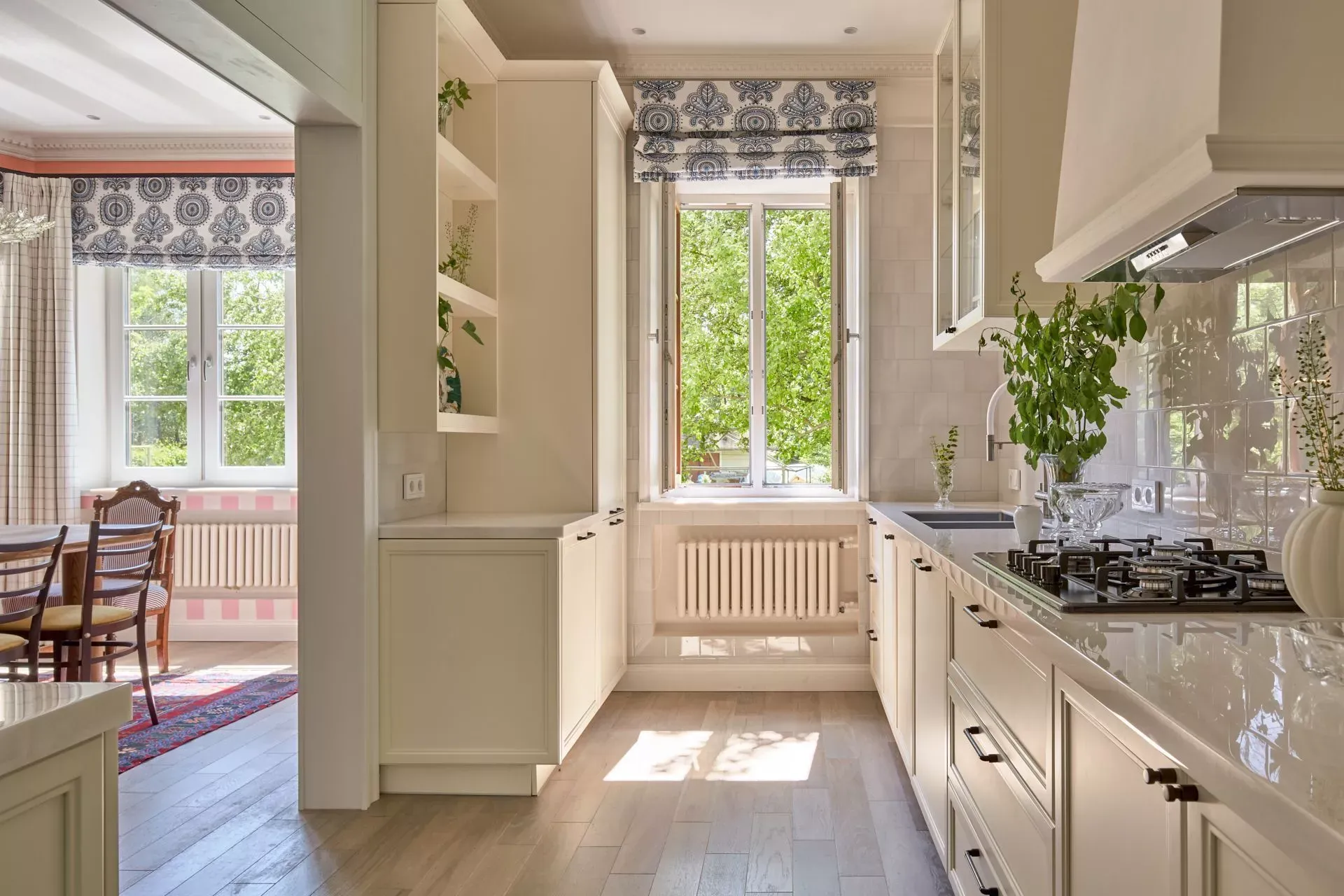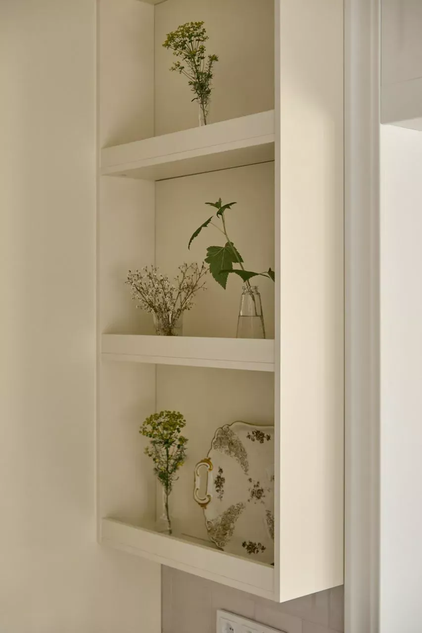 Над низкими модулями на стене смонтированы неглубокие открытые витрины для размещения там красивой посуды/тарелок. Витрины вплотную пристыкованы к высоким колонкам, и всё это увенчано декоративными карнизами (МДФ) в том же стиле Неоклассика.
