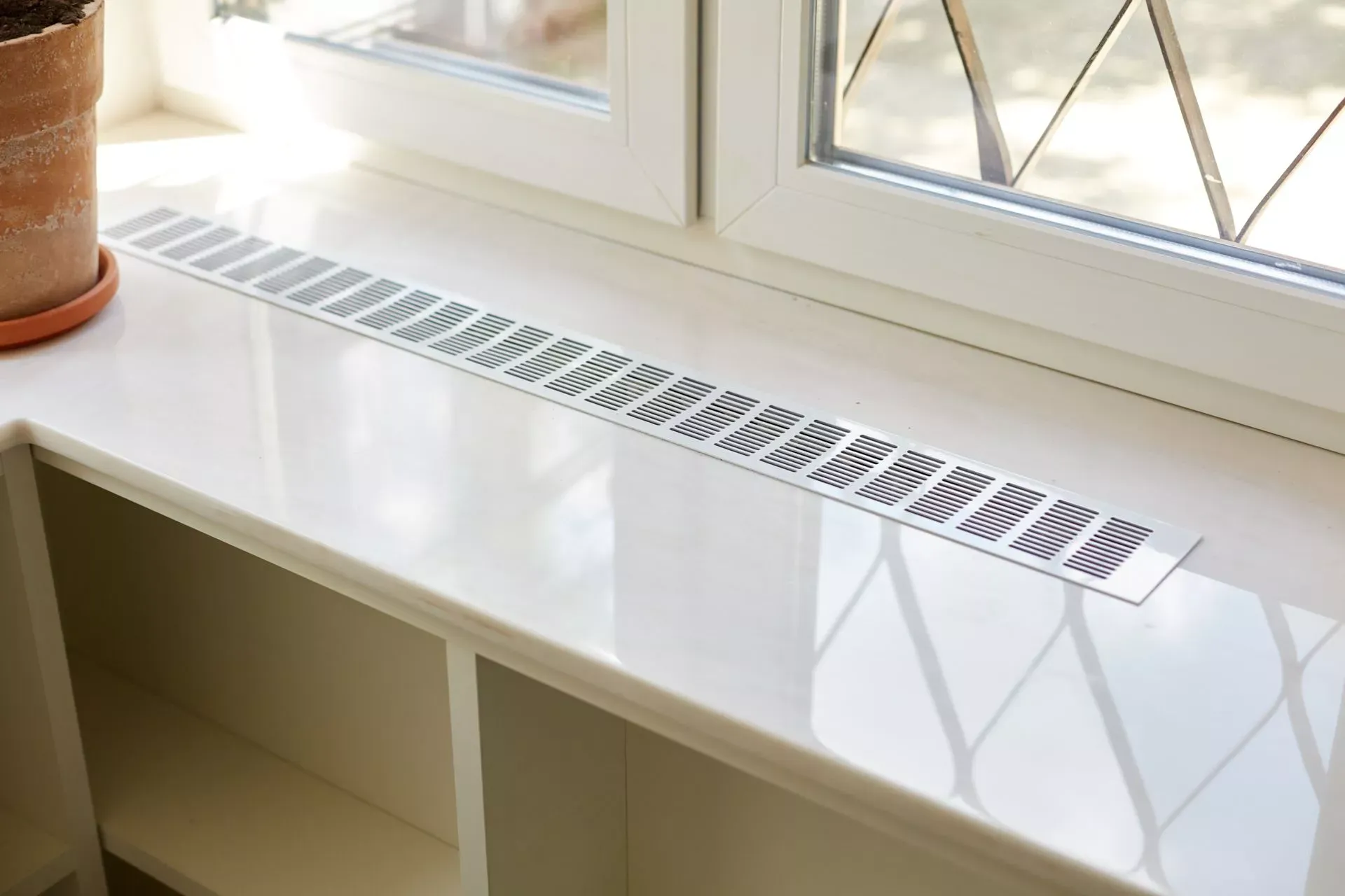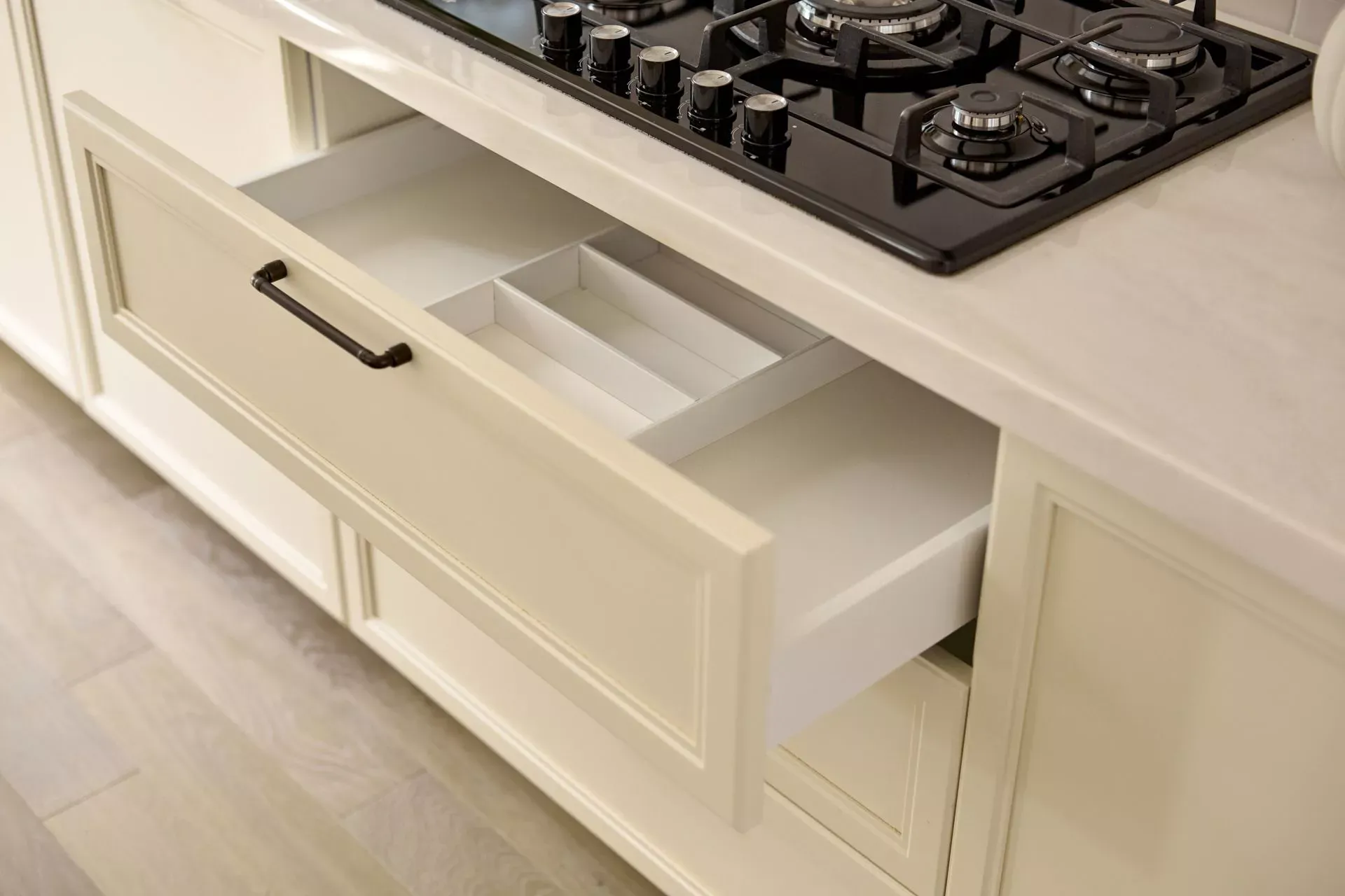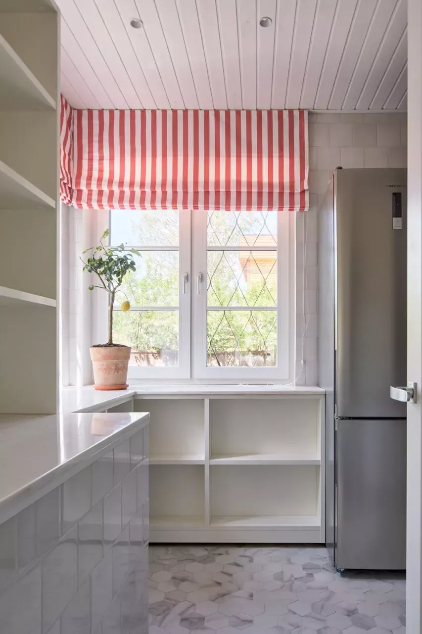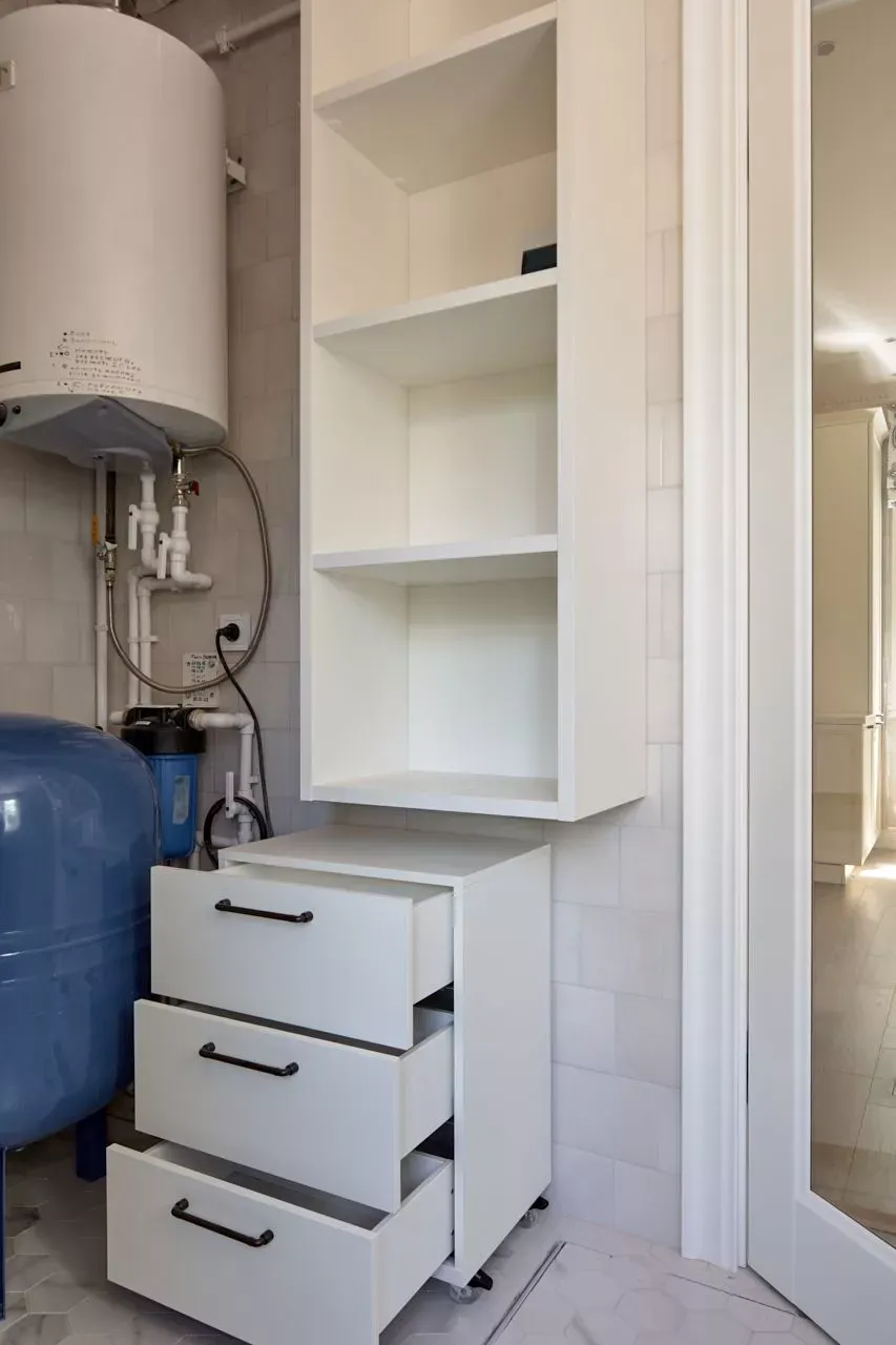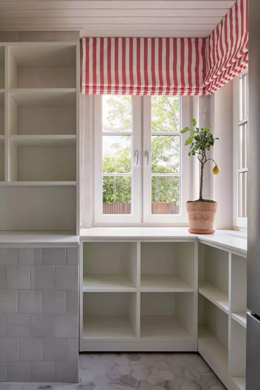 Над низкими модулями на стене смонтированы неглубокие открытые витрины для размещения там красивой посуды/тарелок. Витрины вплотную пристыкованы к высоким колонкам, и всё это увенчано декоративными карнизами (МДФ) в том же стиле Неоклассика.