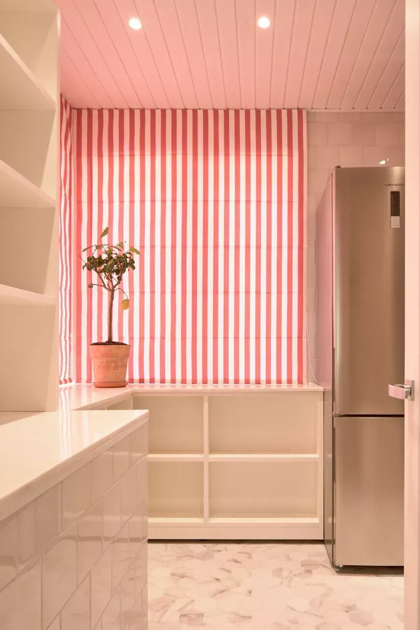Вся отделка мебели встречной стены дублирует отделку основной зоны (те же эмаль, камень, цоколь, фасады, сайды).