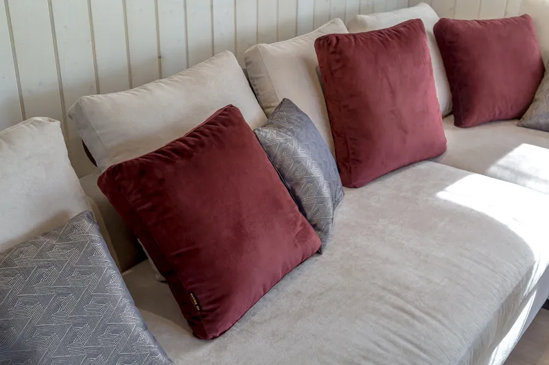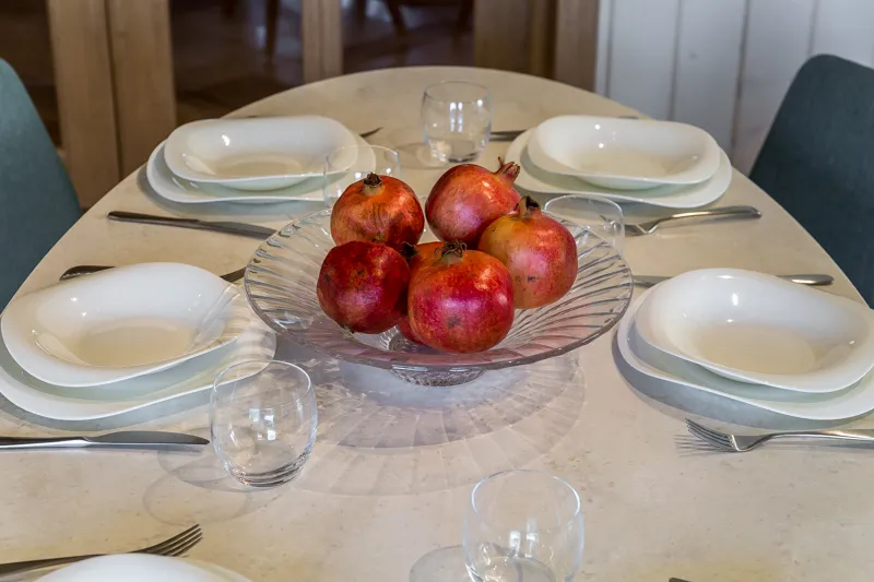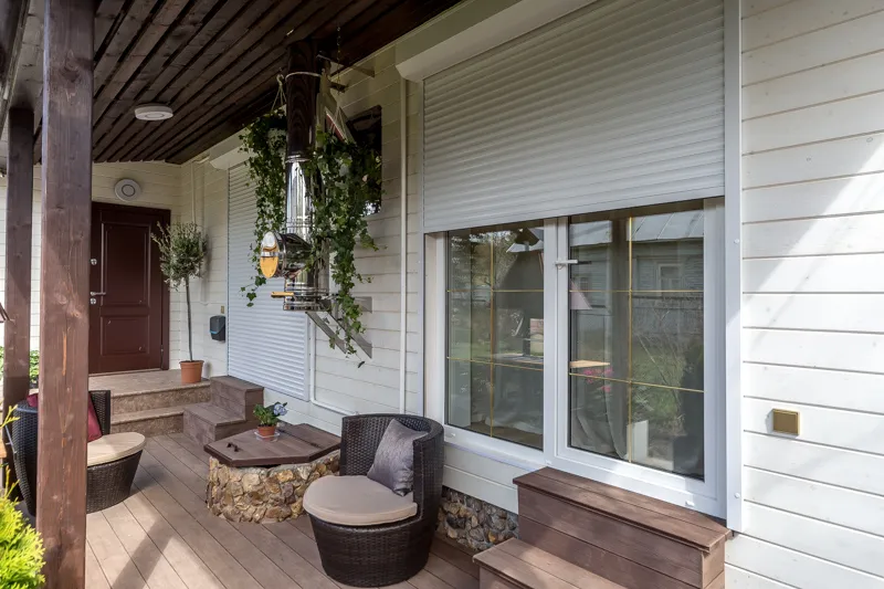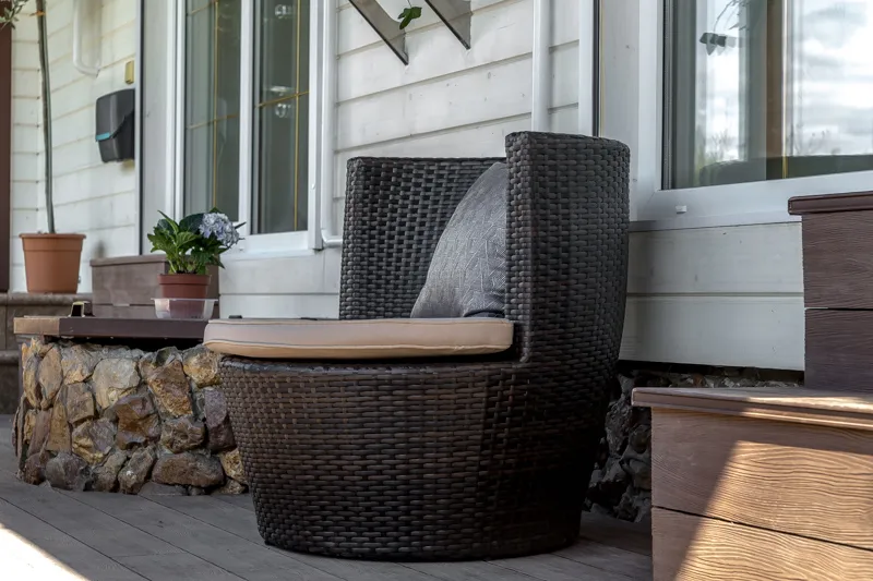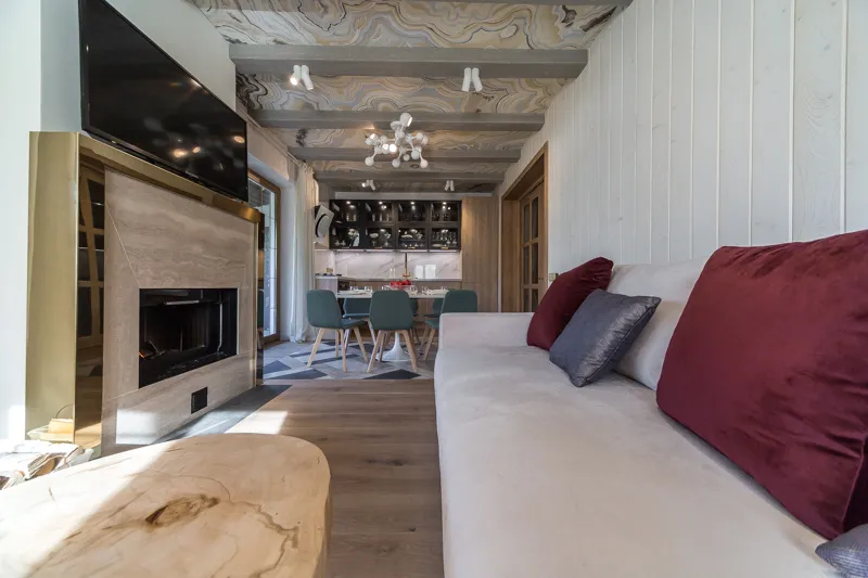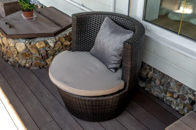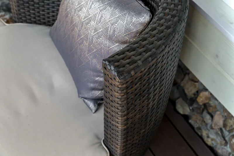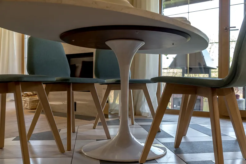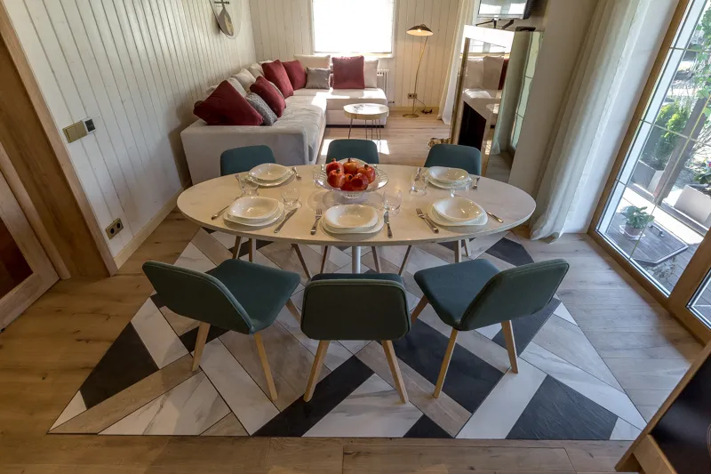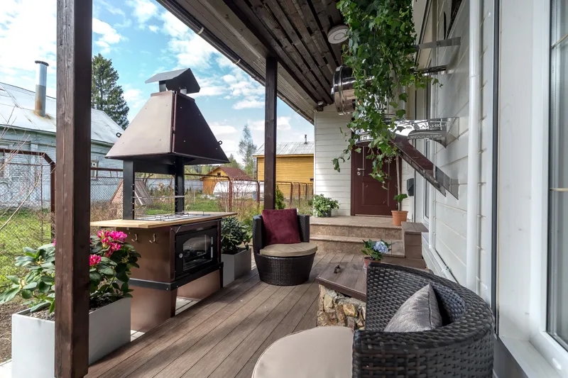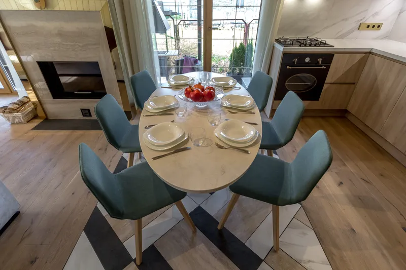 Зону столовой оборудовали большим обеденным столом с каменной столешницей «под мрамор» с шестью стульями, а также большим диваном и кофейным столиком. Большой камин между двумя окнами согреет обитателей дома в холодное время года. На террасе разместилась устойчивая к капризам погоды и уютная садовая мебель.