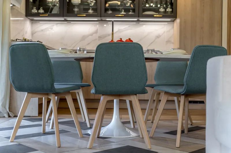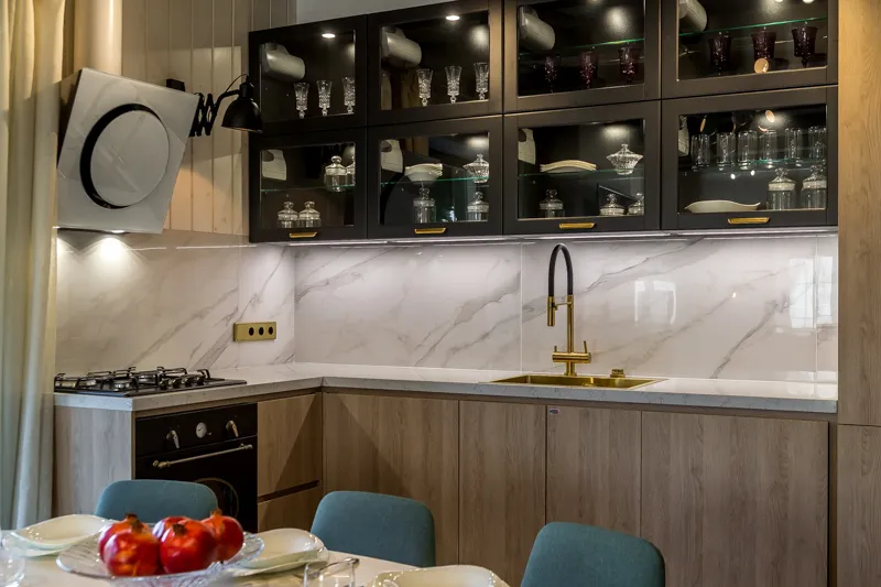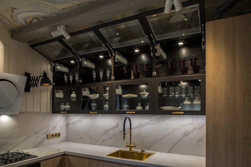 Для кухонной зоны выбрали гарнитур, сочетающий в себе функциональные и декоративные стороны. Фасады верхних модулей — с рамой из МДФ в матовой эмали «Графит» и прозрачными стеклянными вставками. Верхний ряд фасадов открывается с помощью электропривода, нижний — откидной. Внутри модулей разместили точечну/ подсветку, которая помогает демонстрировать коллекцию посуды.