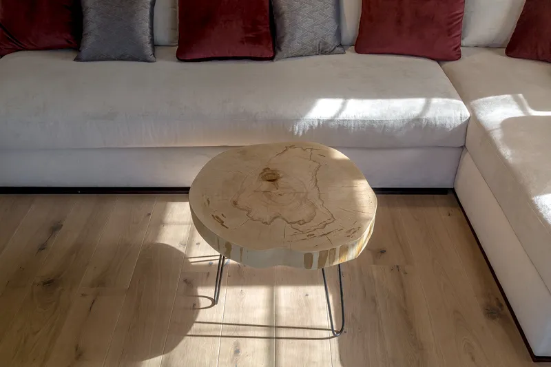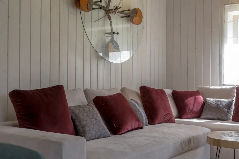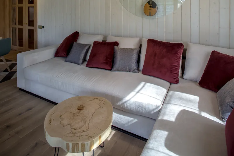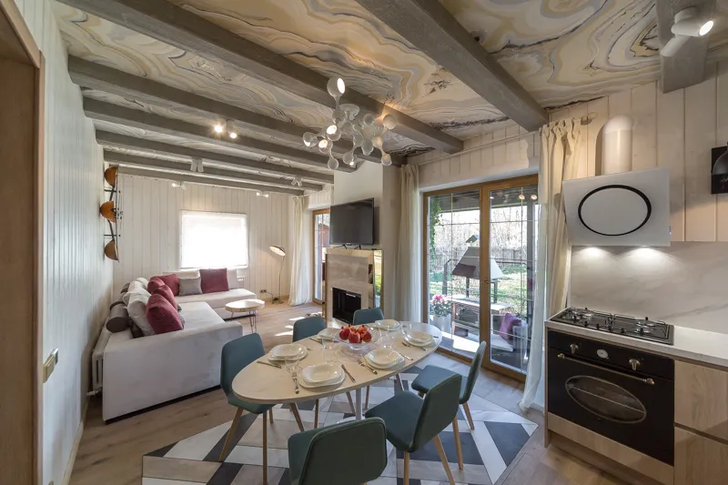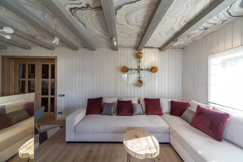 Стены отделали вагонкой в светлых тонах, для пола выбрали сочетание тёплого паркета и контрастного «ковра» из керамического гранита. Потолок авторы проекта расписали вручную — под узоры агата — и дополнили множеством светильников. Больше света комнате обеспечили и окна-двери в пол, которые объединяют террасу с гостиной.