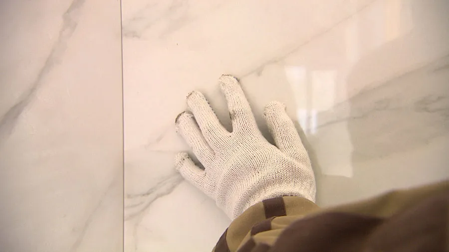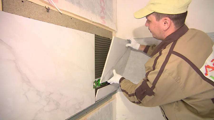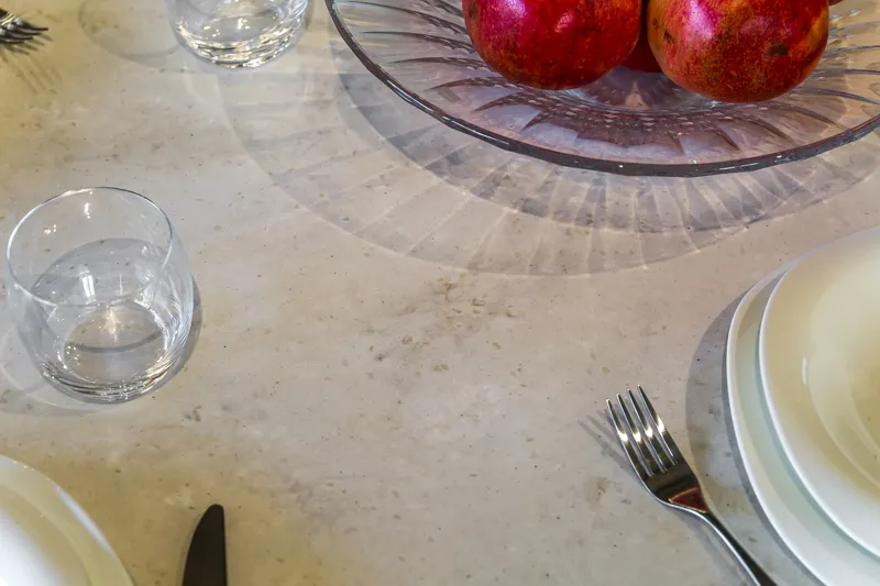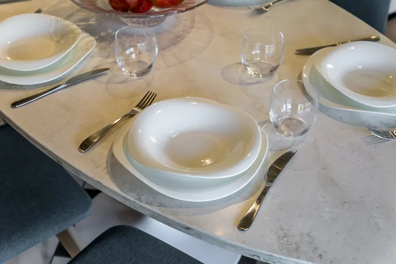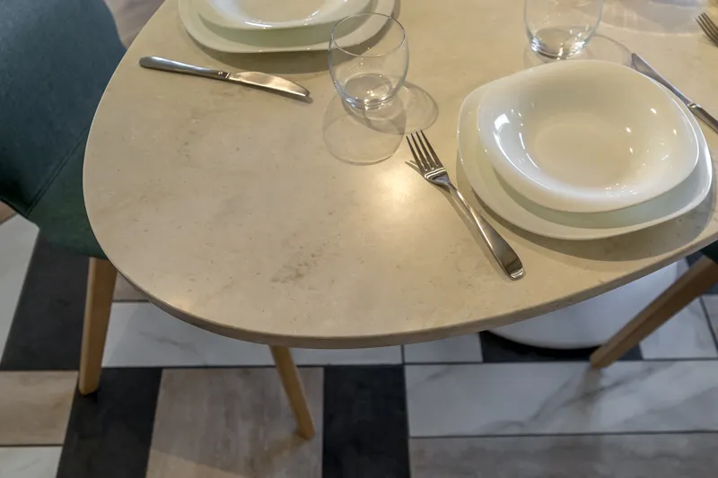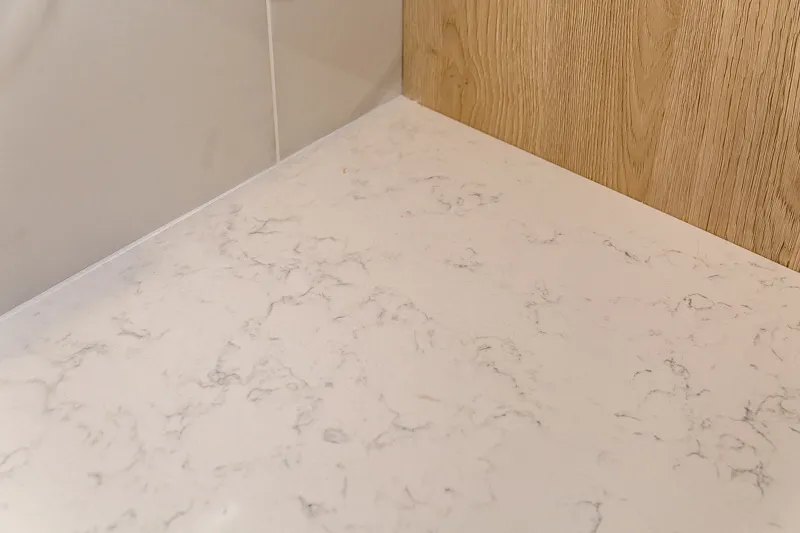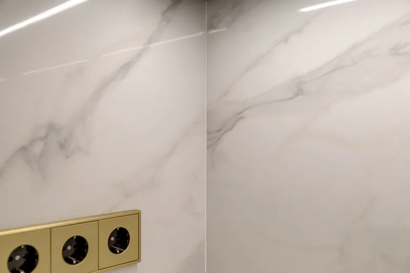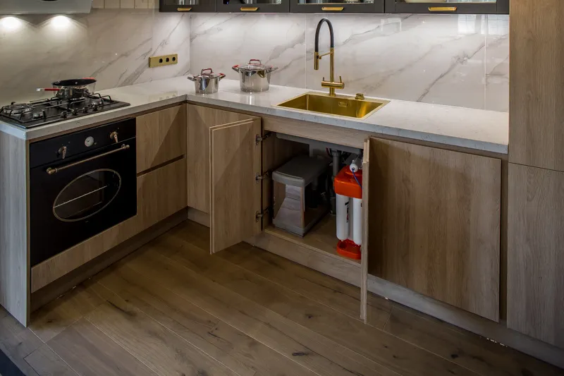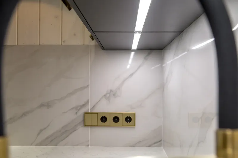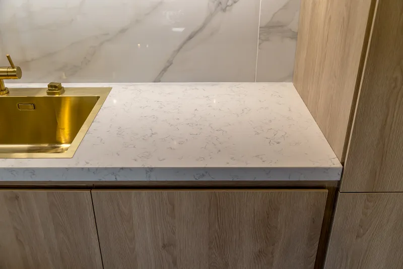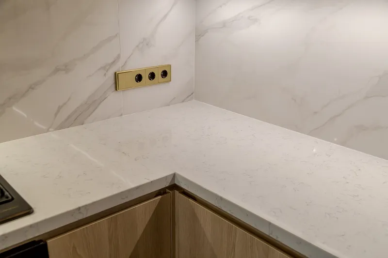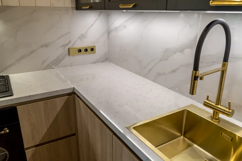 Прочная столешница из дроблёного камня «Кварцелан» и фартук из обрезного керамического гранита выглядят так, будто сделаны из мрамора. В центре композиции — яркая золотая раковина.
