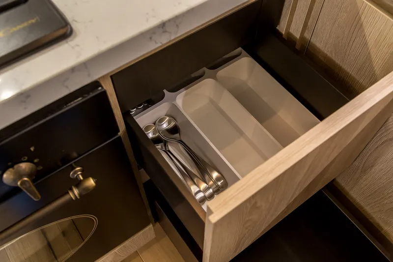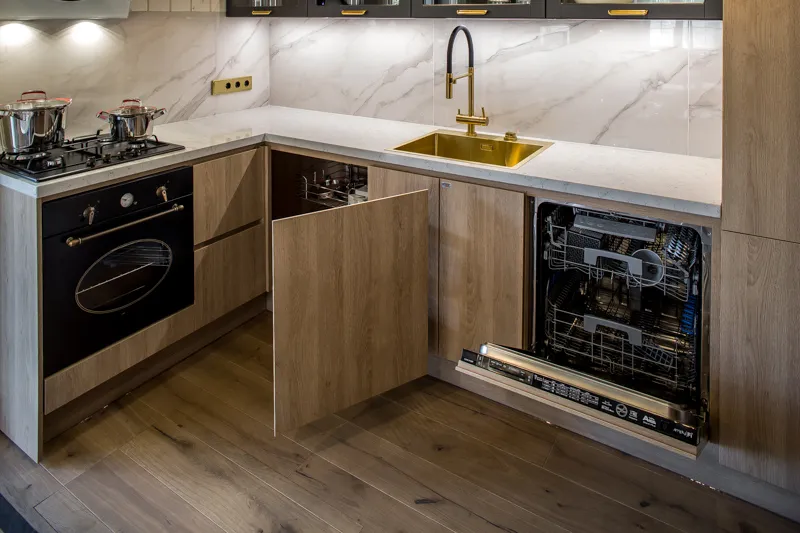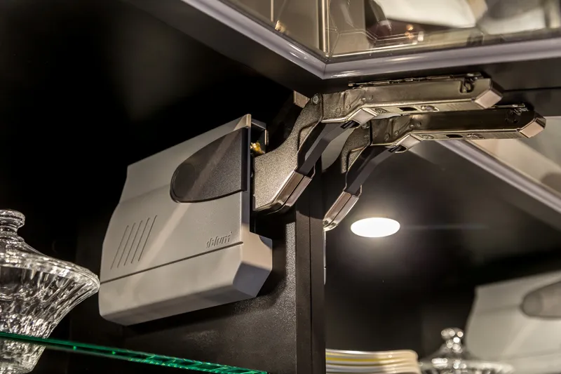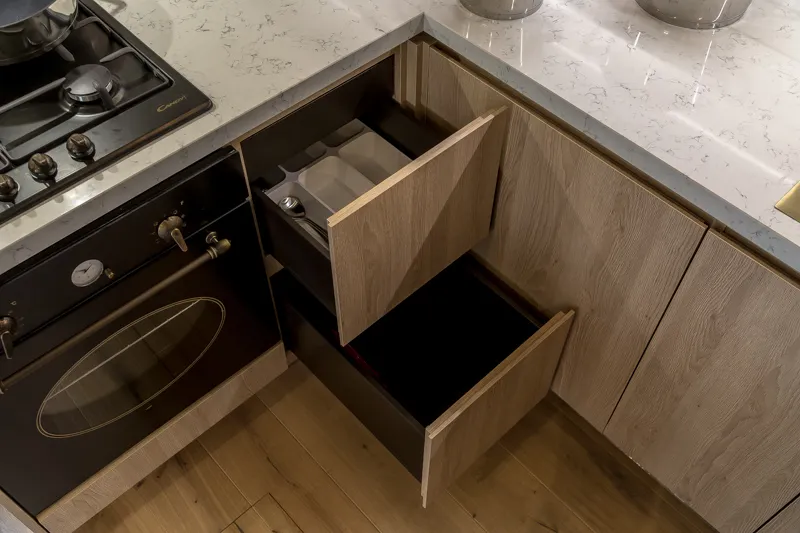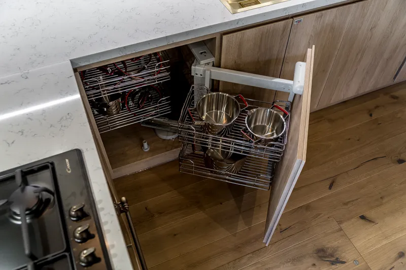 Под верхними модулями установлена линейная диодная подсветка, которая освещает рабочую поверхность кухни. В нижней части кухни установили модули под духовой шкаф с выдвижным ящиком внизу, под посудомоечную машину и холодильник, а также под мойку (с двумя распашными фасадами — для хранения чистящих средств и установки ведра для отходов). Модуль с тремя выдвижными ящиками с коробом Легробокс обеспечивают удобное хранение кухонной утвари, а один из них — скрытый и используется для хранения приборов. Кроме того, угловой модуль с системой хранения «Волшебный уголок» позволяет наиболее оптимально использовать скрытое пространство и экономить место.