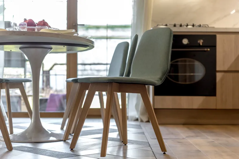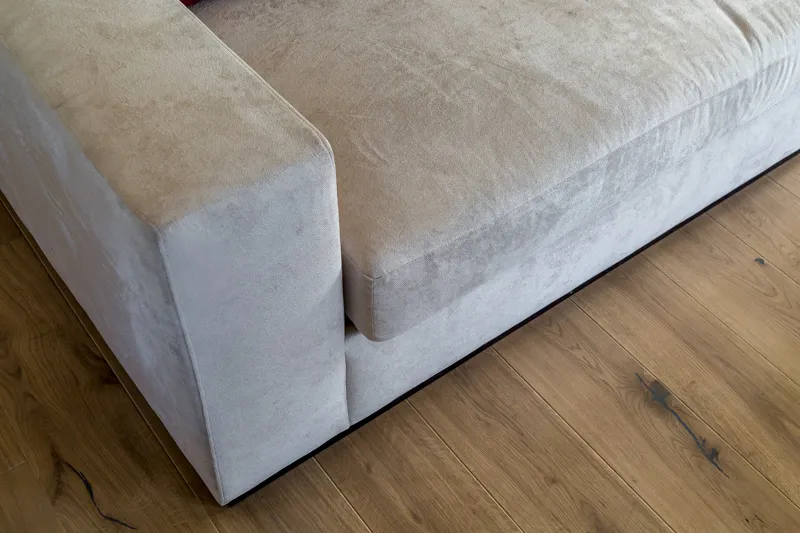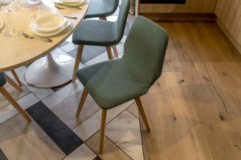 Фасады нижних модулей серии SCALA не оборудованы ручками — для захвата в их конфигурации предусмотрена удобная ступенька. Эти фасады выполнены из ДСП в декоре «Дуб Гладстон» из коллекции «Филвуд», который выглядит максимально реалистично за счёт использования при создании специального пресса: он формирует объёмные текстурные поры, повторяющие рисунок дерева.
