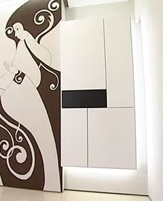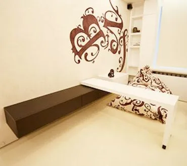 И ящики, и полка сделаны без ручек и открываются с помощью механизма Push-to-open – достаточно лишь слегка нажать на дверцу. Оригинальность композиции ящиков придает поворотный столик. Когда он не нужен, то располагается над консолью вдоль стены, а в случае необходимости выкатывается перпендикулярно всей конструкции.