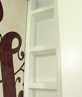 Стеллаж и подоконник в том же декоре выполнены из панелей «Тамбурато» шириной 36 и 50 мм.