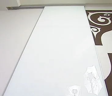 Каркас двери окантован алюминиевым профилем так, что видна только узкая полоска канта, что придает конструкции изящество и воздушность.