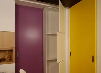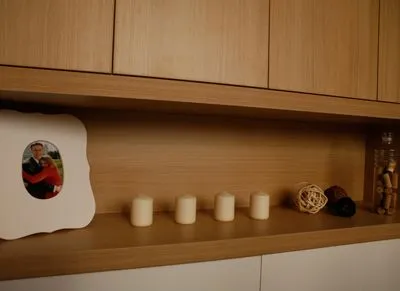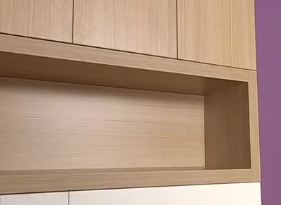 По бокам от входной двери в комнату расположены два закрытых стеллажа: узкий и широкий. По центру широкого стеллажа оставлено открытое пространство для хранения различных мелочей и книг, оформленное с помощью декоративных панелей «Тамбурато» толщиной 43 мм в цвете «Дуб Феррара». Из этого же декора выполнены четыре фасада, закрывающие секции, прилегающие к нише сверху.