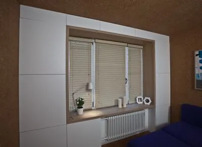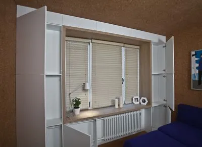 По периметру окна – закрытые стеллажи. Вернее, секции, закрытые фасадами, расположены справа и слева от окна, а также внизу, а над окном, придавая композиции законченный вид, - декоративные фальш-панели, имитирующие фасады.