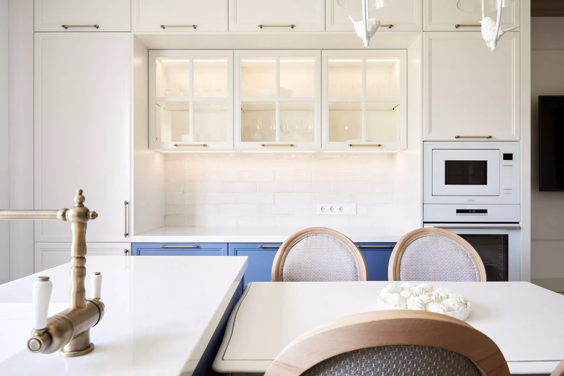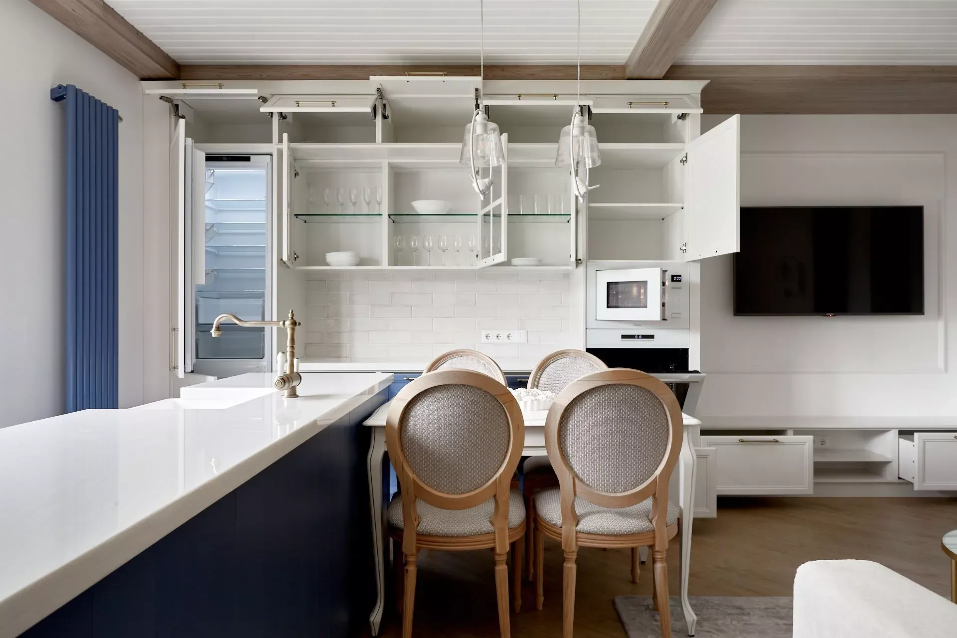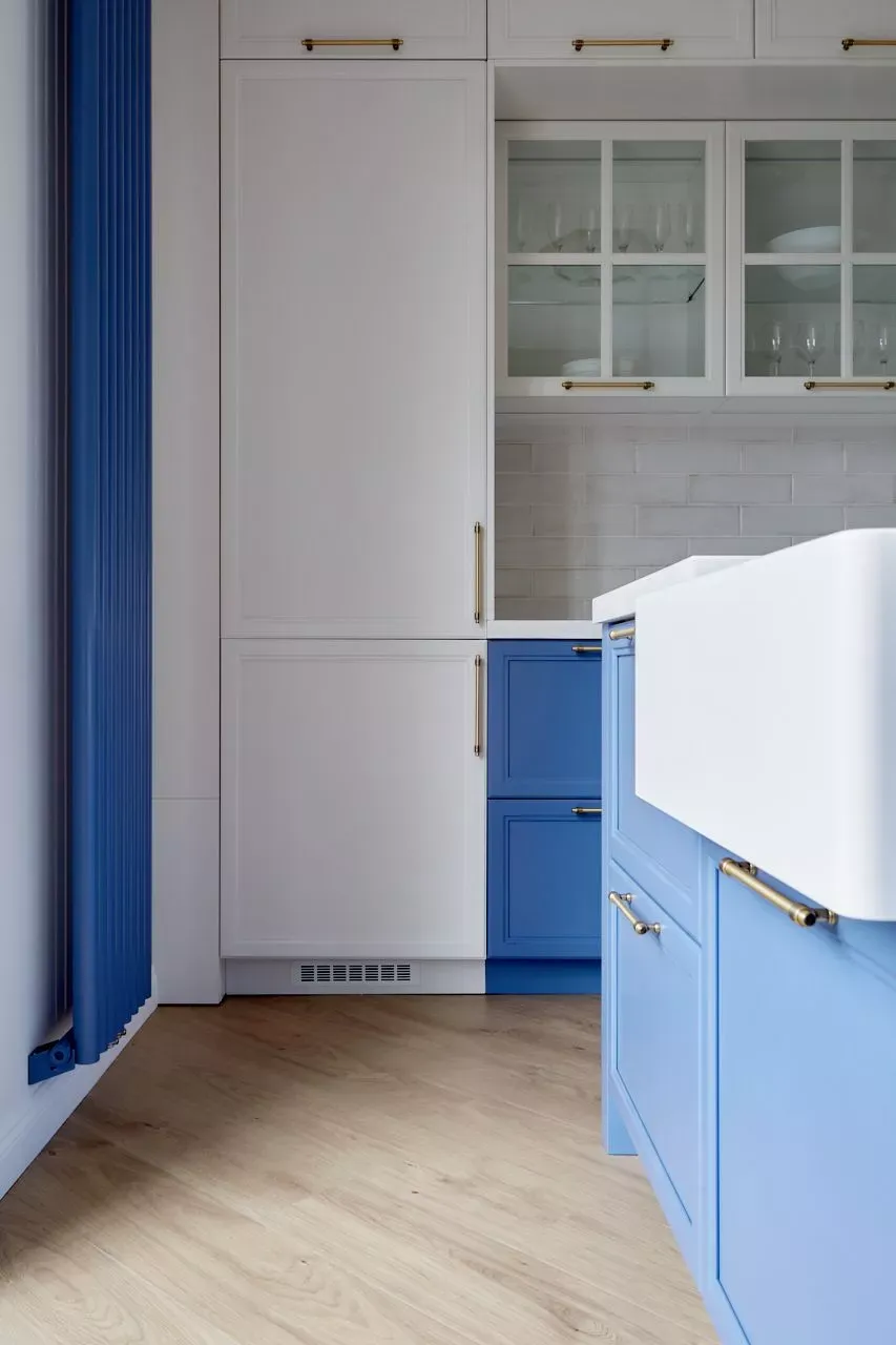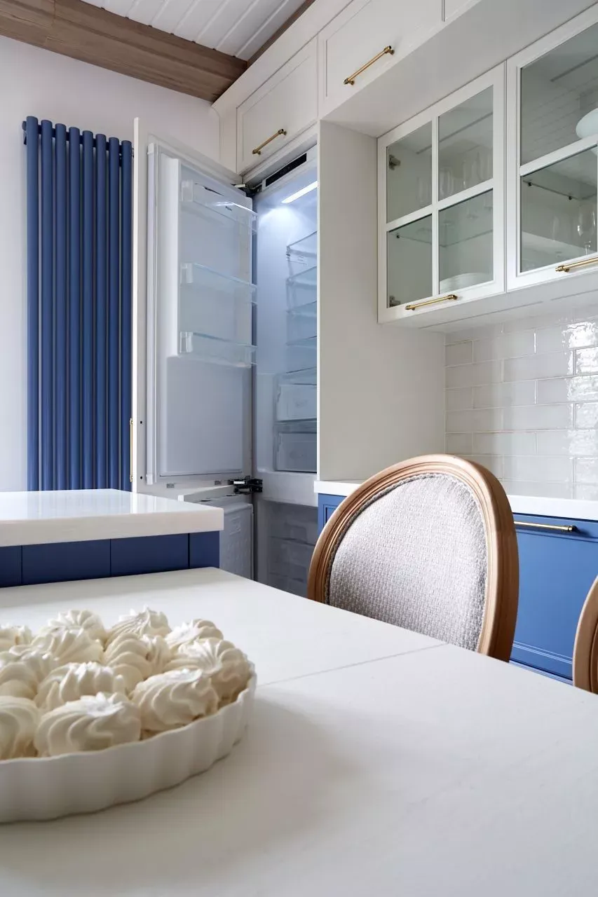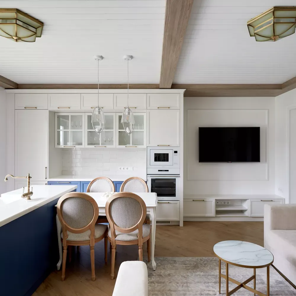 Кухня-гостиная в доме наших героев разделена на две зоны, объединенные общим стилем – Неоклассикой, фасадами серии «Урбан» и эмалью в белом и голубом.