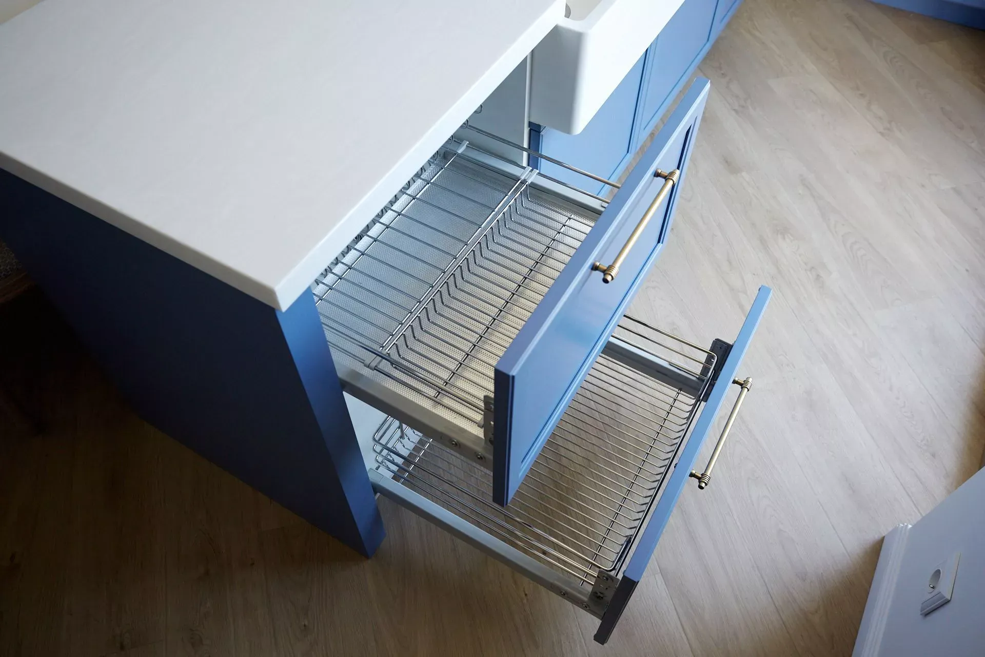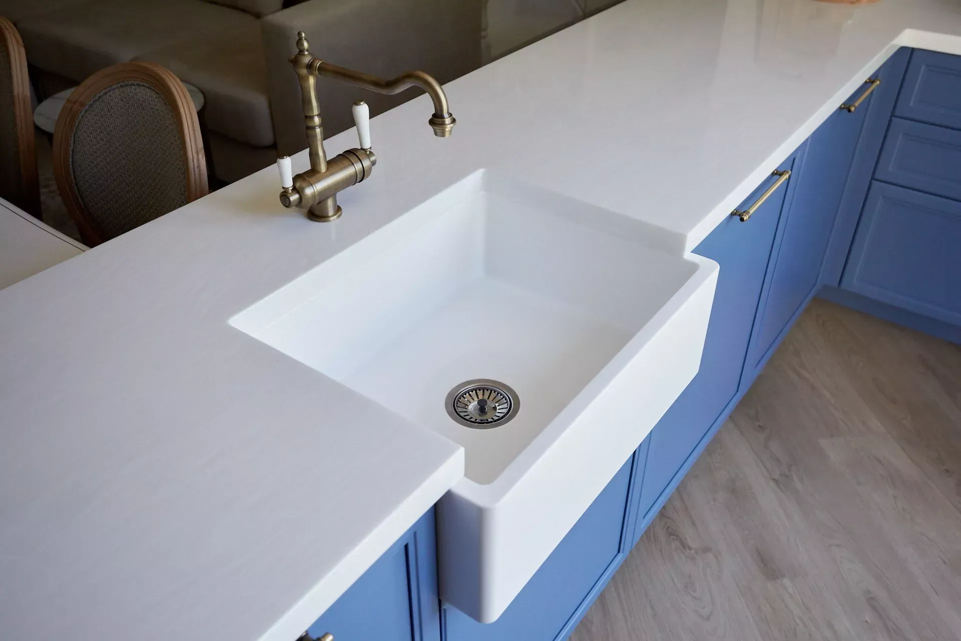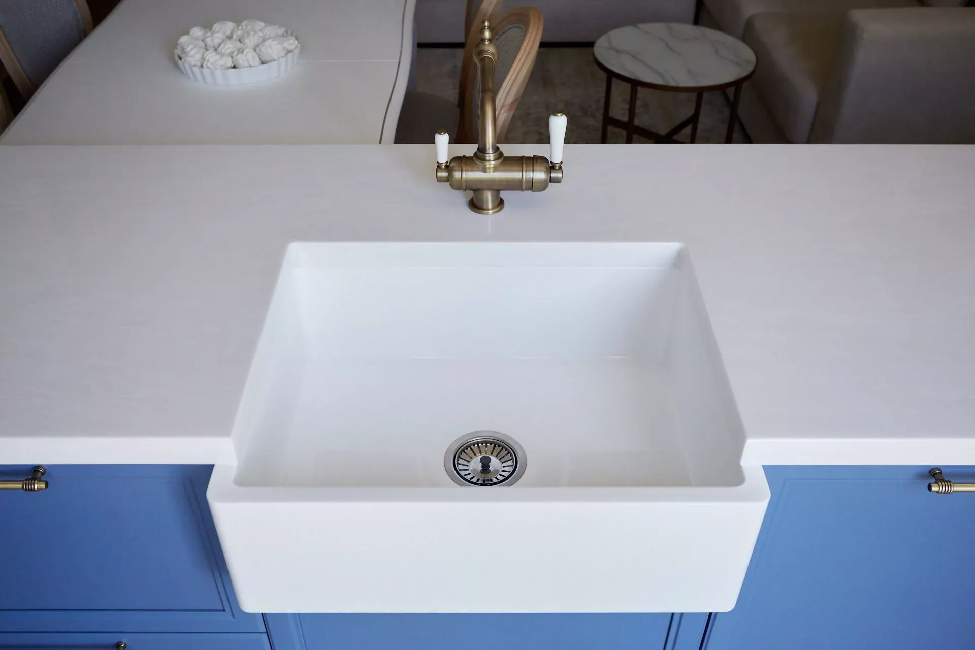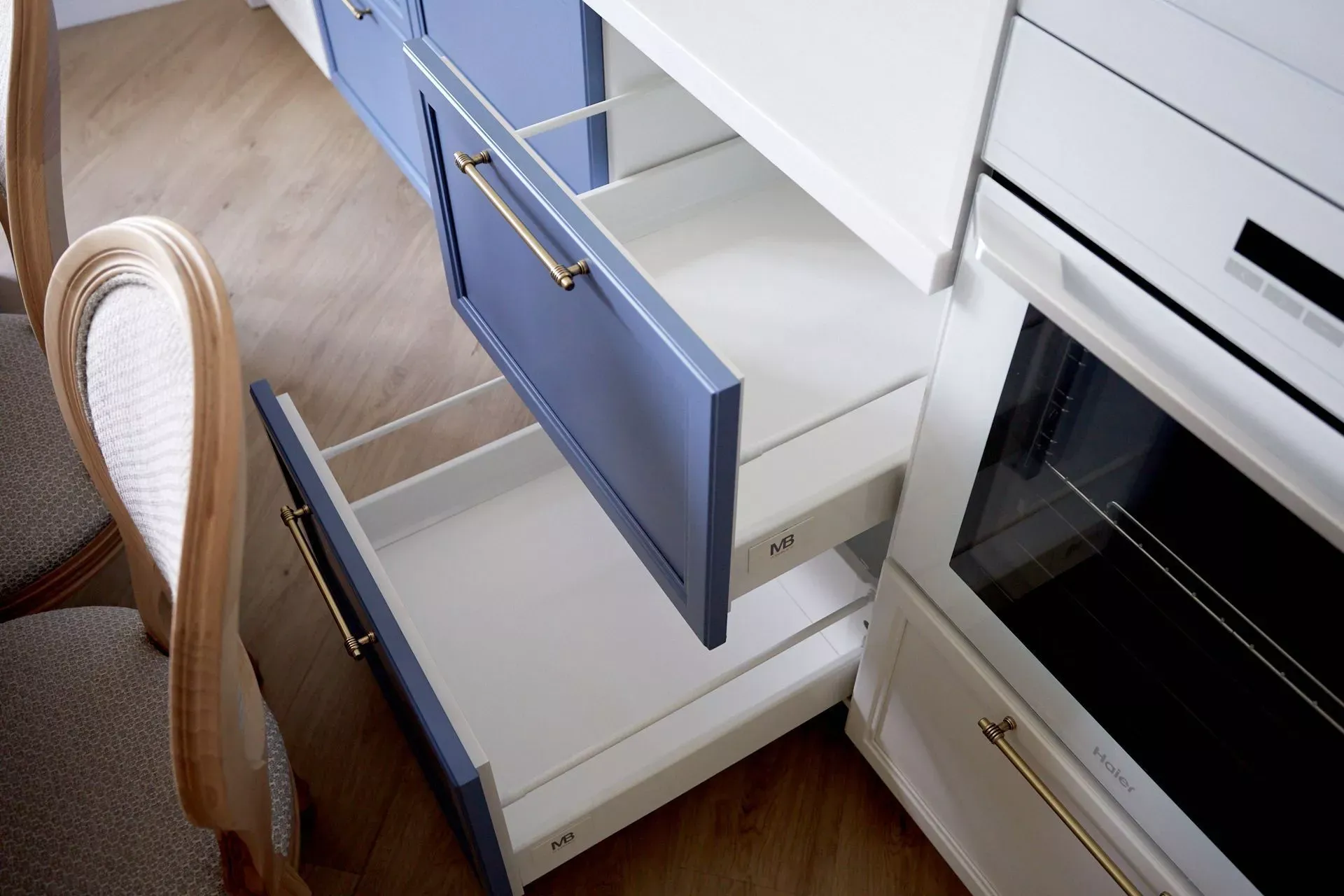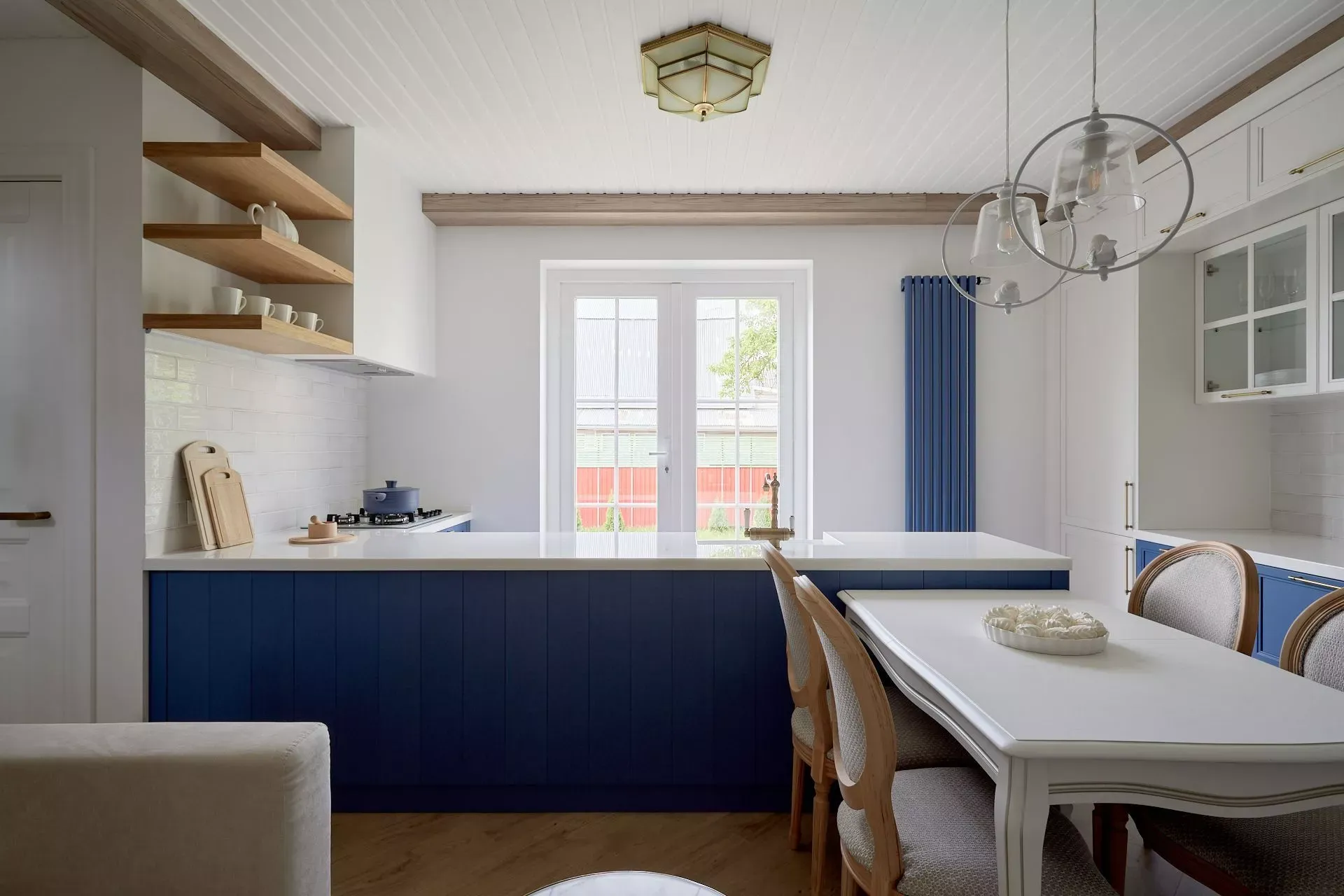 Кухня-гостиная в доме наших героев разделена на две зоны, объединенные общим стилем – Неоклассикой, фасадами серии «Урбан» и эмалью в белом и голубом.