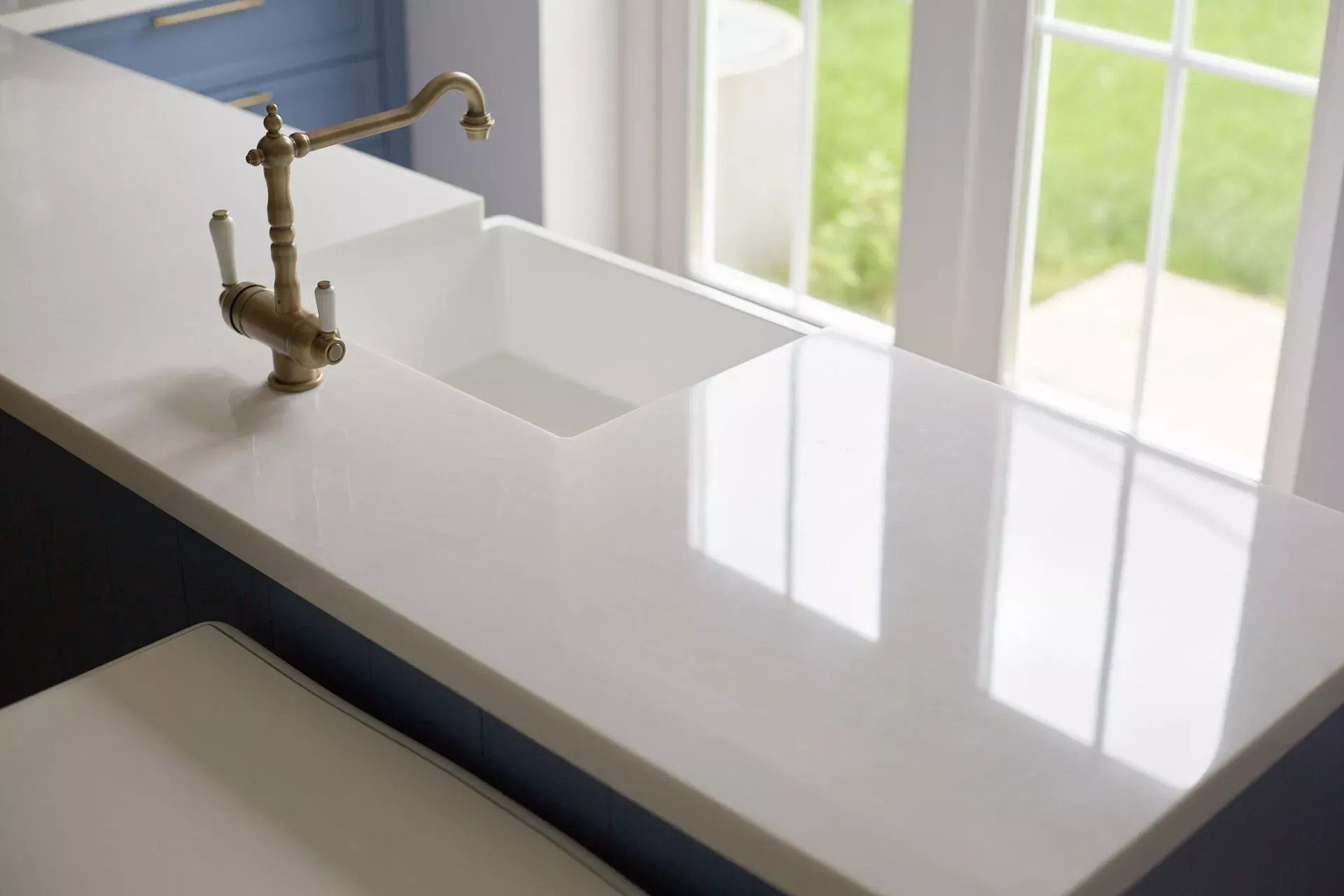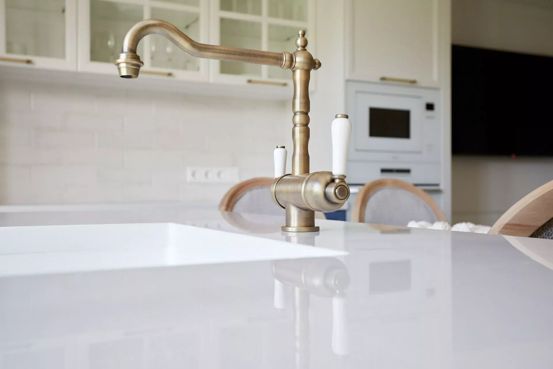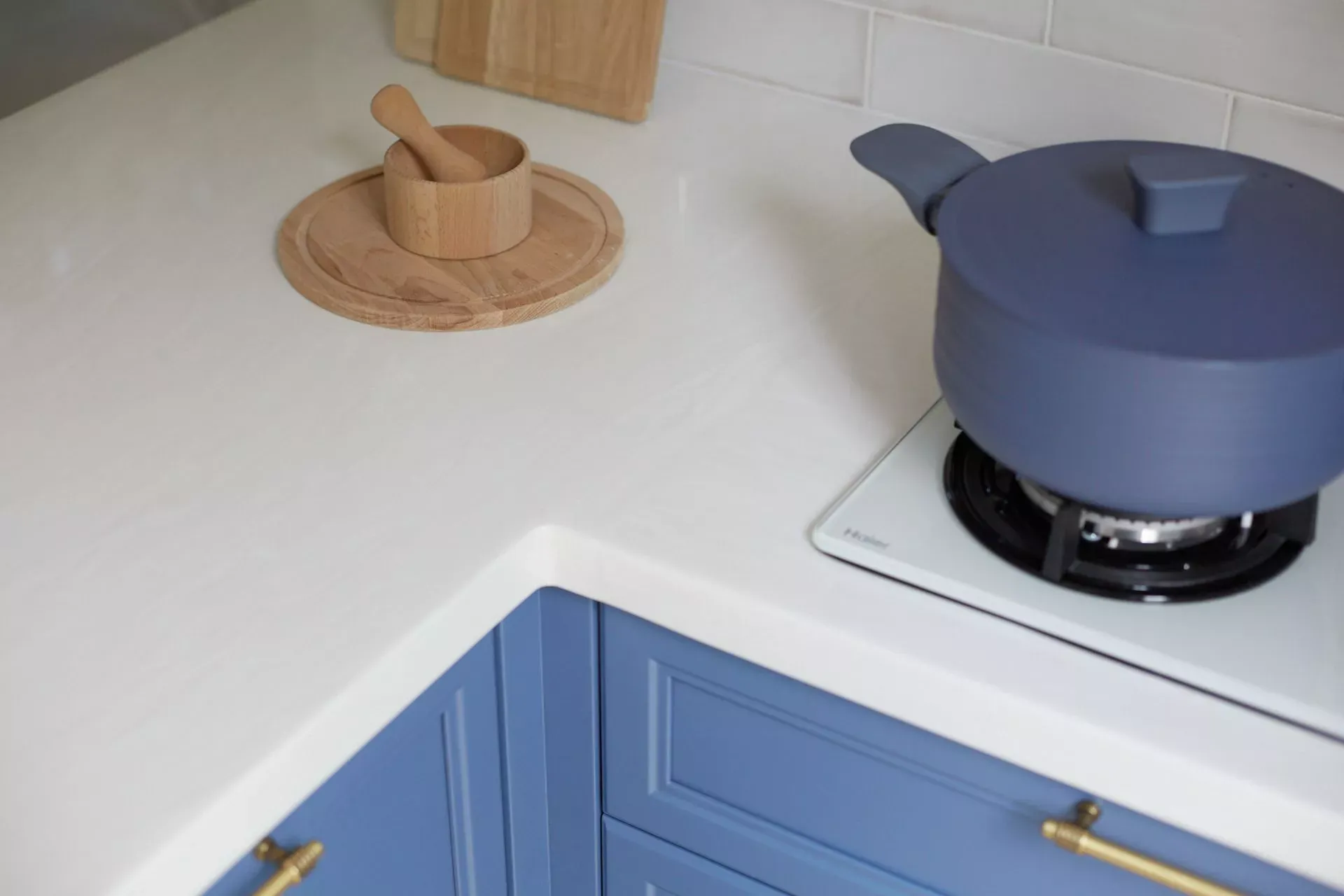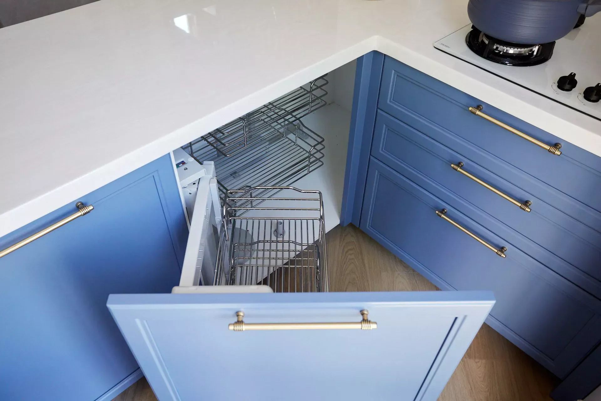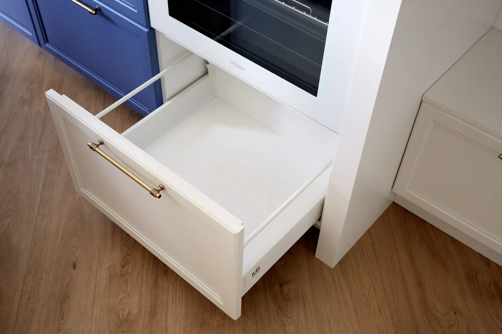 Кухня-гостиная в доме наших героев разделена на две зоны, объединенные общим стилем – Неоклассикой, фасадами серии «Урбан» и эмалью в белом и голубом.