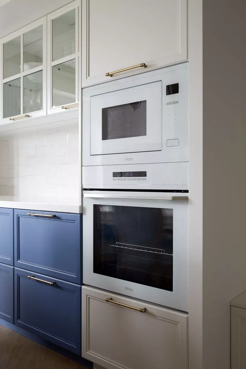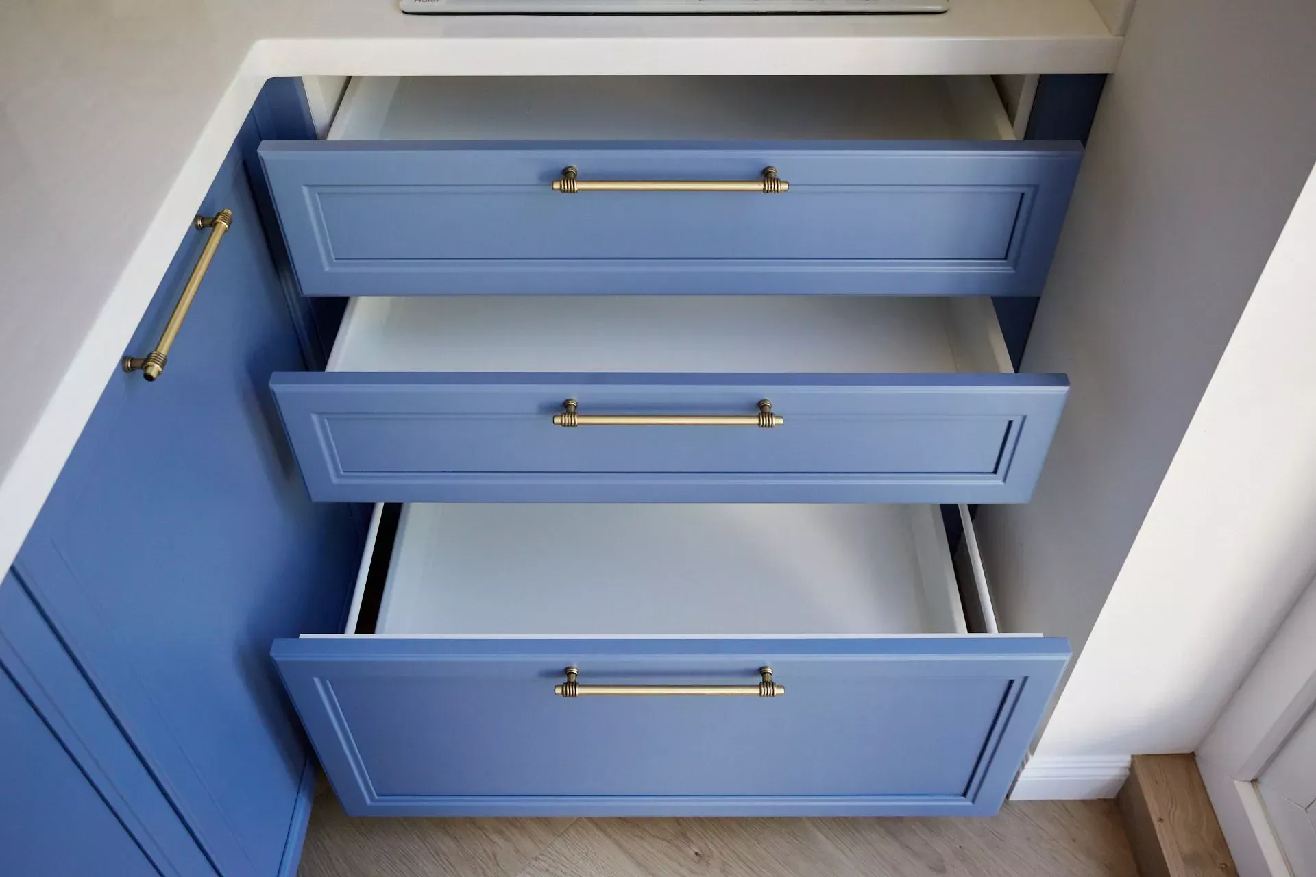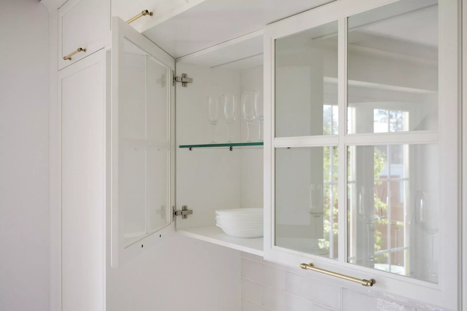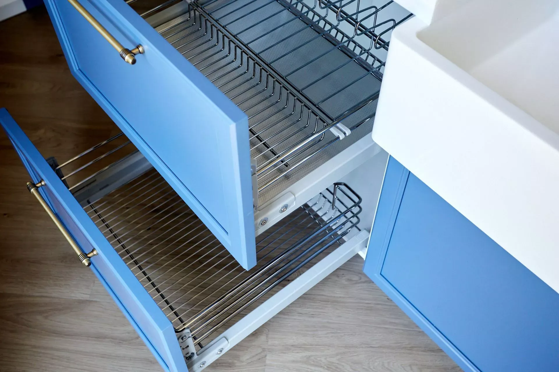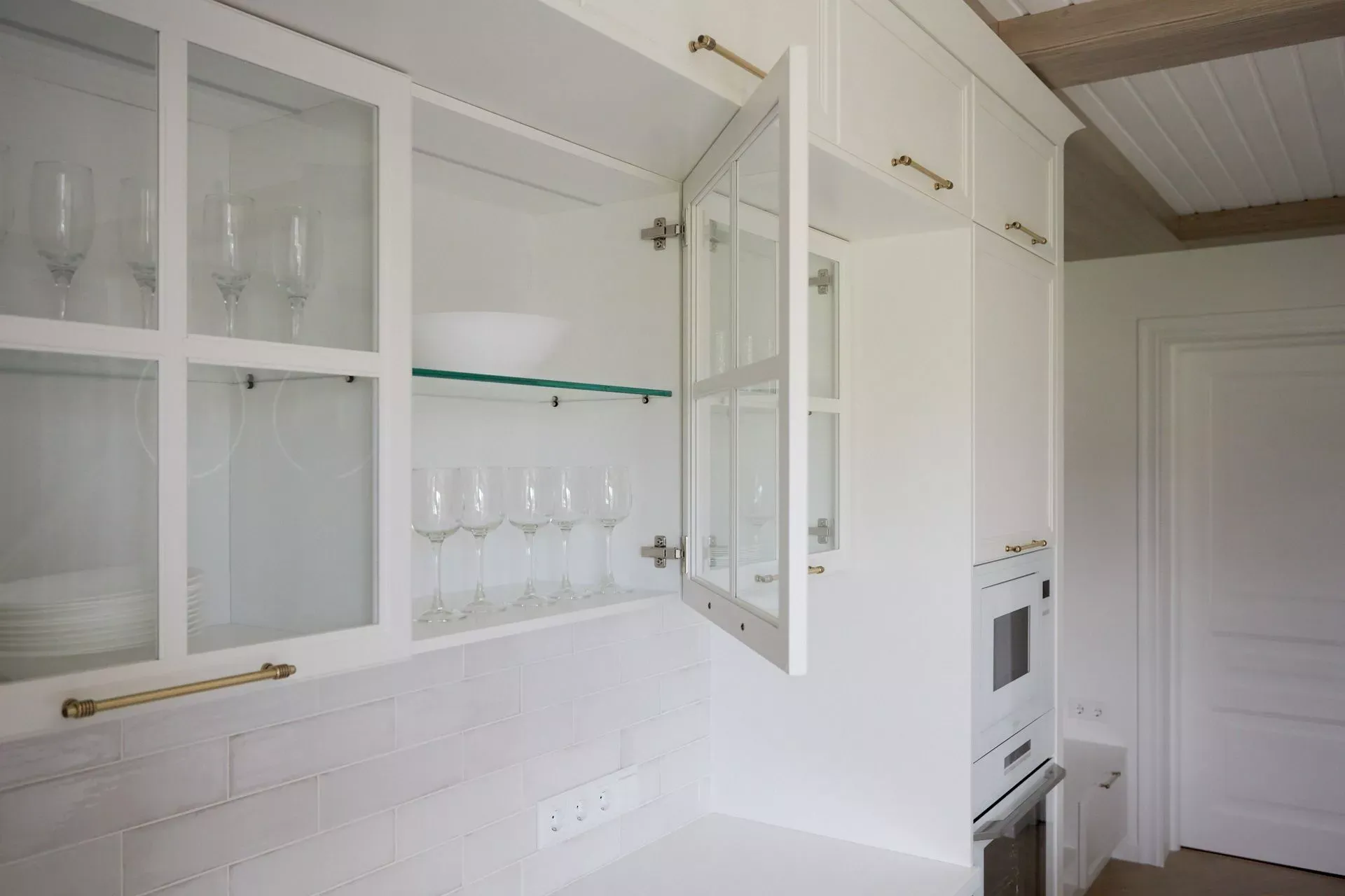 Кухня-гостиная в доме наших героев разделена на две зоны, объединенные общим стилем – Неоклассикой, фасадами серии «Урбан» и эмалью в белом и голубом.