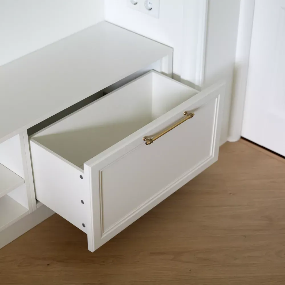 Единство стиля задаёт прямая композиция, которая идёт вдоль стены справа от входа в комнату. Она начинается с ТВ-зоны глубиной 44 см с настенным телевизором, под которым расположена одноярусная тумба длиной 2 метра с двумя закрытыми и одной открытой секциями для техники и хранения.