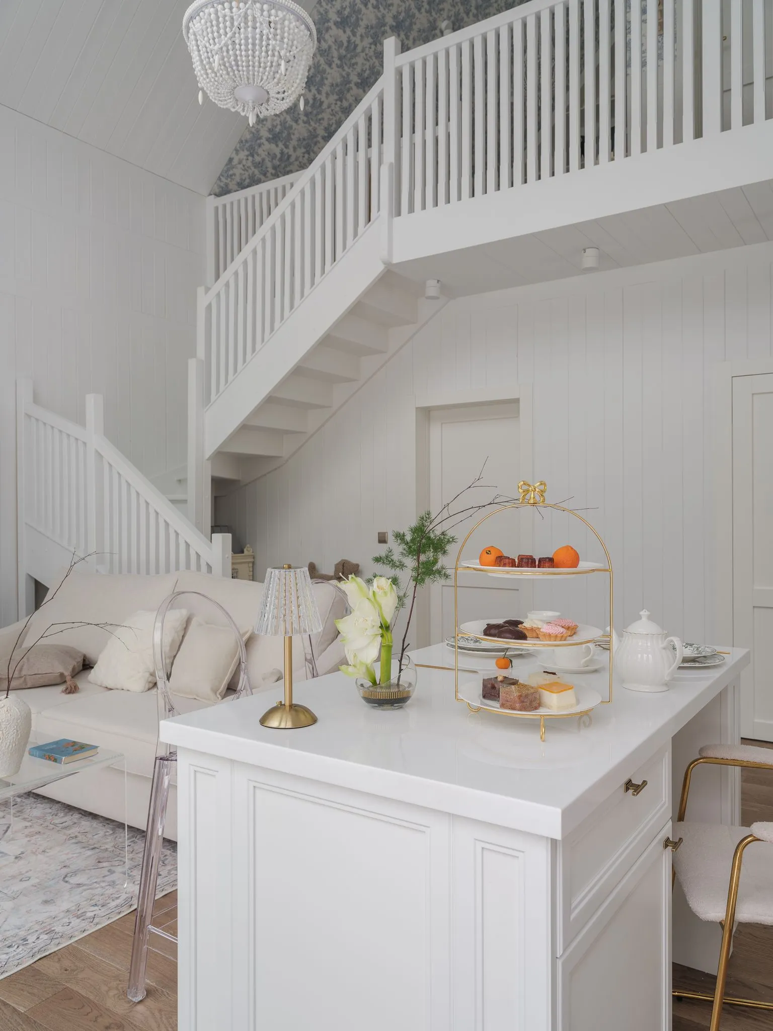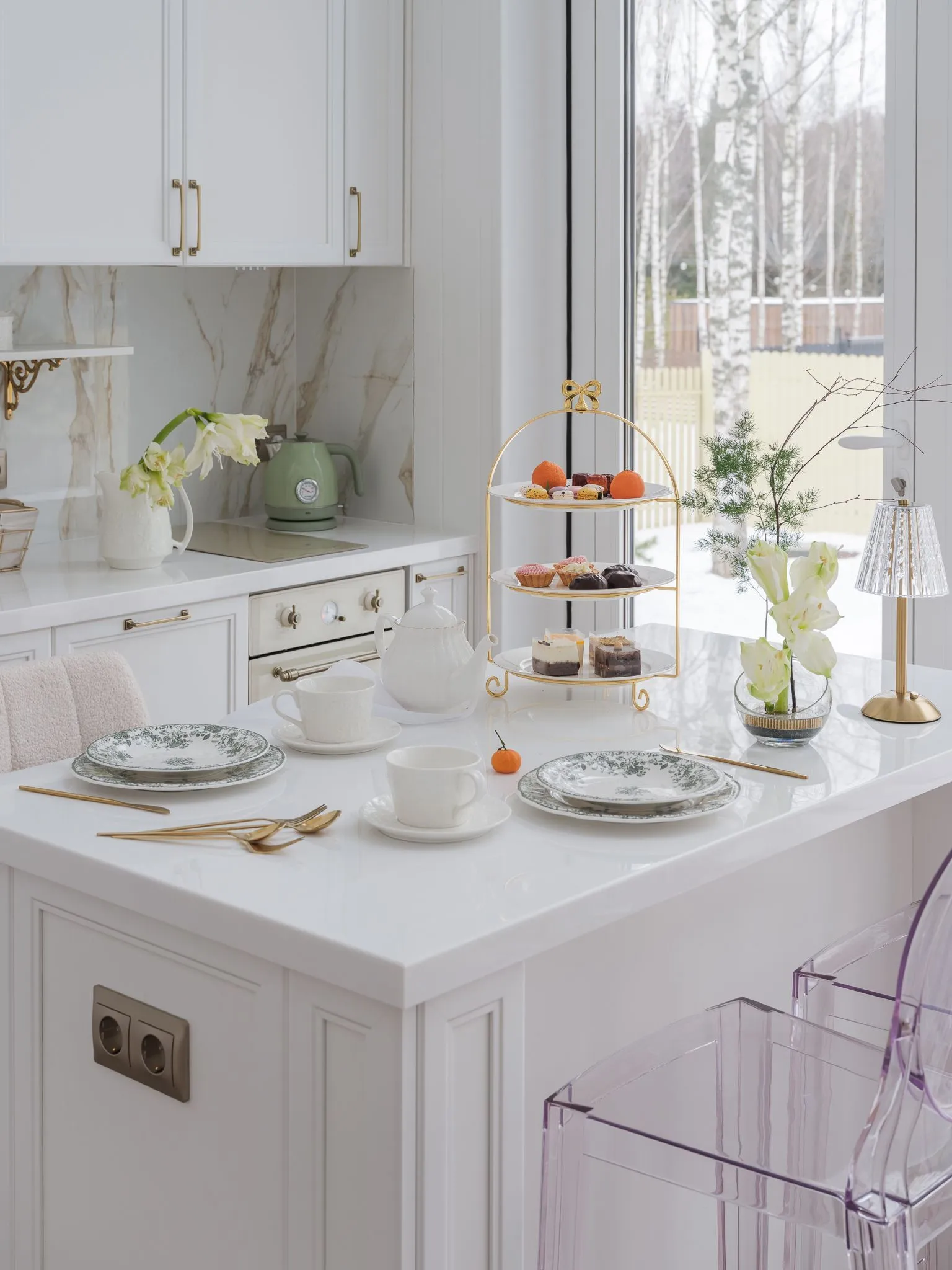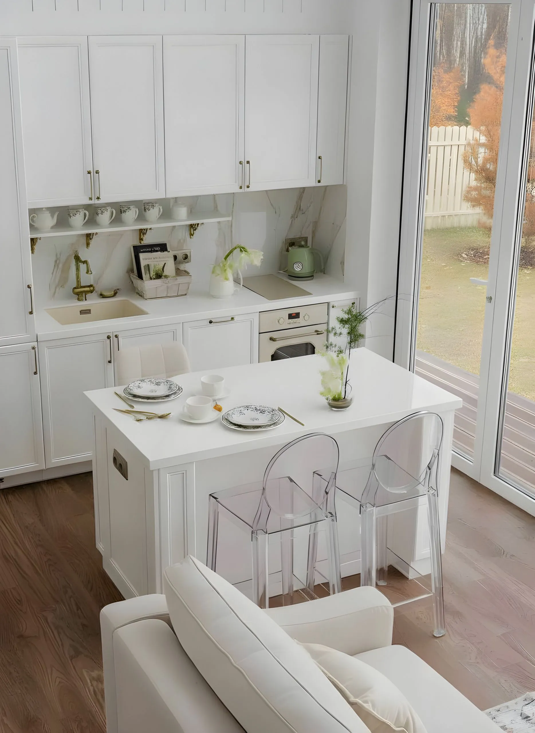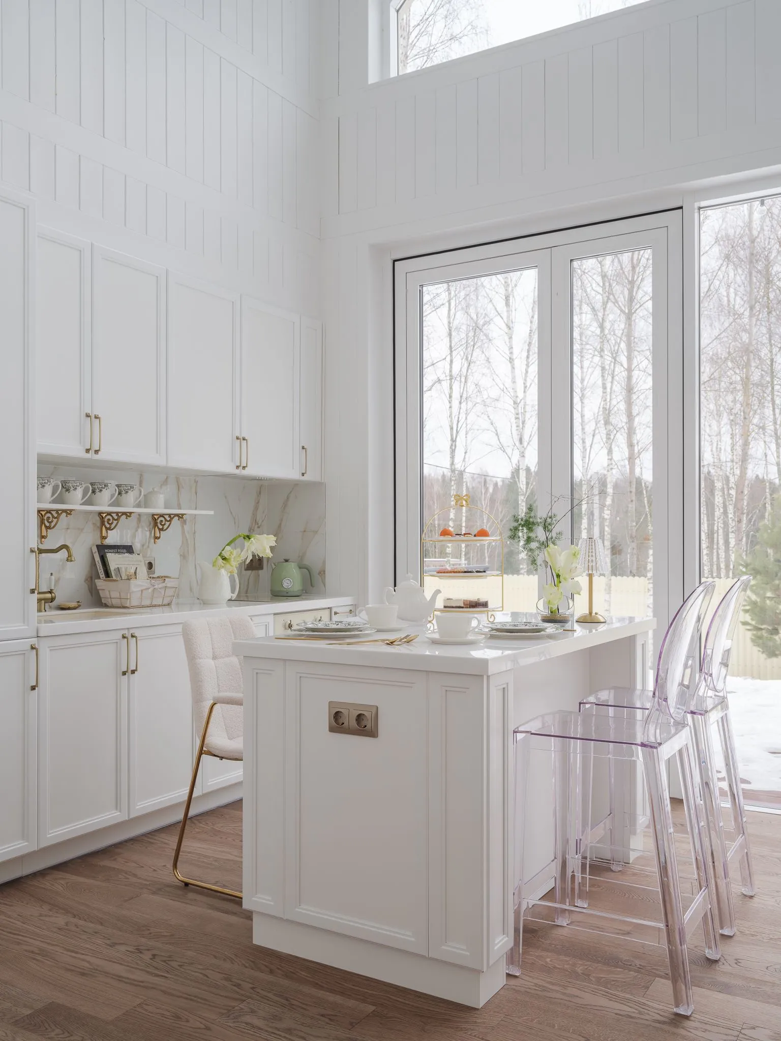 Для этого пространства мы создали две ключевые кухни из коллекции Urban, где функциональность и эстетика идут рука об руку. Особое внимание было уделено деталям, продиктованным образом жизни заказчицы. Например, специально спроектированная ниша позволяет, не вставая со стула, легко дотянуться до необходимой утвари, превращая процесс готовки в более комфортный ритуал. Открытые полки в английском стиле служат не только для хранения изысканного фарфора, но и становятся важным декоративным элементом, подчёркивающим общую тёплую эстетику.
