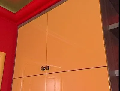 Распашные фасады шкафов выполнены в высокоглянцевой эмали «Апельсин». Внутри каждого из шкафов расположено вешало «Про-люкс» (в одном – во всю ширину шкафа, в другом – в половину) и полки для хранения различных вещей.