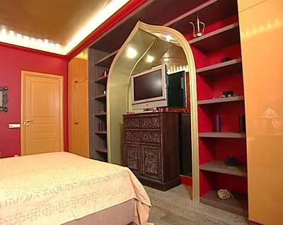 Вдоль самой большой стены комнаты располагается встроенная мебель – два платяных шкафа и система открытых полок. Шкафы расположены симметрично по краям, а полки обрамляют арку в центре композиции.