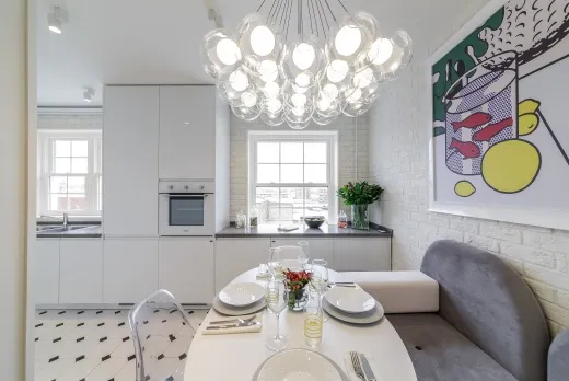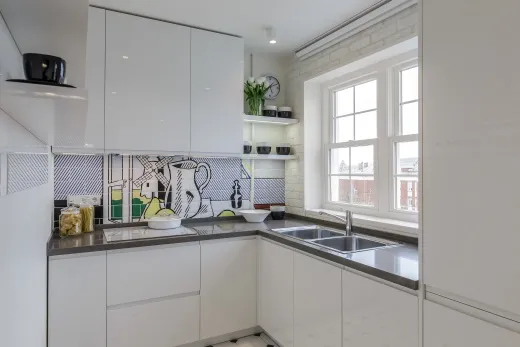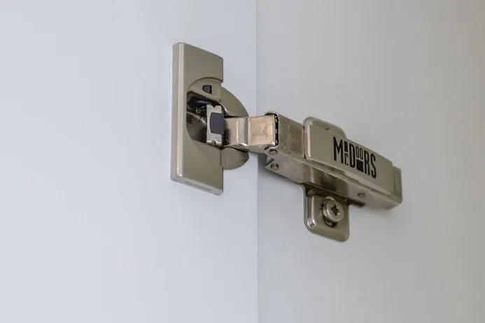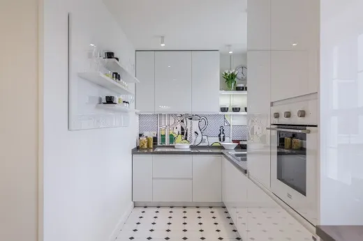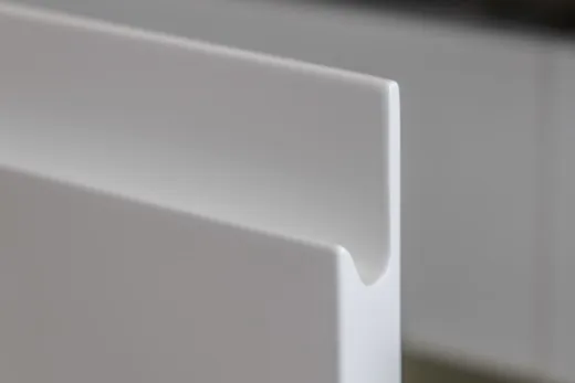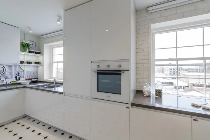 Все использованные в проекте фасады по типологии называются Джей (от англ. J – именно в форме этой буквы сделан фигурный вырез в верхнем торце, за который удобно захватывать и открывать панель). Вся мебель выполнена из МДФ в белой глянцевой эмали.